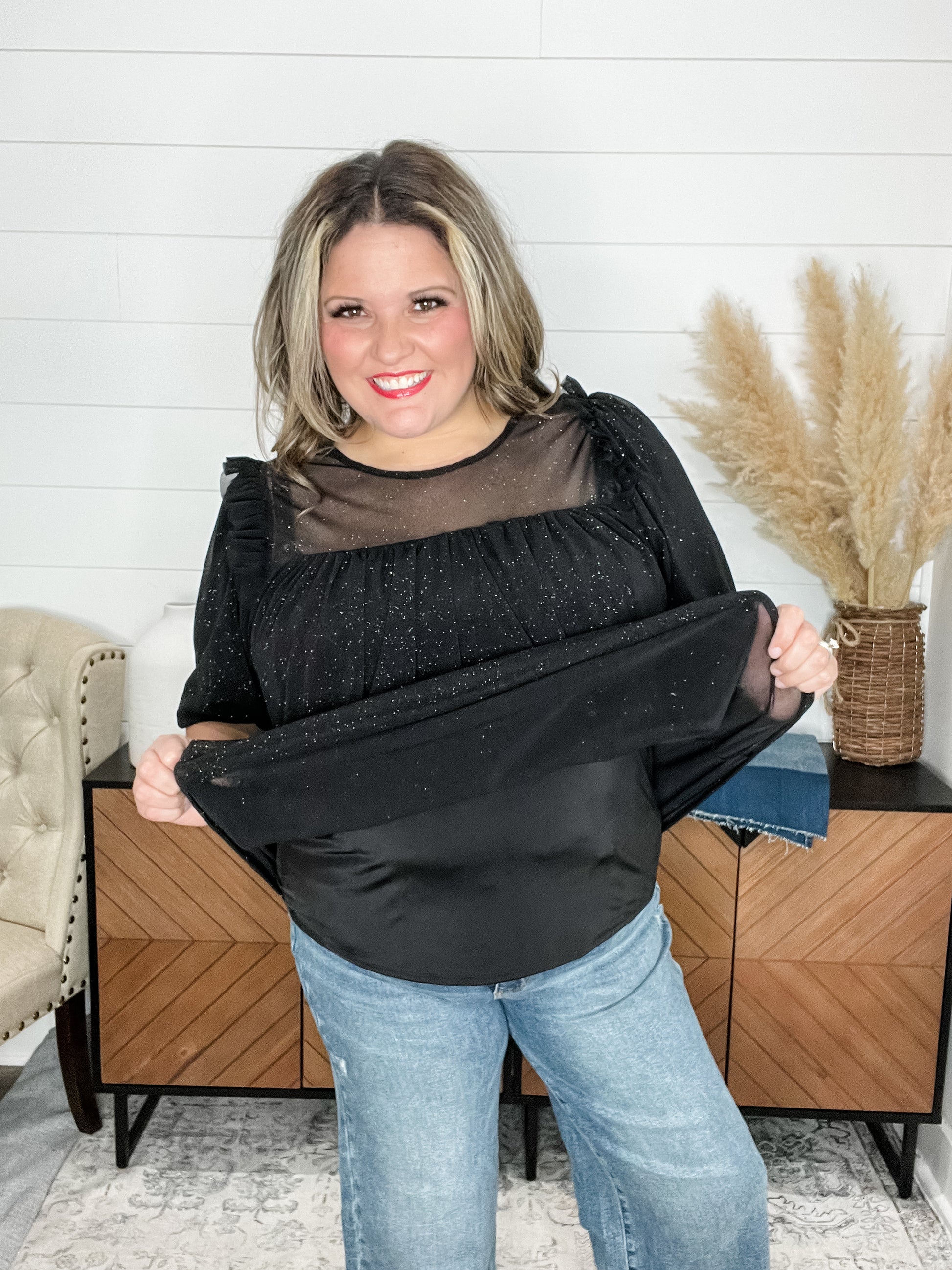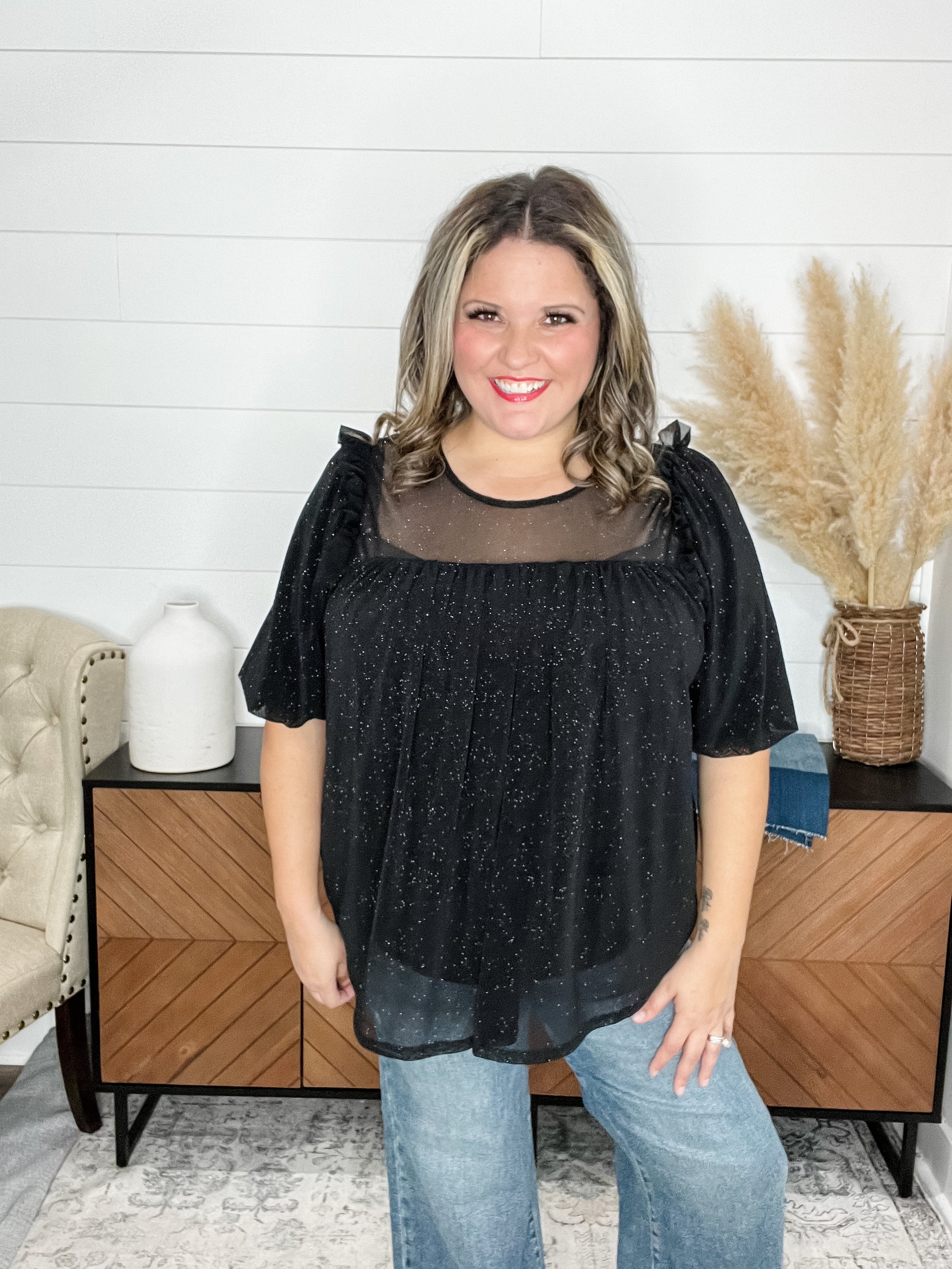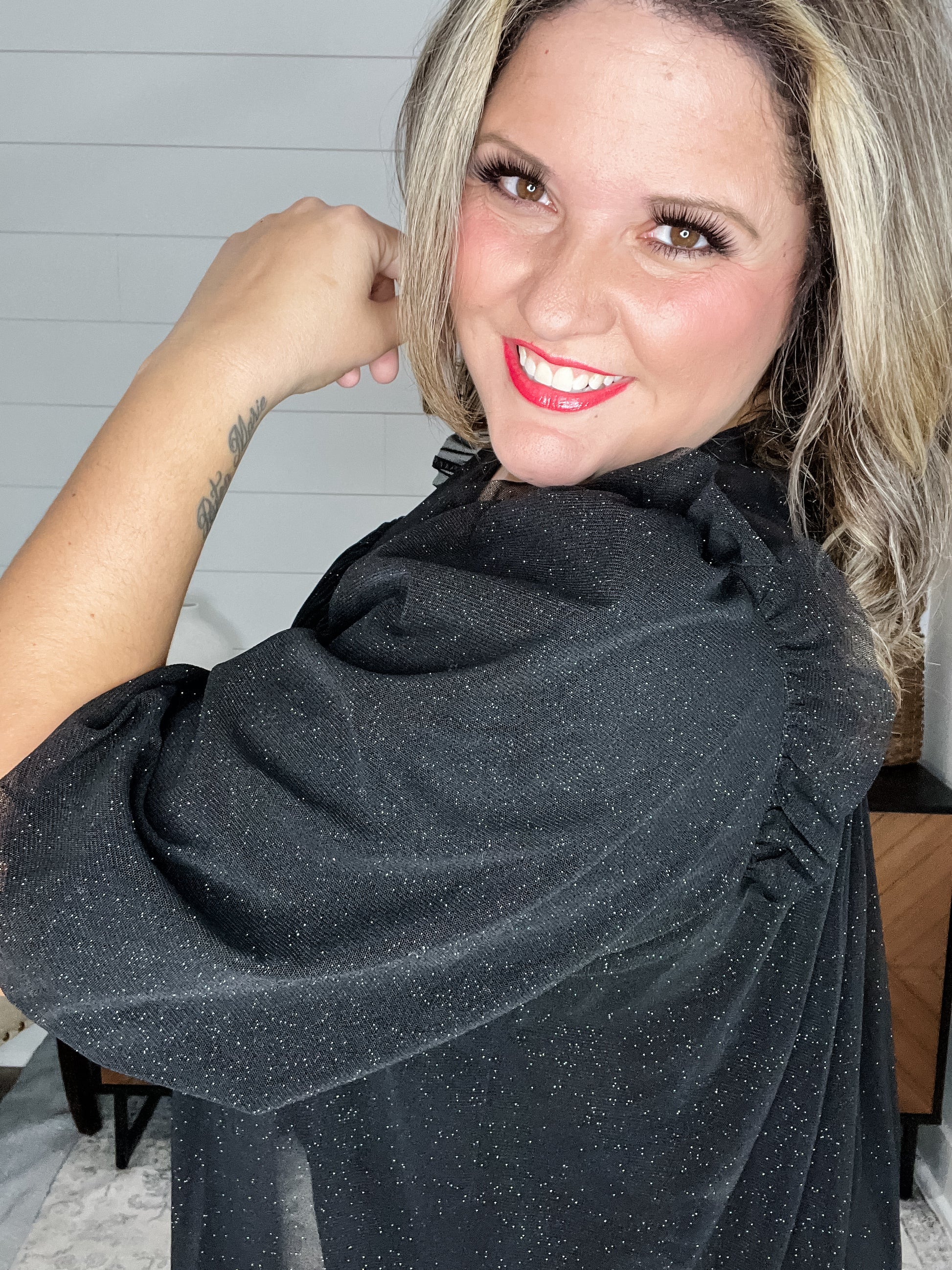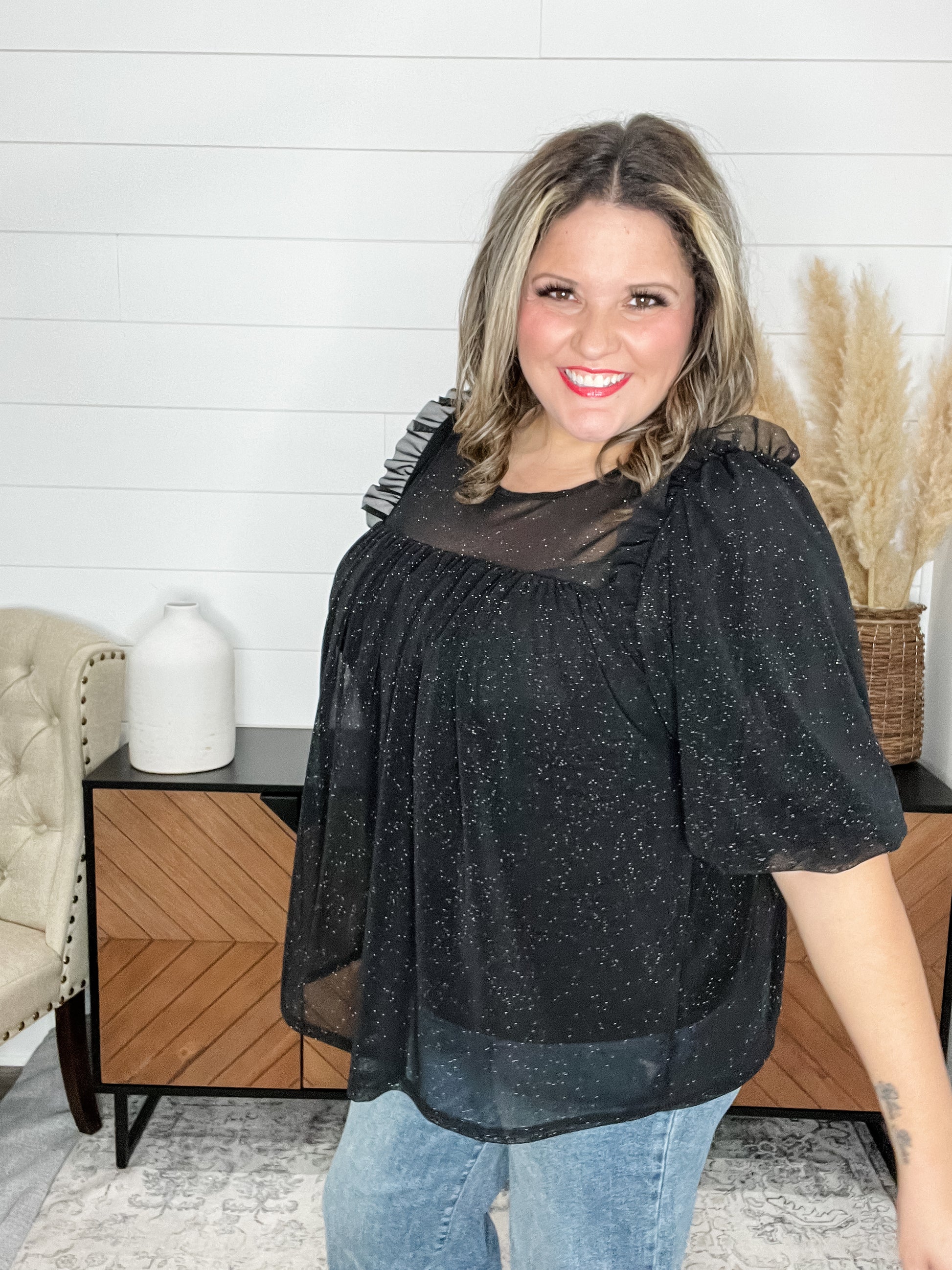 The "Ophelia" Sparkle Tulle Bubble Sleeve top fits true to size and features a delicate lining for comfort. With a hint of stretch, it moves gracefully with you, adding a playful bounce to your look. Perfect for twirling moments and sparkling nights!
