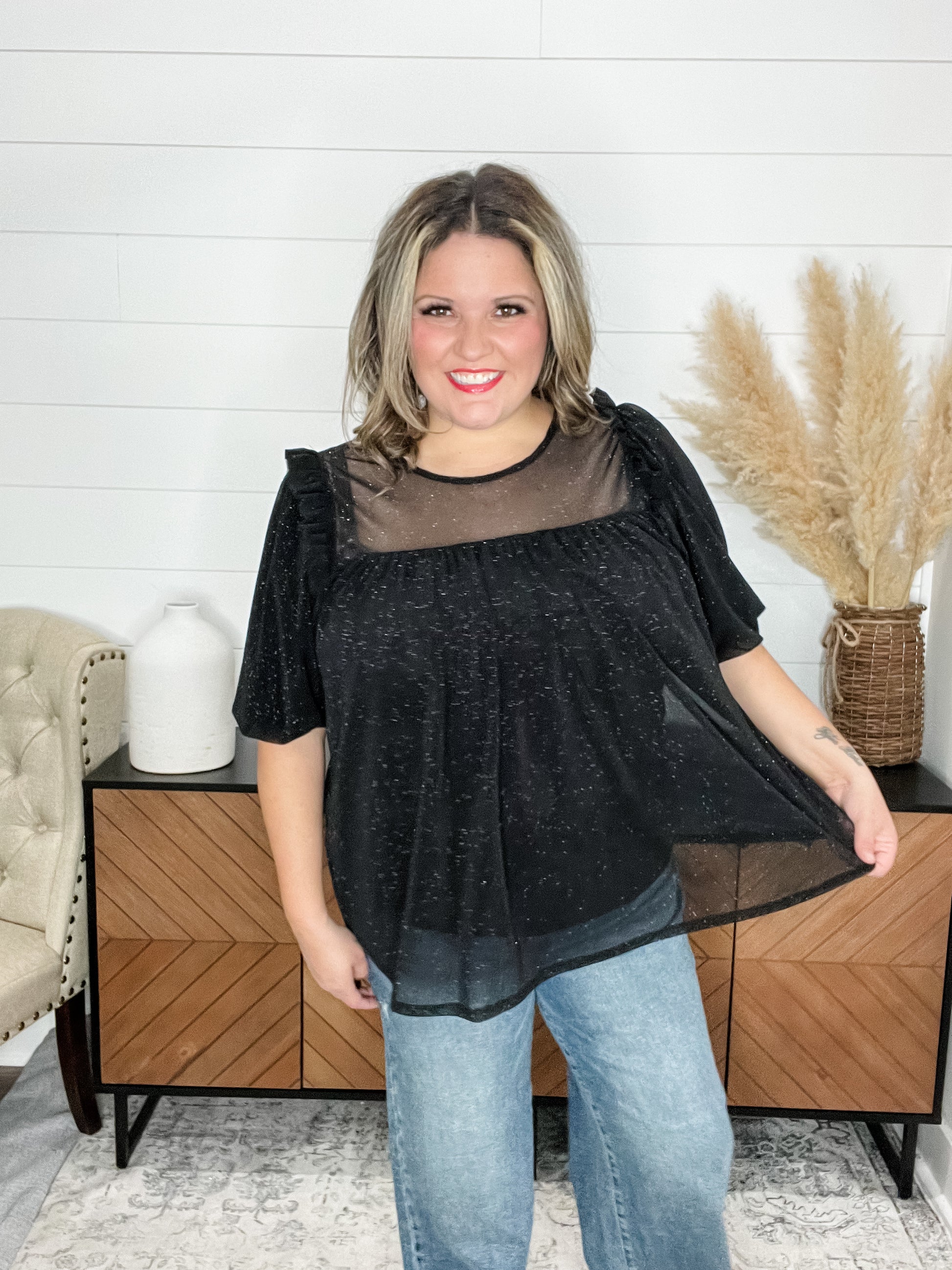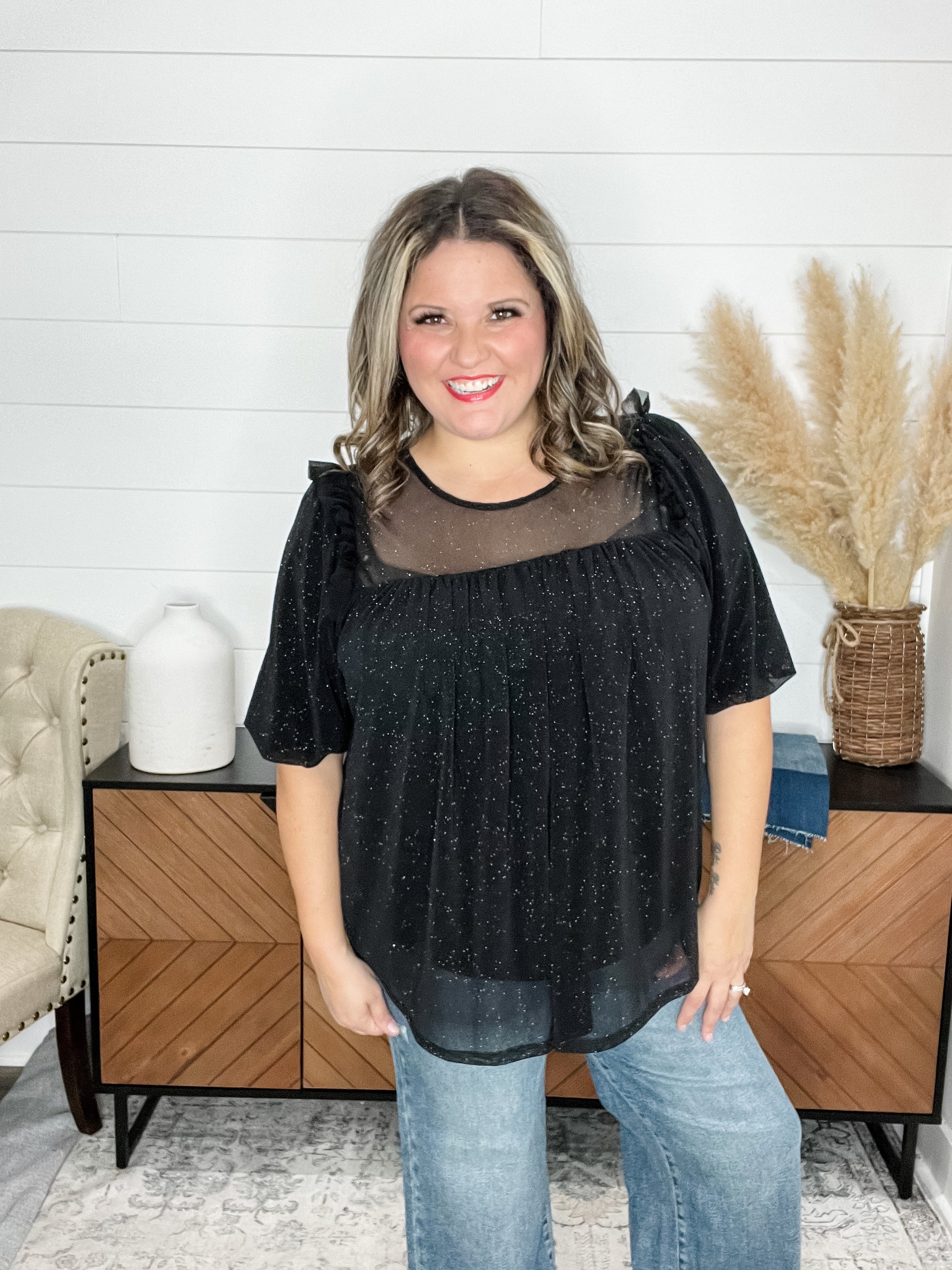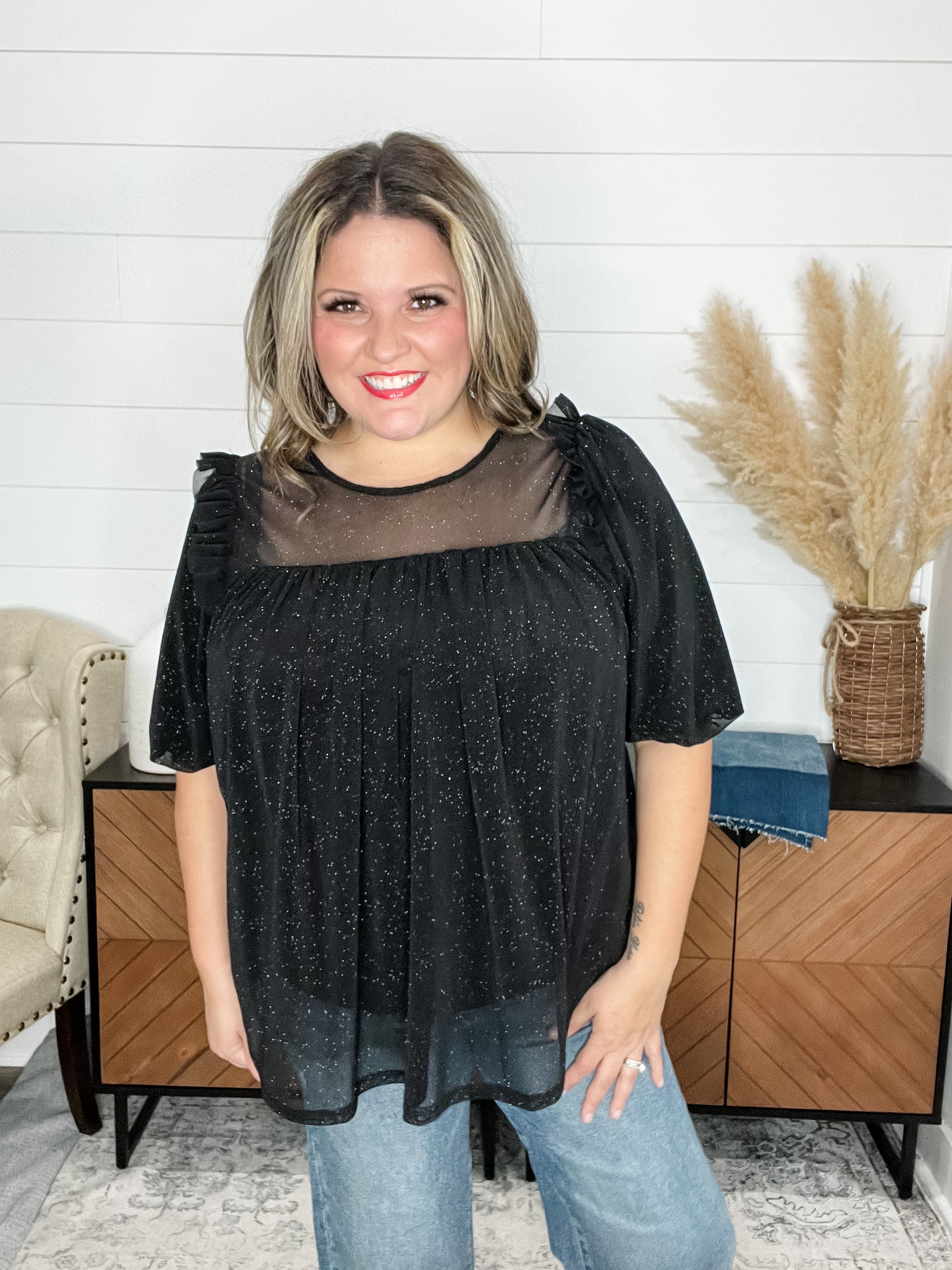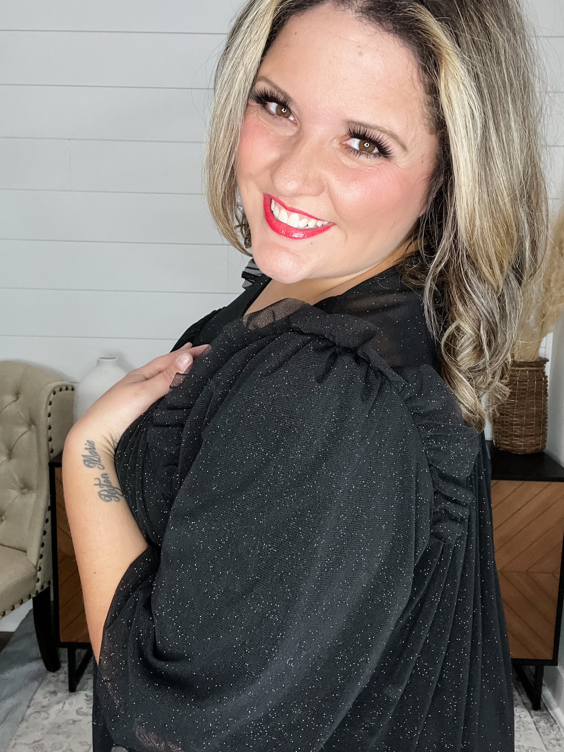 The "Ophelia" Sparkle Tulle Bubble Sleeve top fits true to size and features a delicate lining for comfort. With a hint of stretch, it moves gracefully with you, adding a playful bounce to your look. Perfect for twirling moments and sparkling nights!