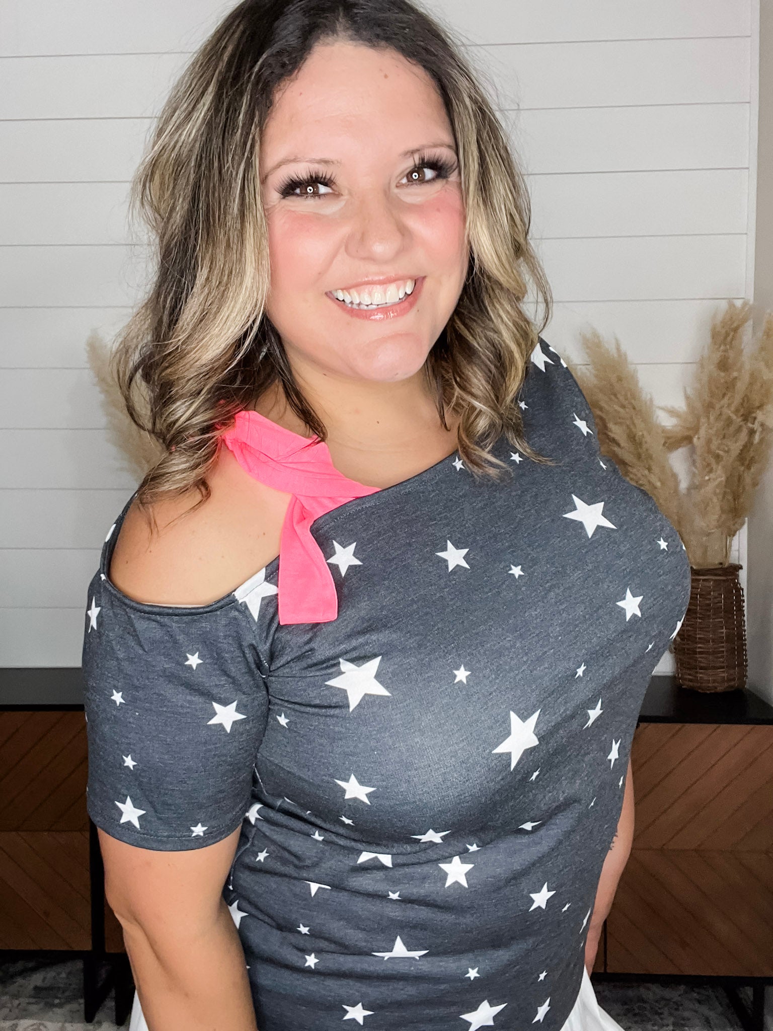 This "Orion" Shoulder Tie Detail adds a playful pop of pink to any outfit. The stars design adds a stylish touch while the shoulder tie detail provides a unique element. Update your wardrobe with this statement piece!