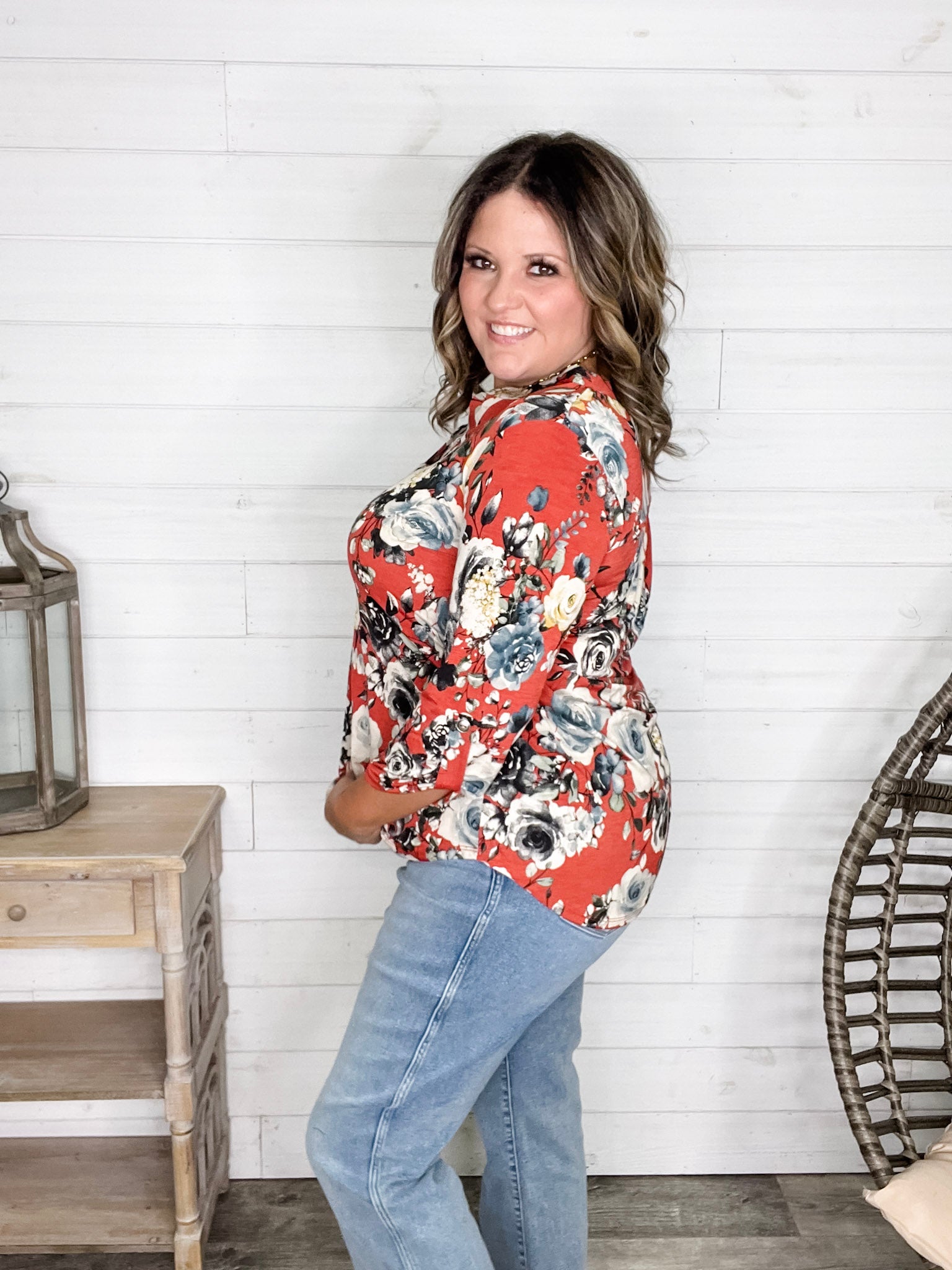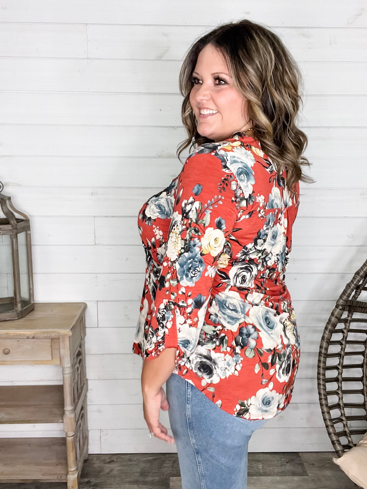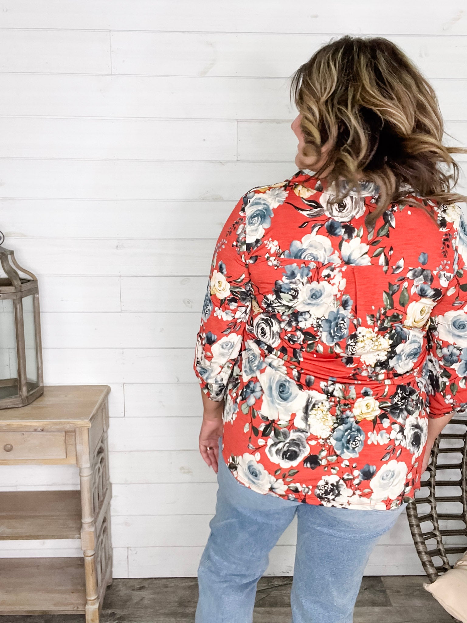 This playful "Power" Floral 3/4 Sleeve Split Neck top features a slinky, stretchy fabric that moves with you. For the perfect fit, we recommend sizing down one. Its flattering silhouette and vibrant floral design make it a fun and stylish choice for any occasion.