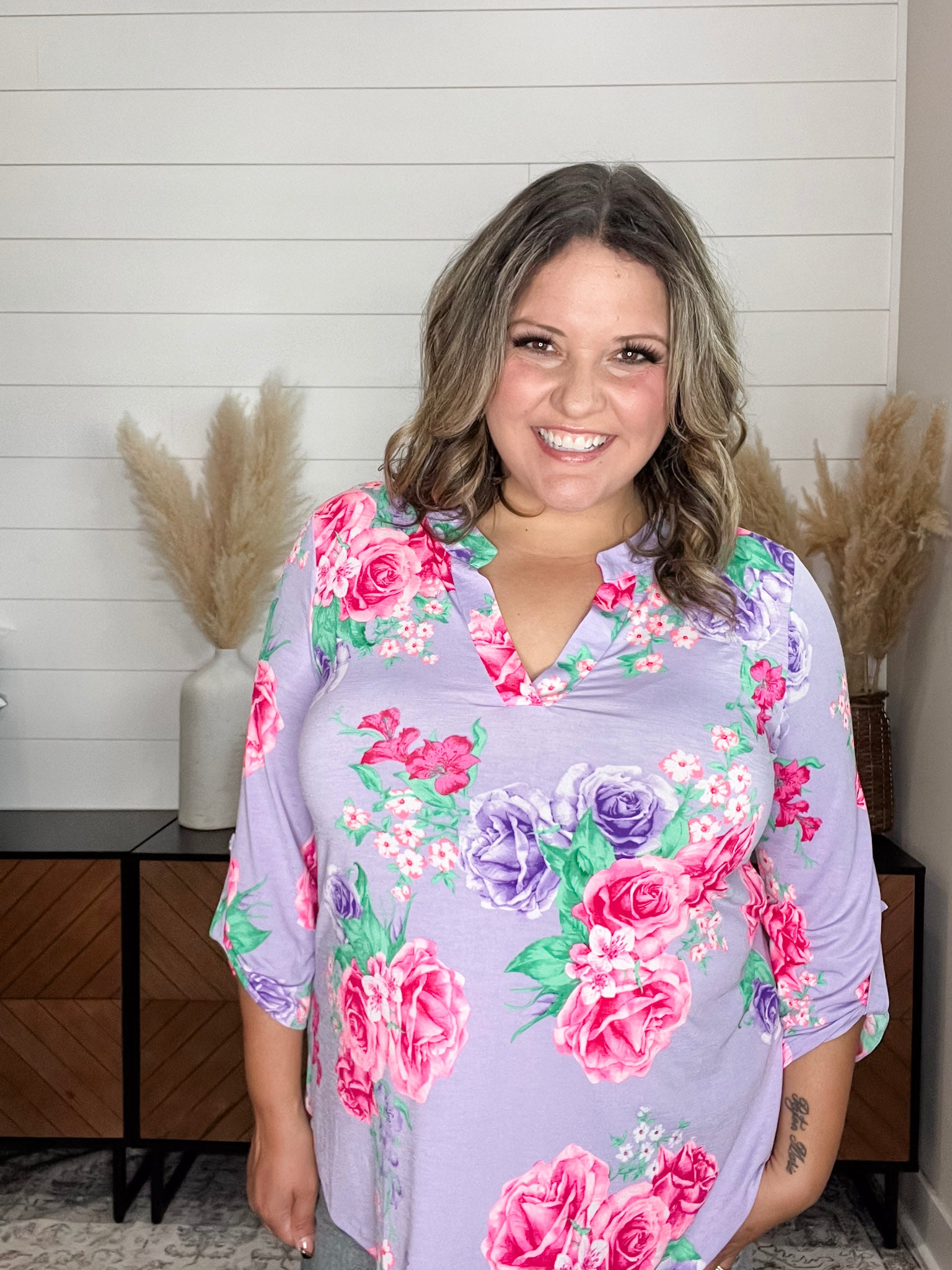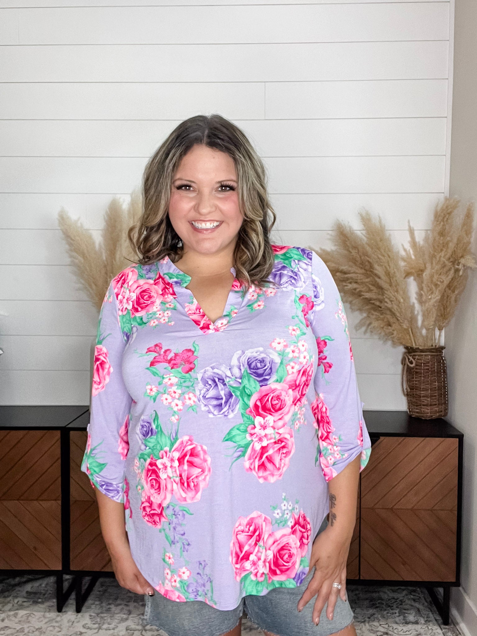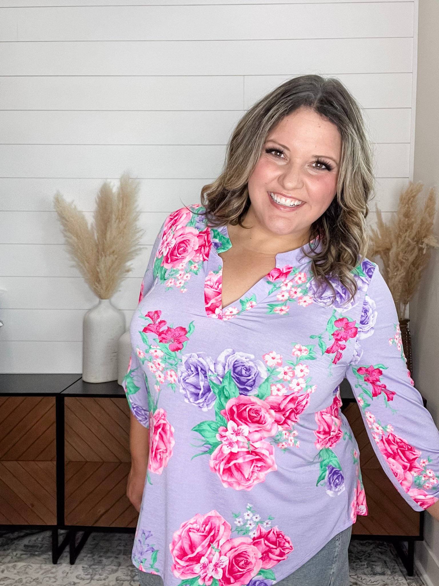 "Prelude" Floral Lizzy 3/4 Sleeve Split Neck Tops