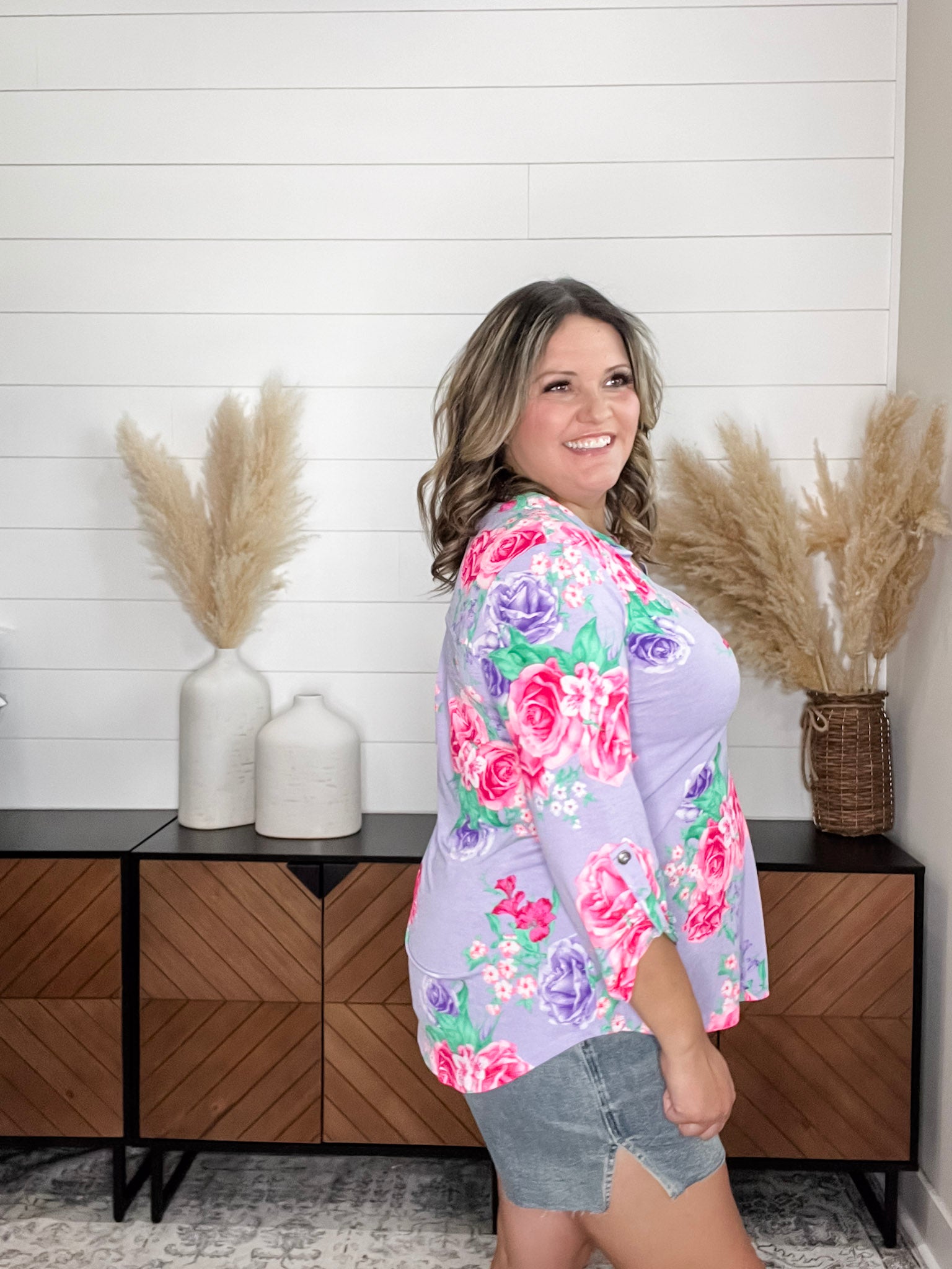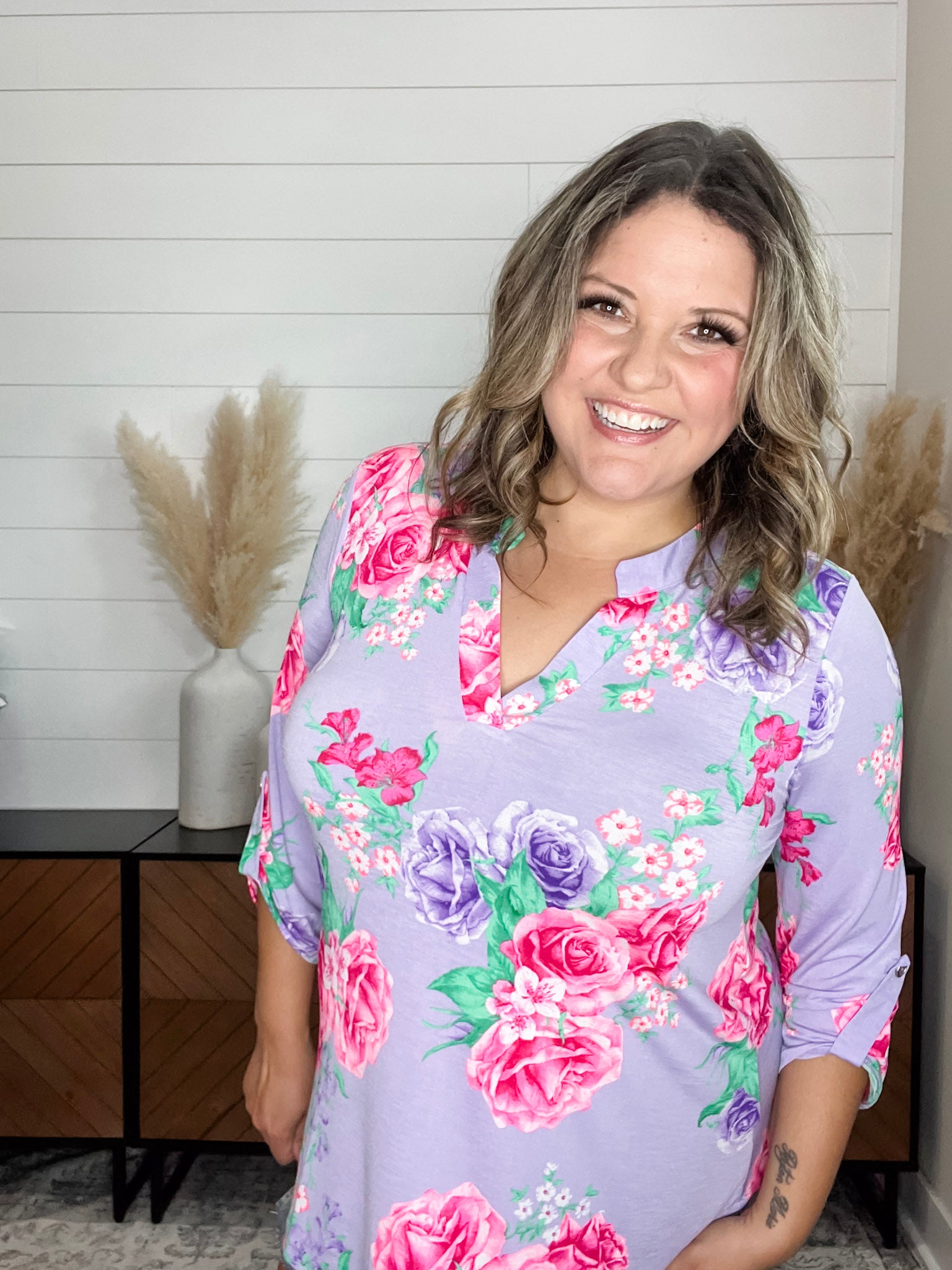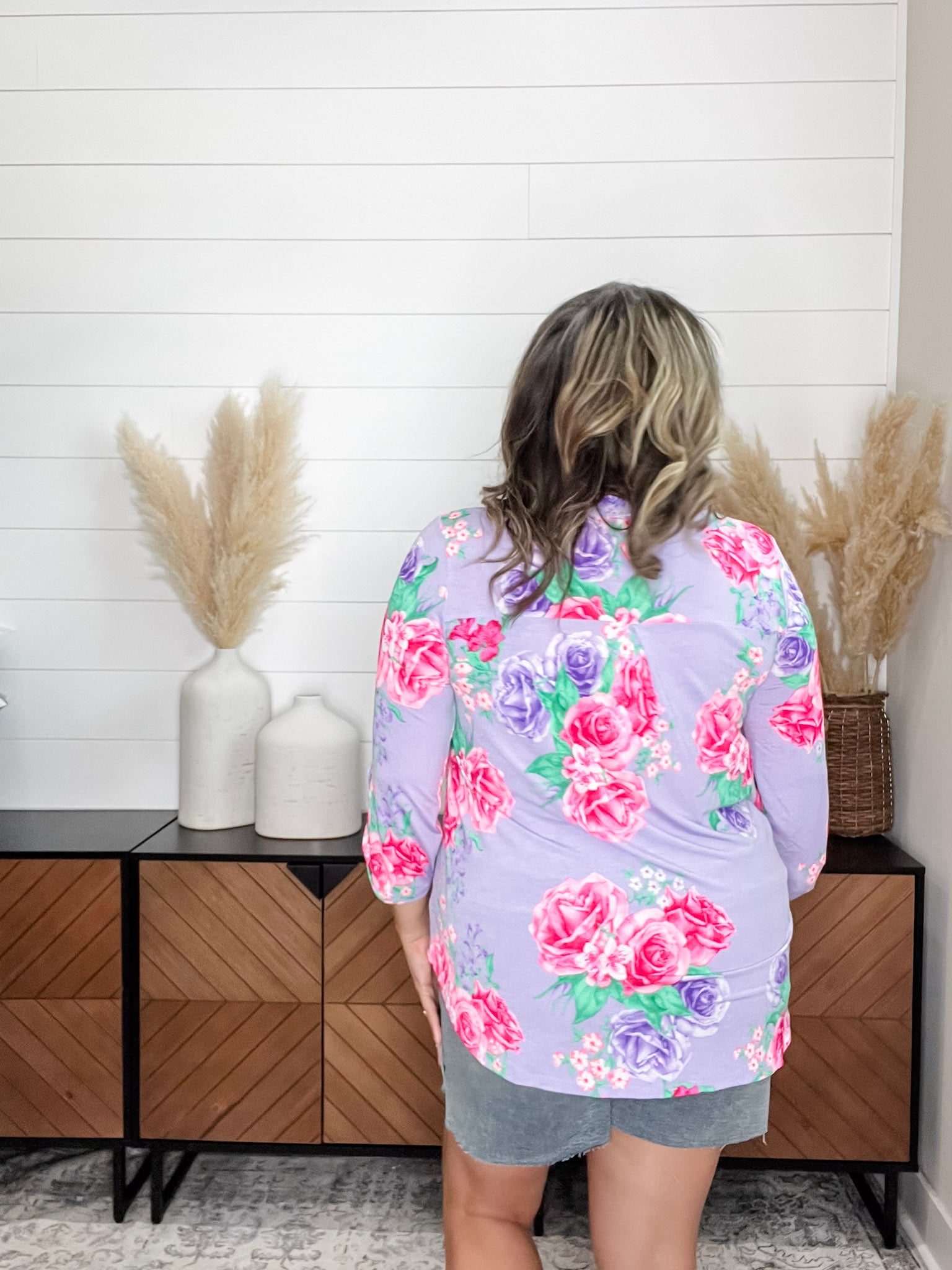 "Prelude" Floral Lizzy 3/4 Sleeve Split Neck Tops