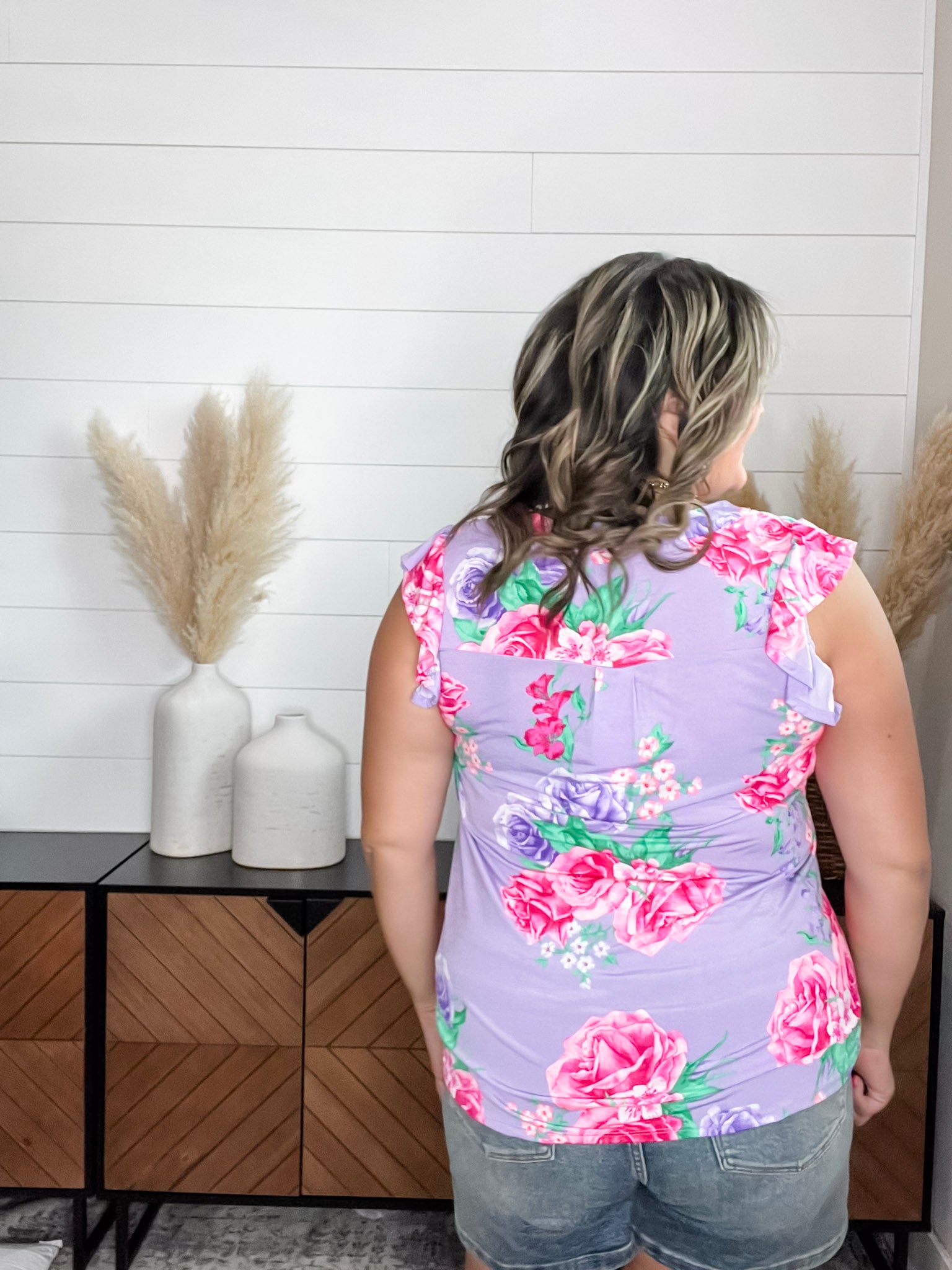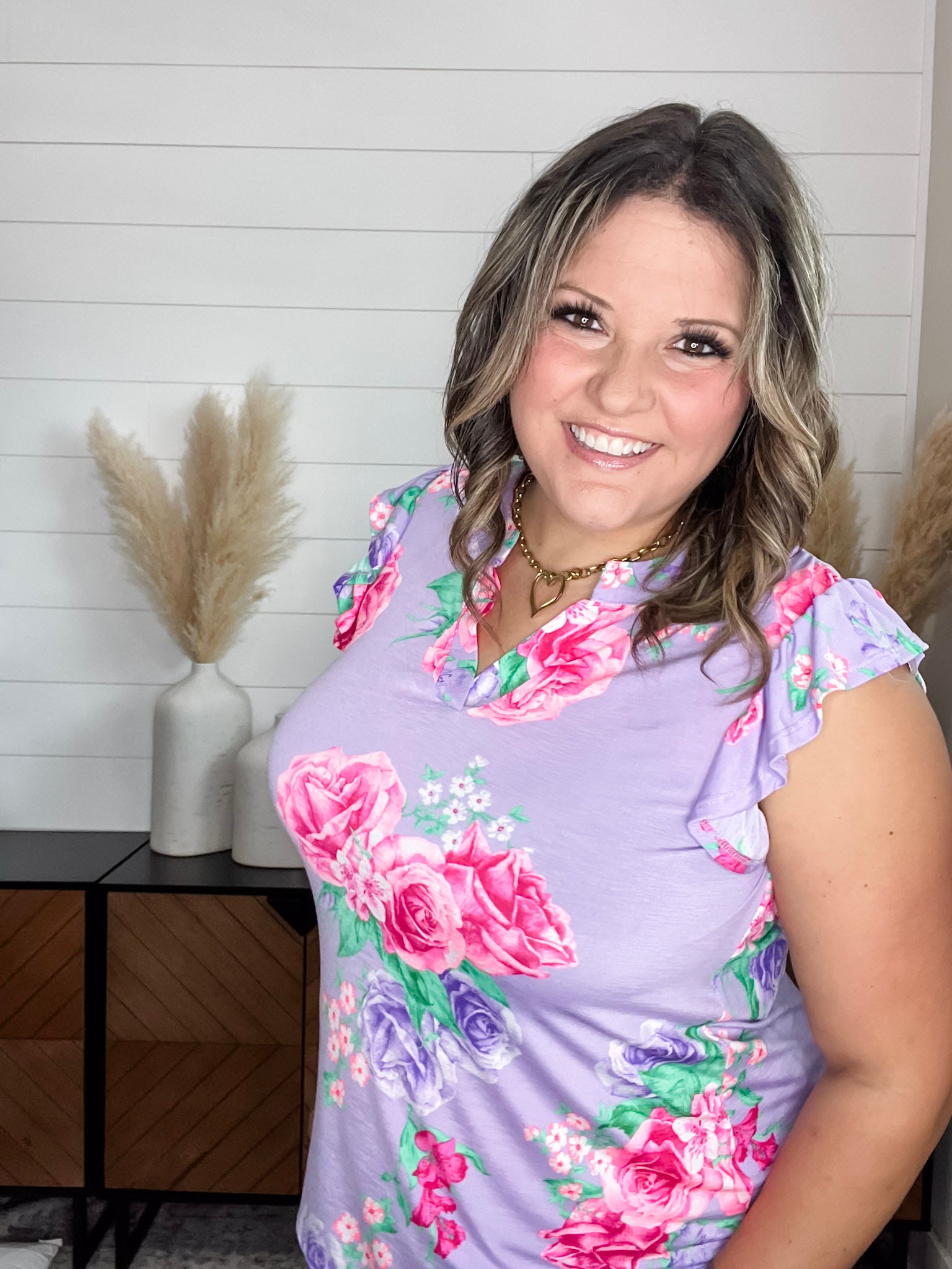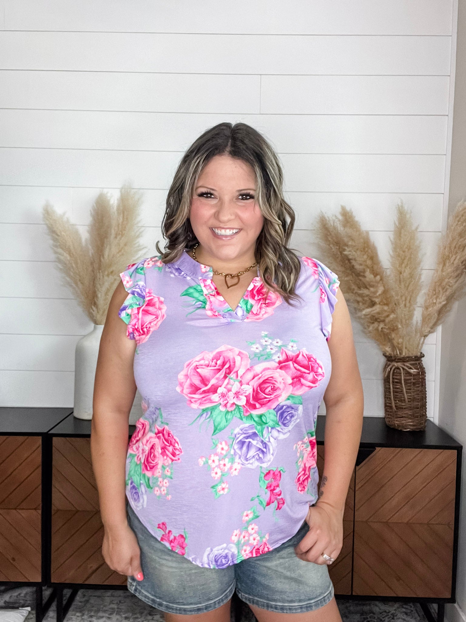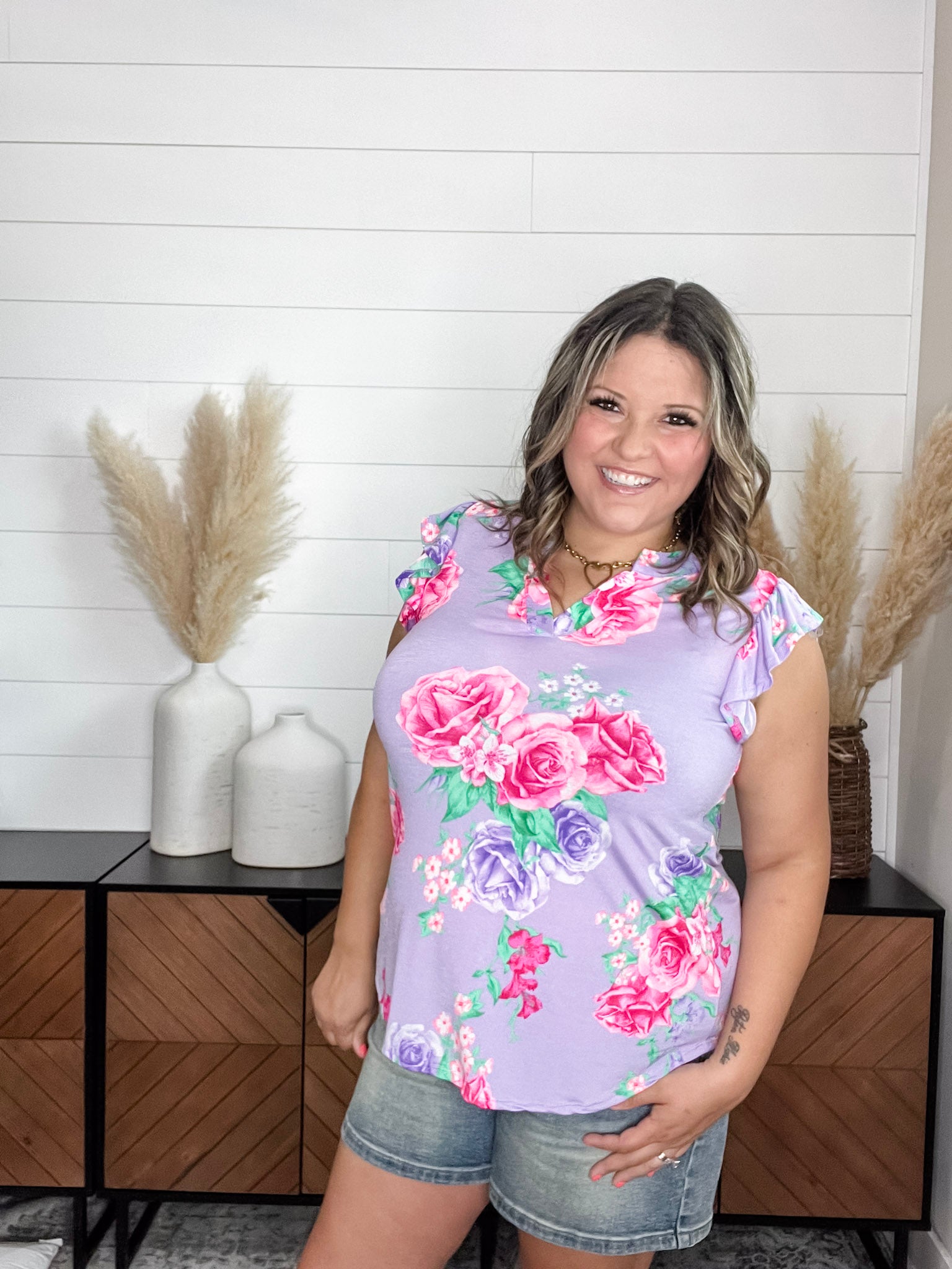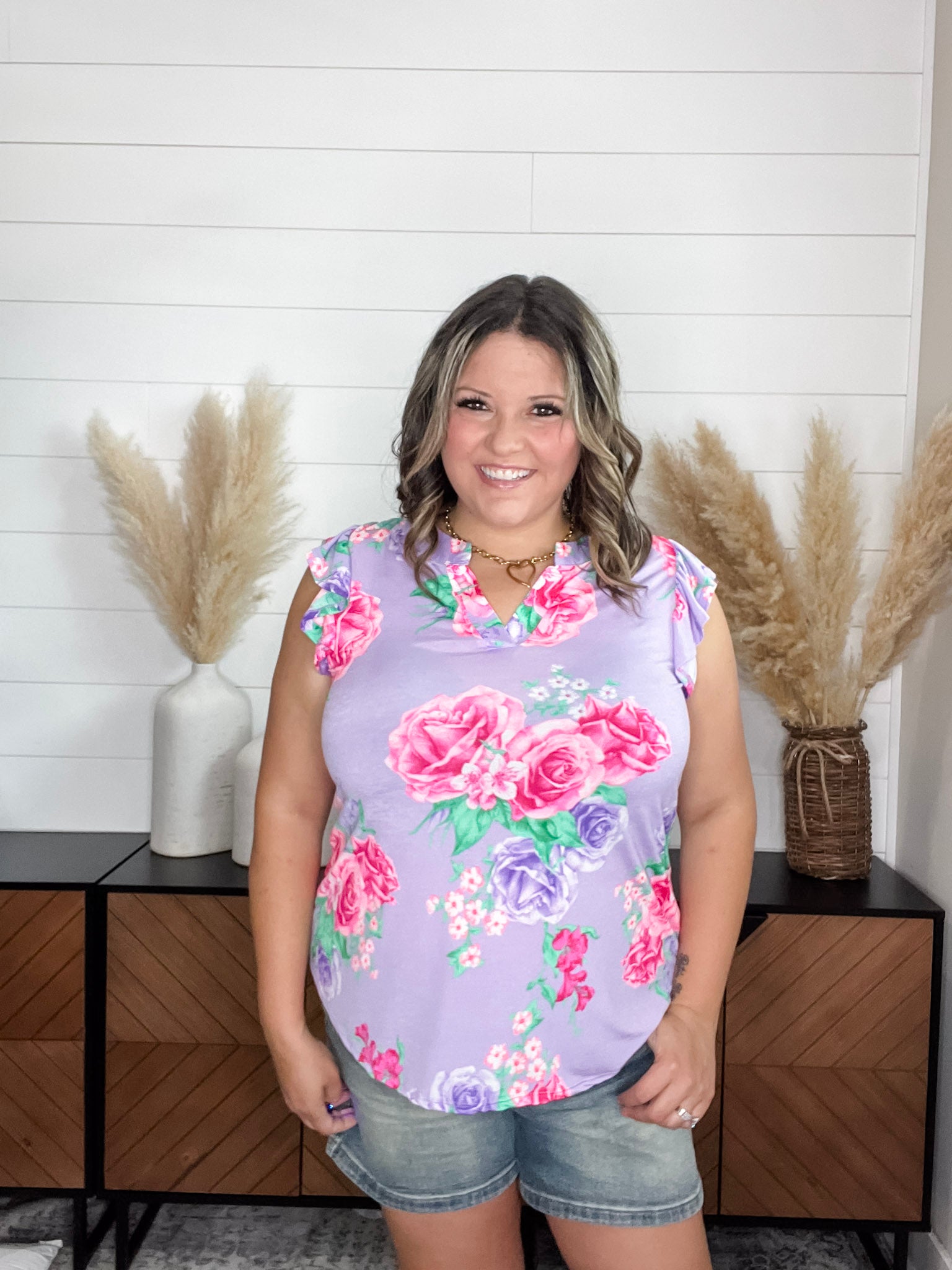 Introducing the "Prelude" Ruffle Cap Sleeve Lizzy by Dear Scarlett. Experience flutter ruffle cap sleeves, wrinkle-free fabric, and a slinky stretchy fit. True to size, this top features a gorgeous lavender base with large pink flowers. Elevate your wardrobe with this stunning and comfortable piece.