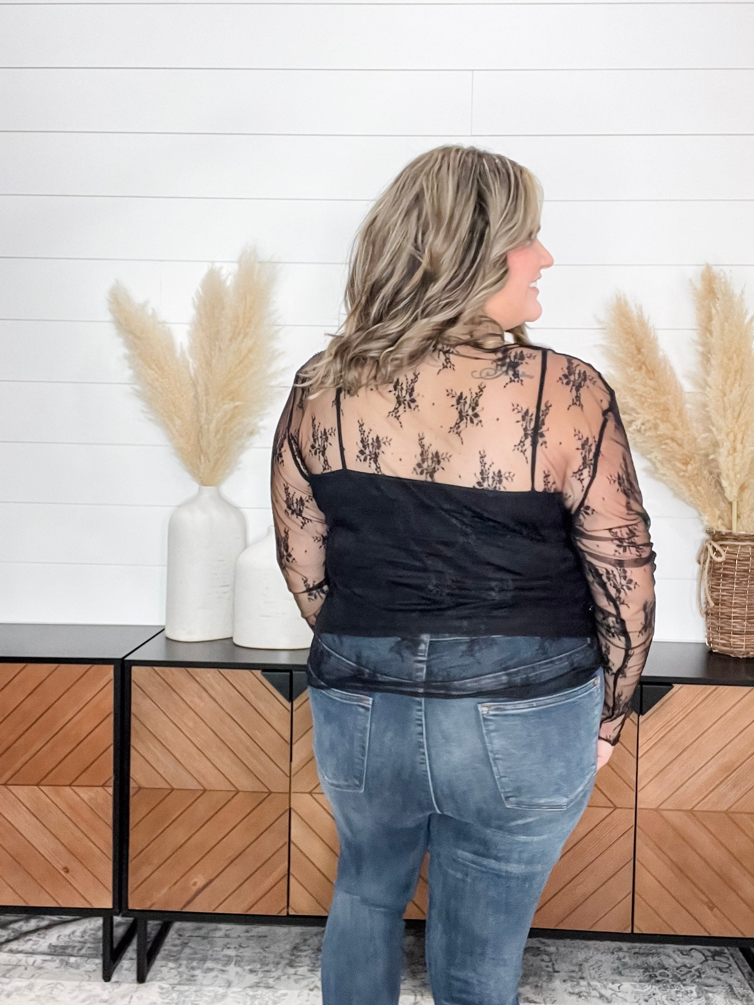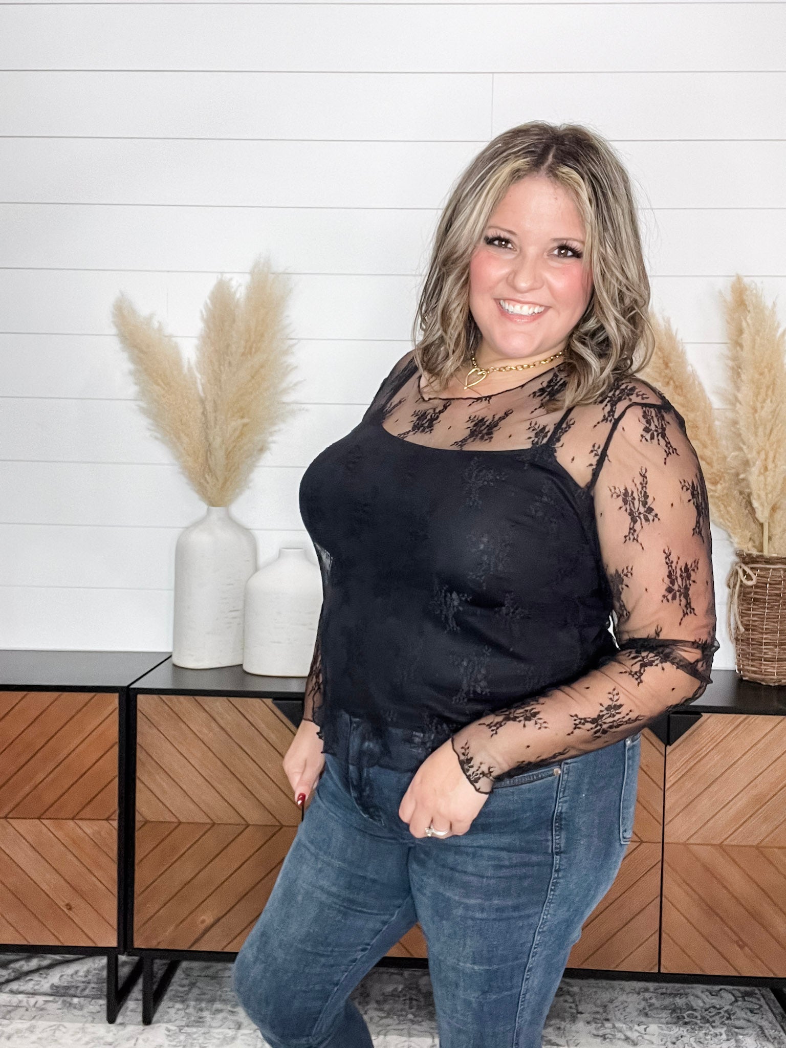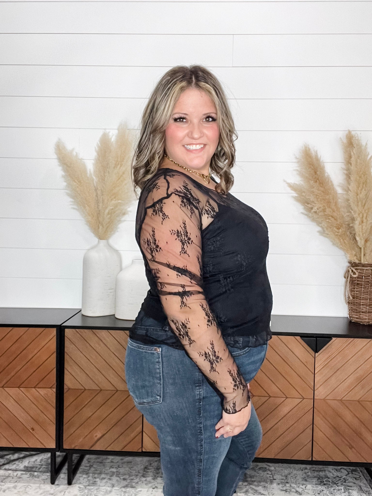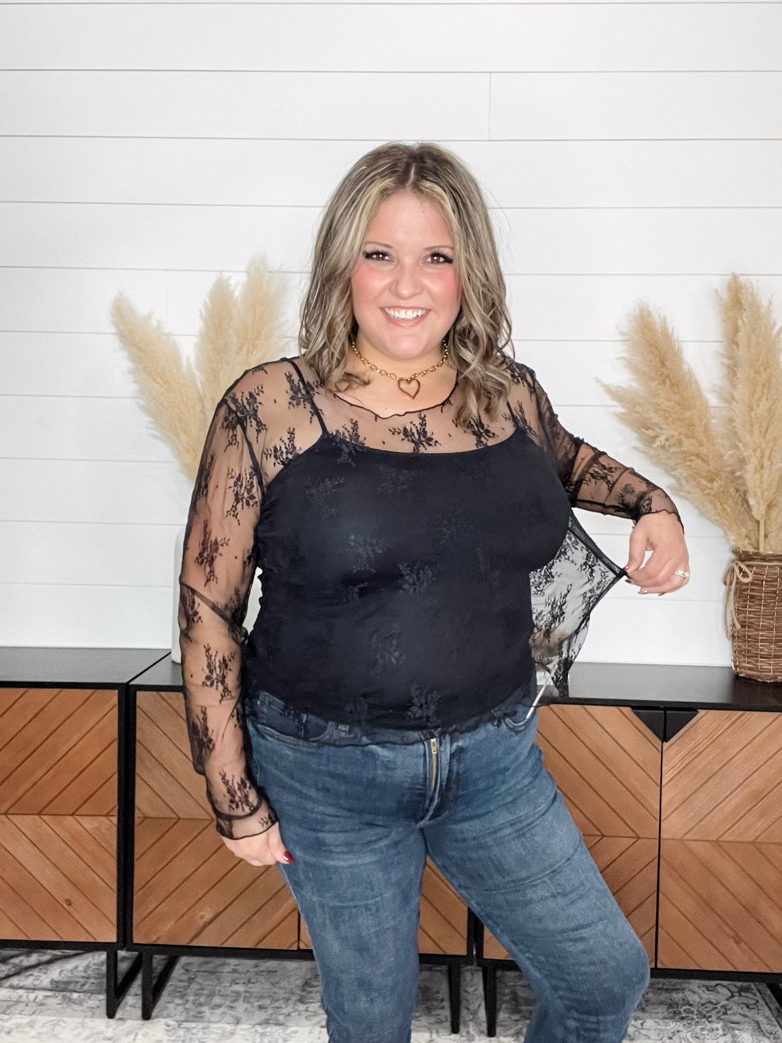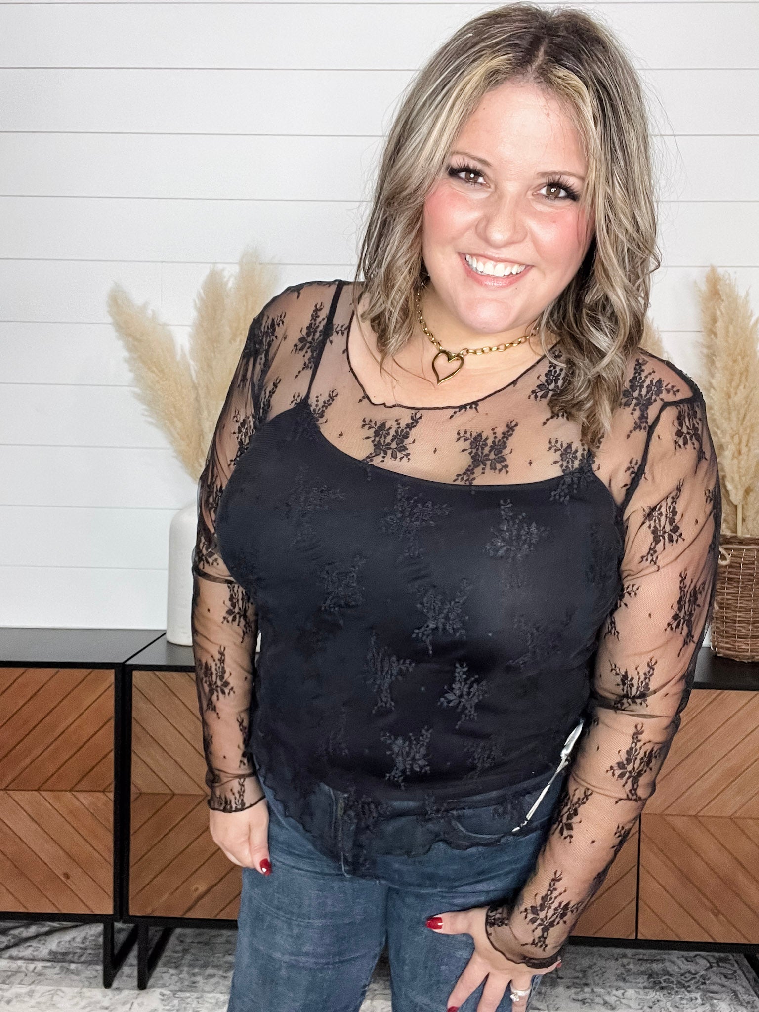 The "Quarter" Long Sleeve Lace Top in black is a lightweight, playful layer that’s perfect for covering up with style. For a comfy, relaxed fit and extra length, be sure to size up. Its delicate lace design adds a flirty vibe while keeping you effortlessly chic.
