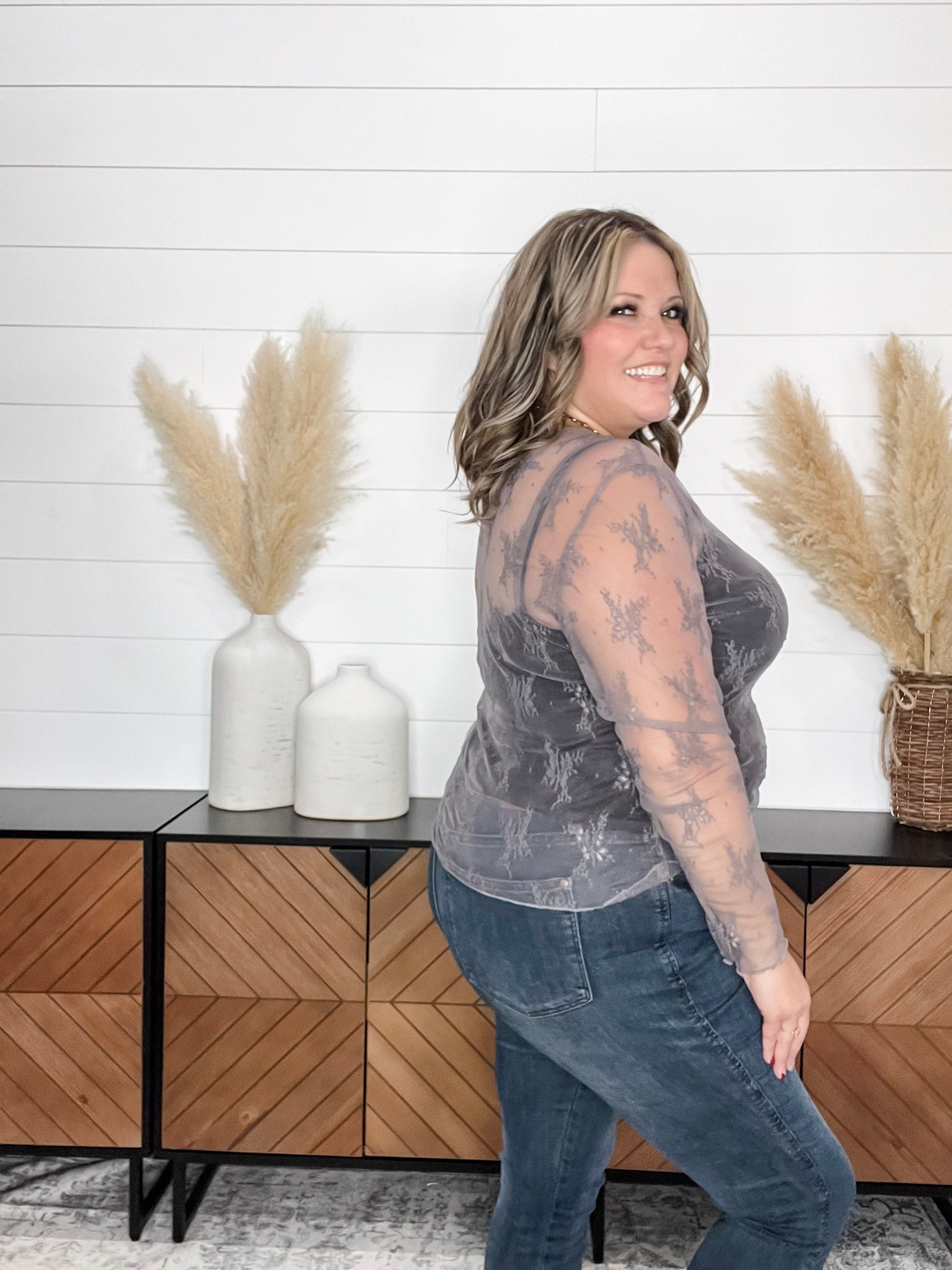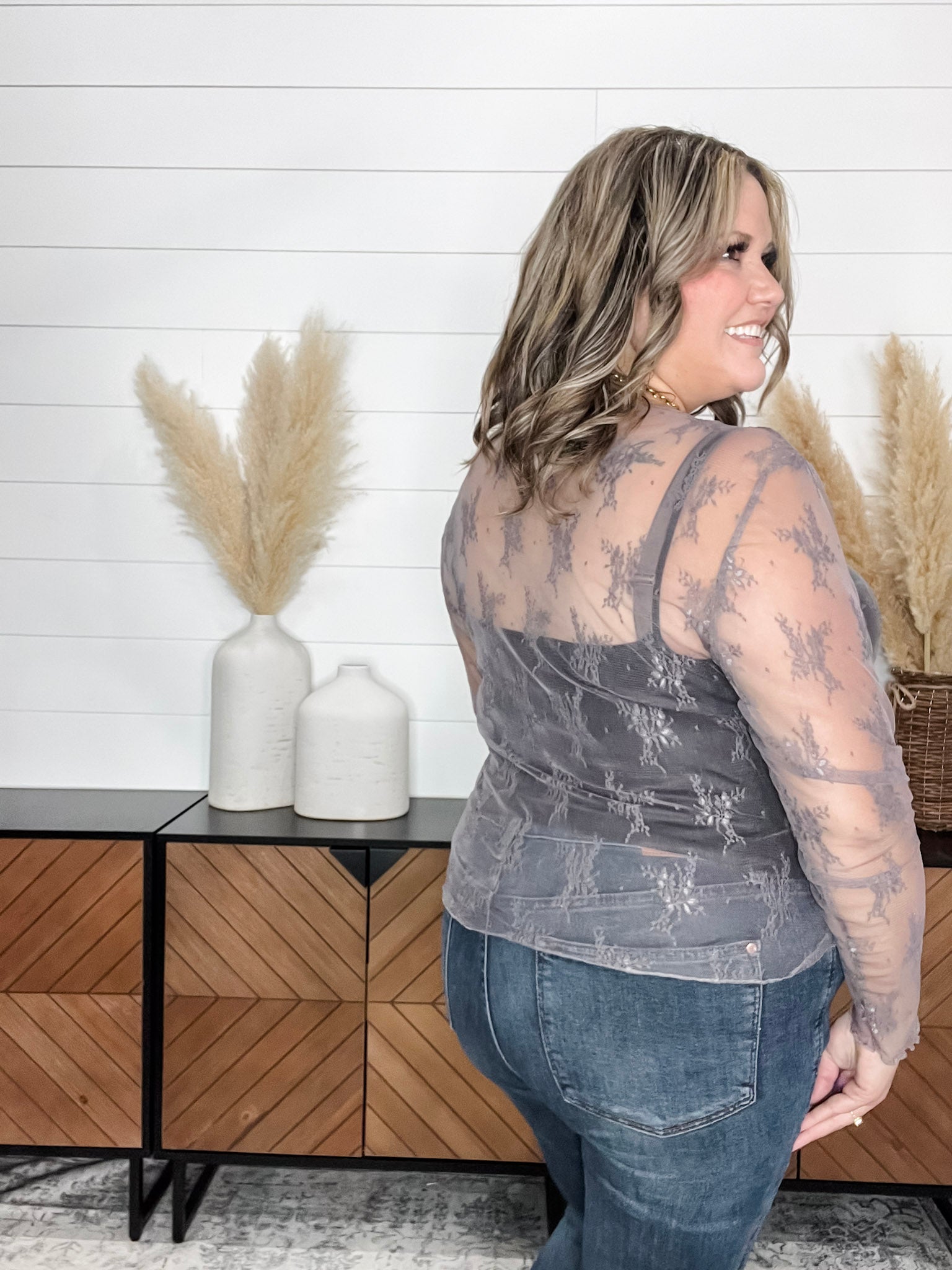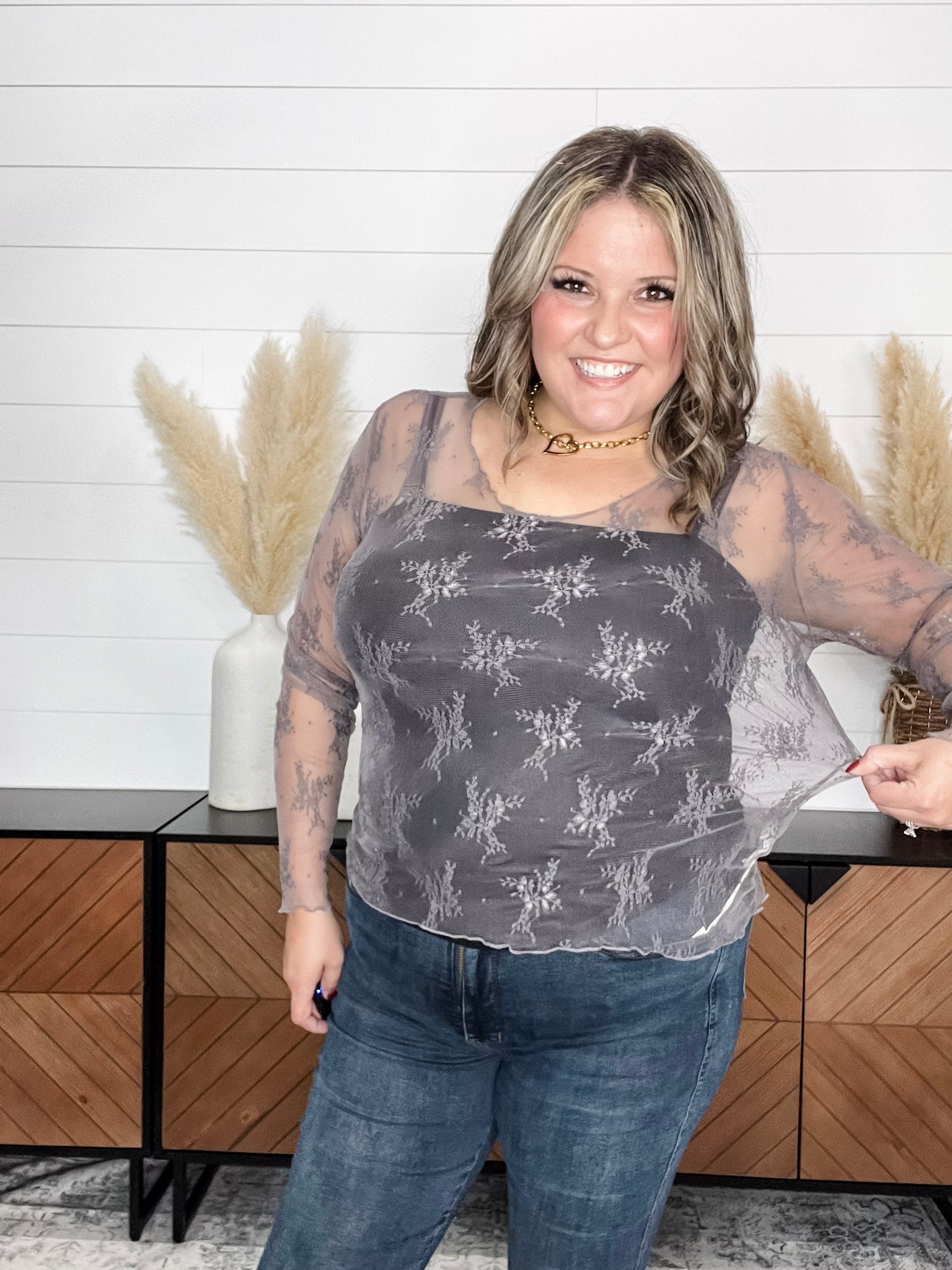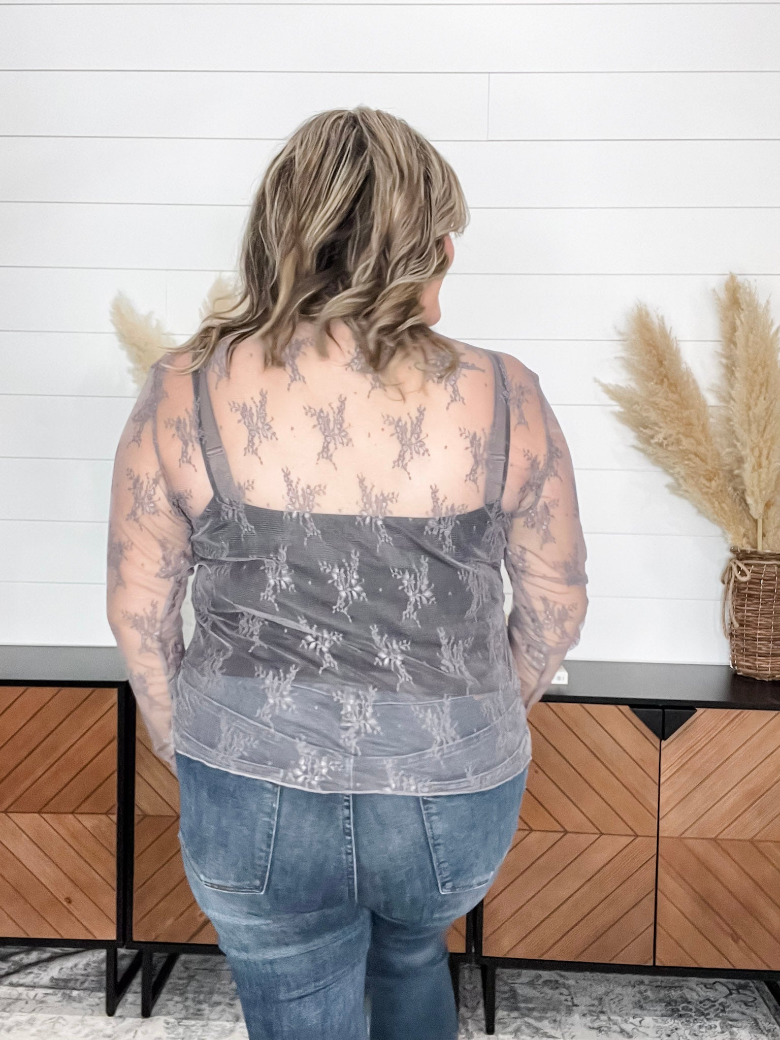 The "Quarter" Long Sleeve Lace Top in grey is a lightweight, playful layer that’s perfect for covering up with style. For a comfy, relaxed fit and extra length, be sure to size up. Its delicate lace design adds a flirty vibe while keeping you effortlessly chic.
