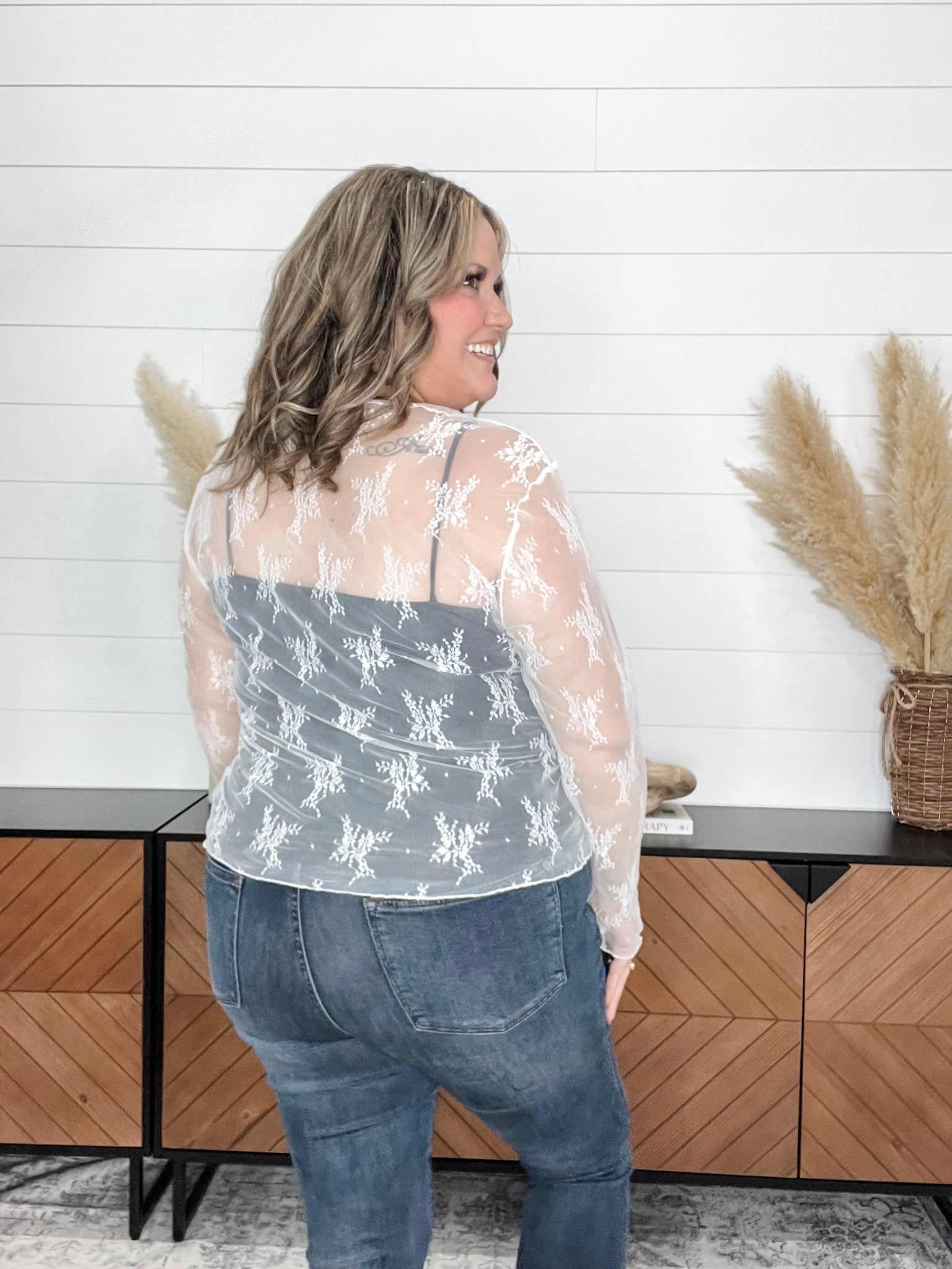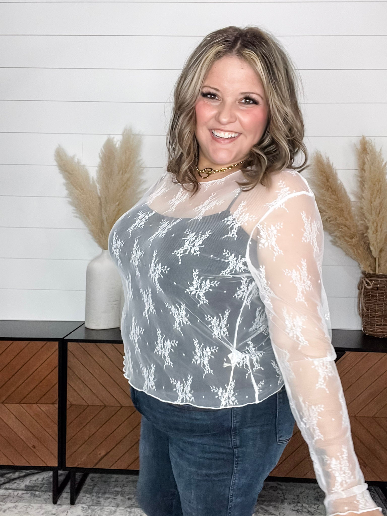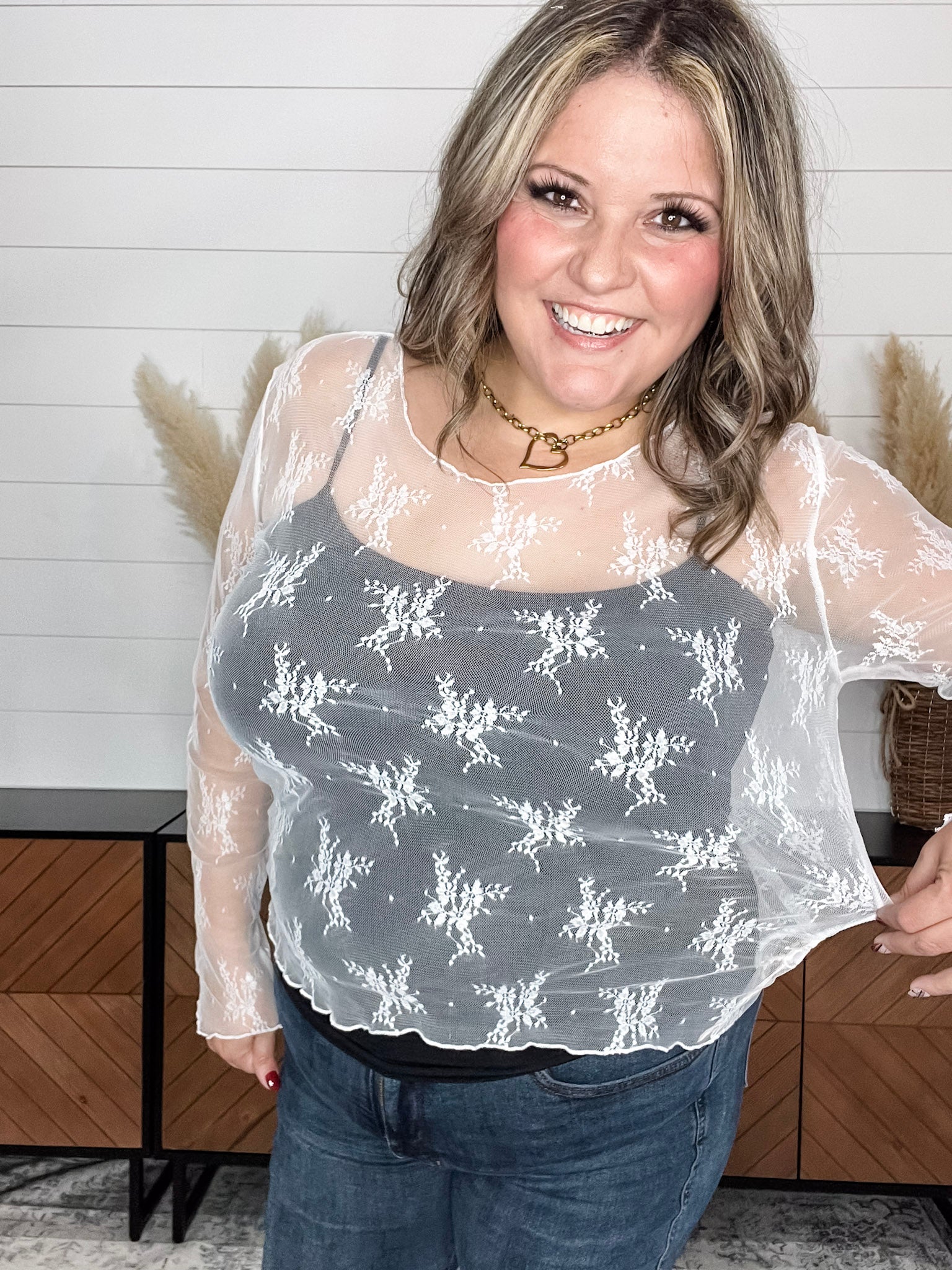 The "Quarter" Long Sleeve Lace Top in white is a lightweight, playful layer that’s perfect for covering up with style. For a comfy, relaxed fit and extra length, be sure to size up. Its delicate lace design adds a flirty vibe while keeping you effortlessly chic.