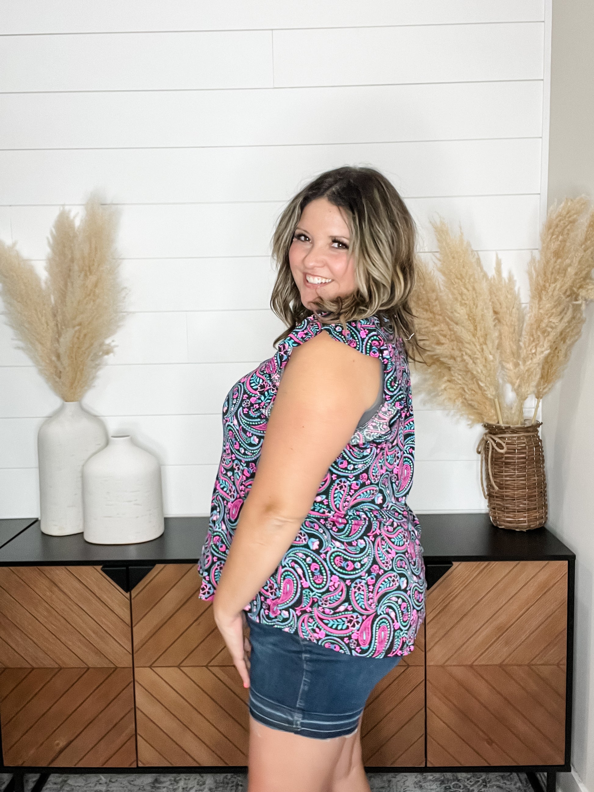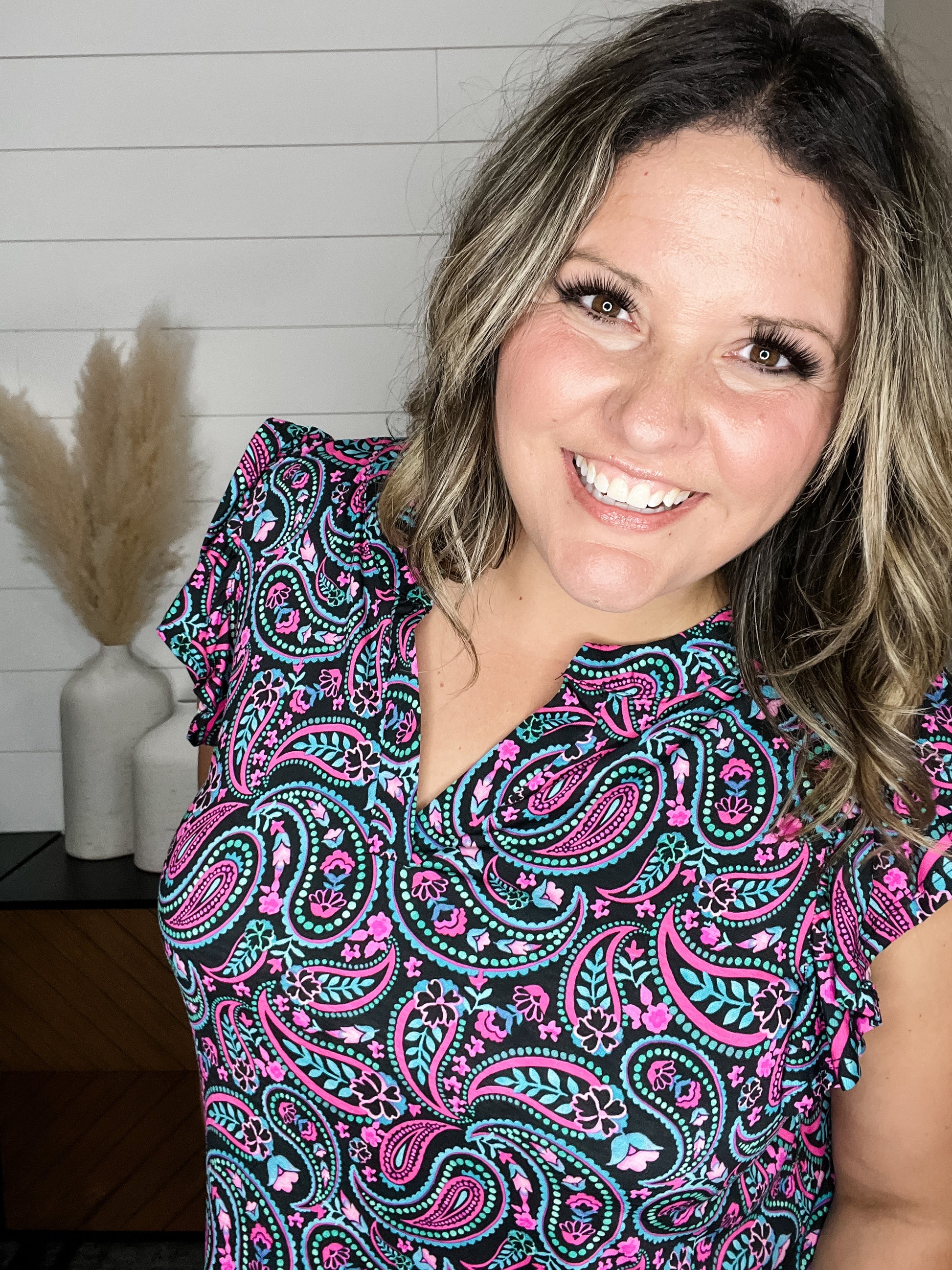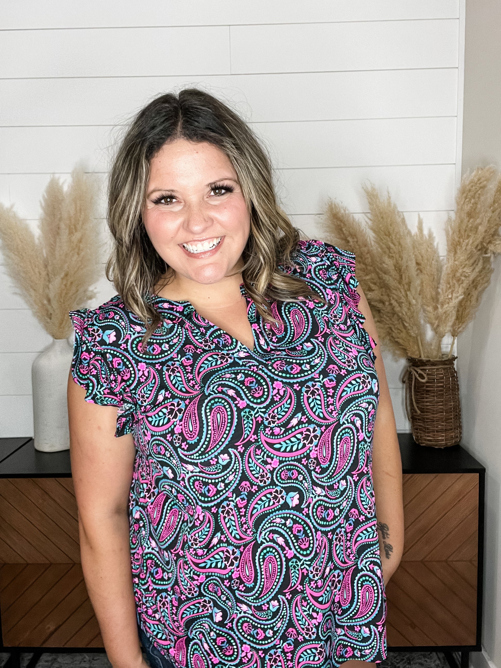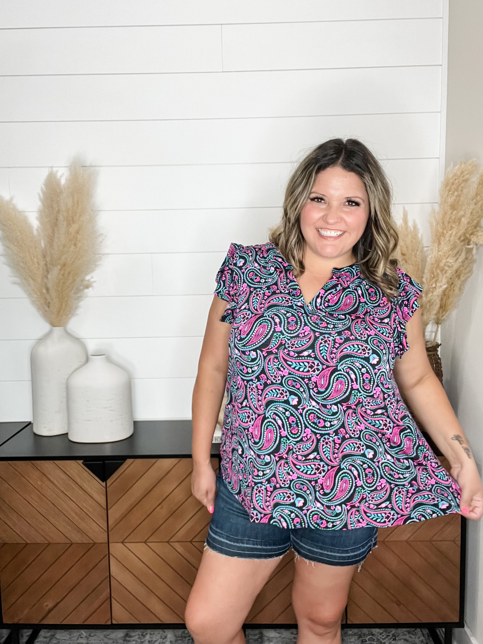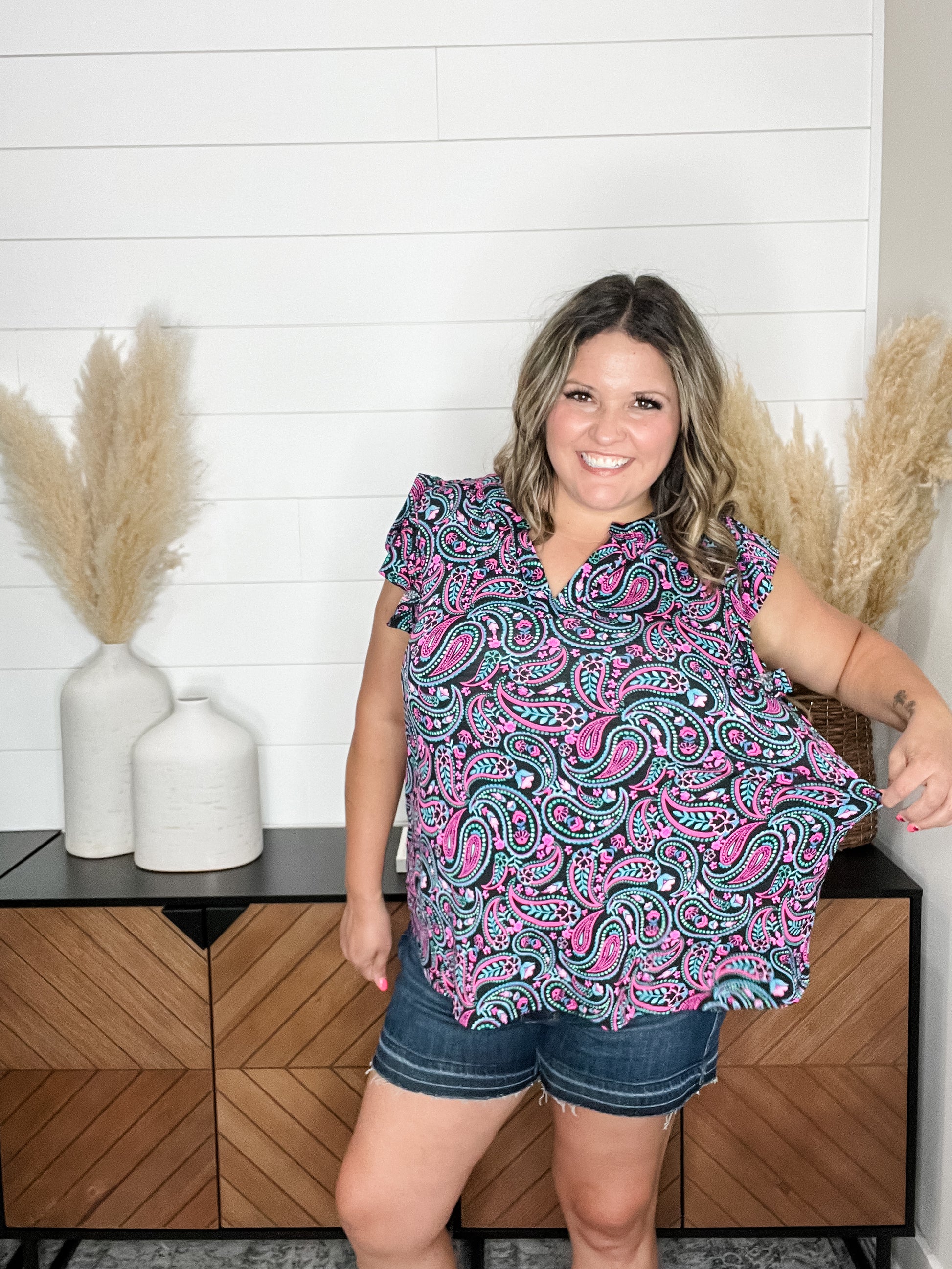The "Pittman" Flutter Sleeve Split Neck blouse by Dear Scarlett is a versatile addition to any wardrobe. Made with slinky, stretchy fabric, it's wrinkle-free and perfect for all-day wear. The black and purple paisley design adds a touch of elegance, while its large bust friendly design ensures a comfortable fit.