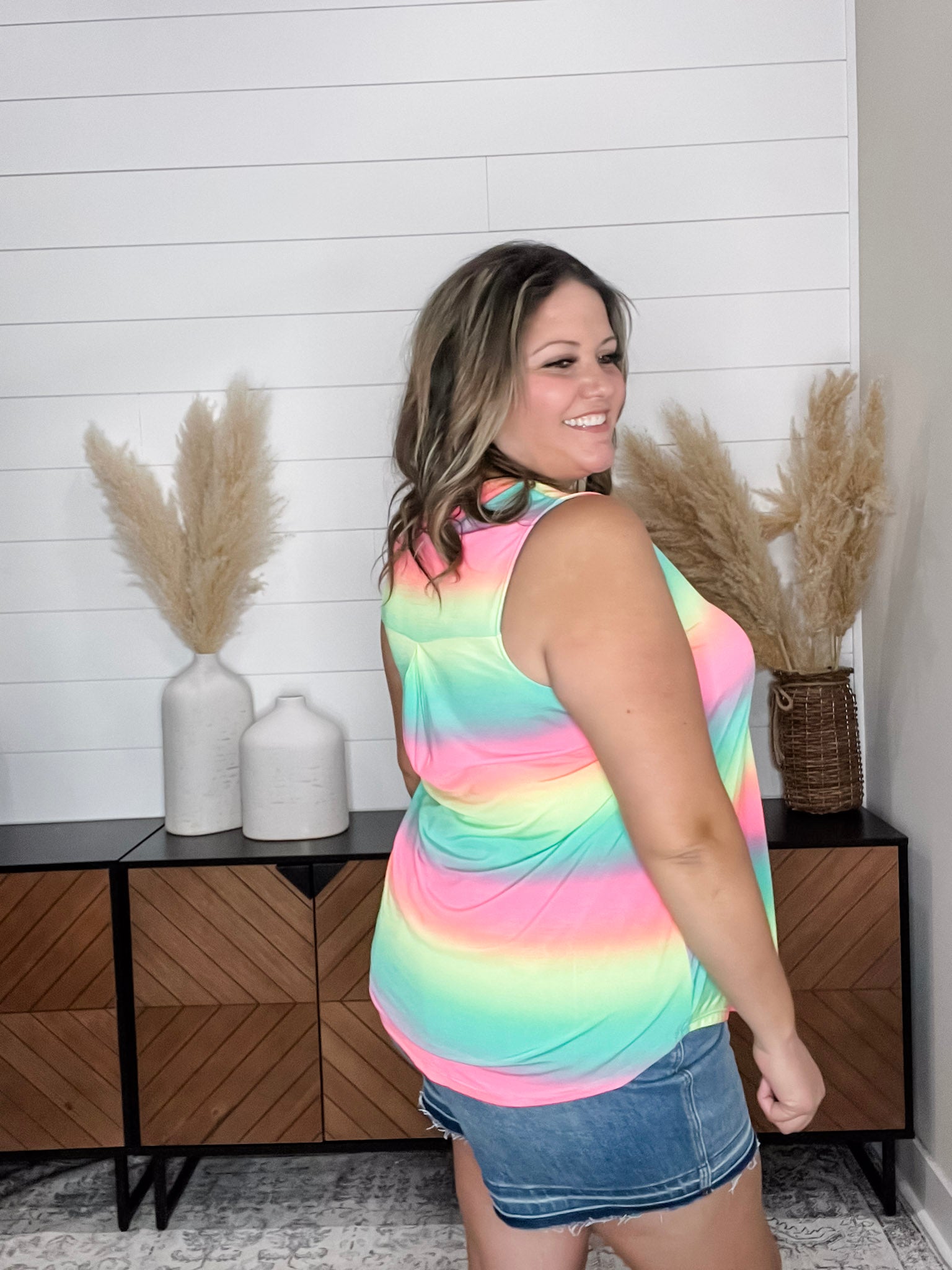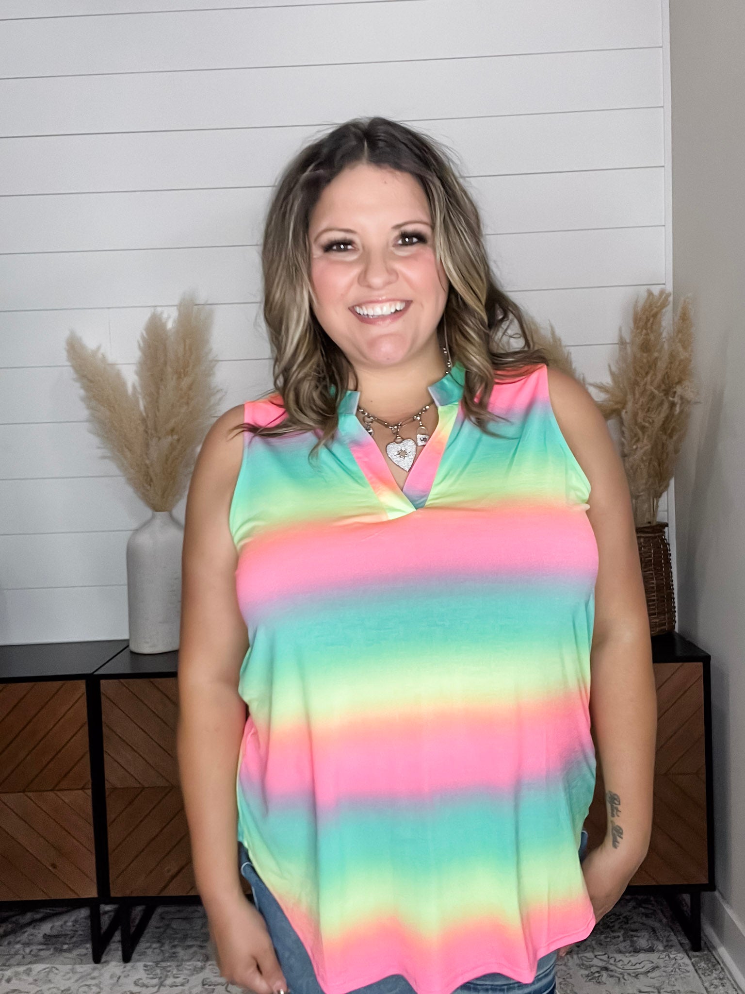 The "Rockwell" Sleeveless Lizzy is a true-to-size blouse from the Dear Scarlett Brand. Its wrinkle-free fabric ensures hassle-free wear, while its slinky stretchy material offers both comfort and style. Featuring a colorful rainbow ombre stripe, this sleeveless blouse is the perfect addition to any wardrobe.