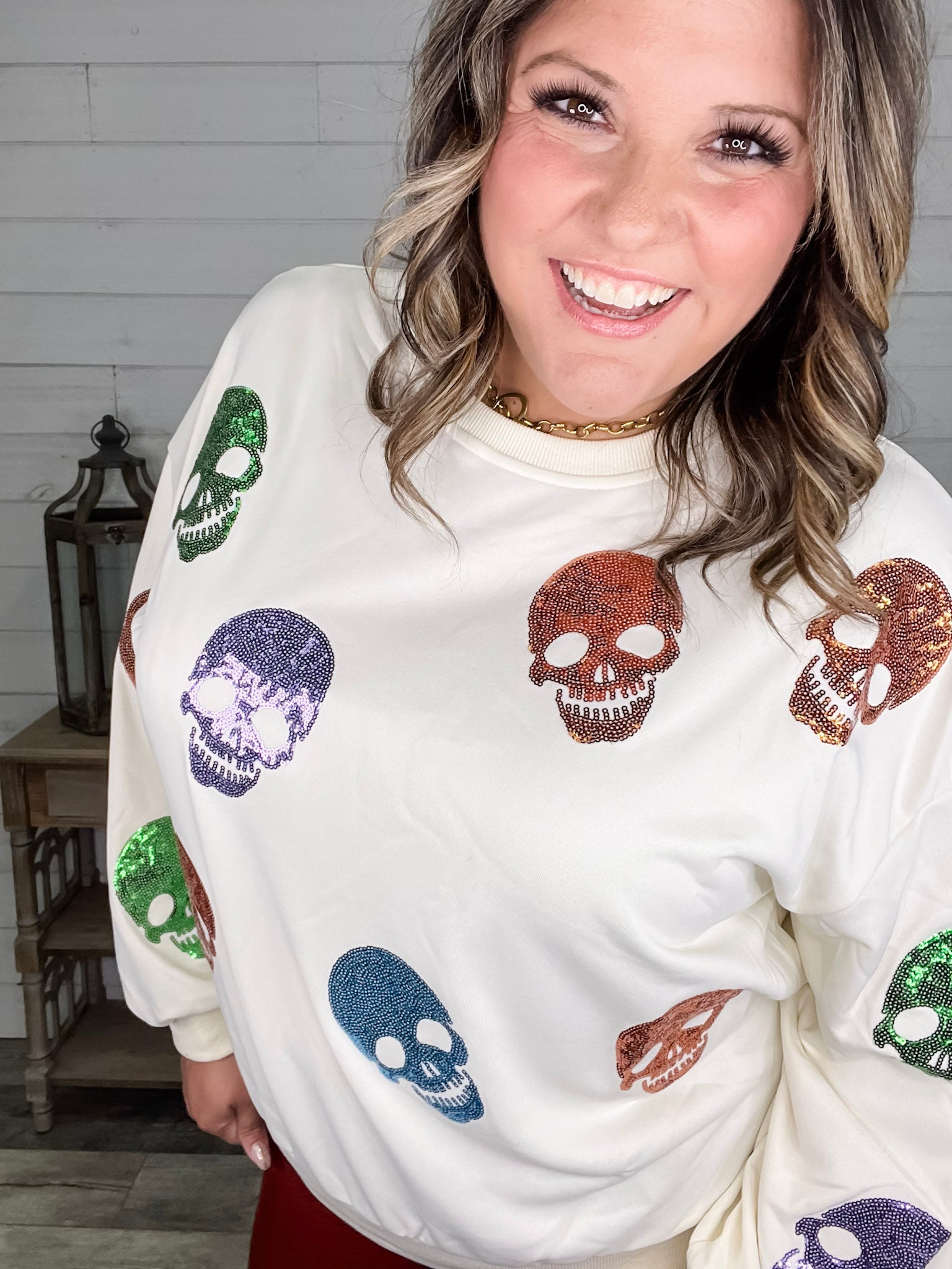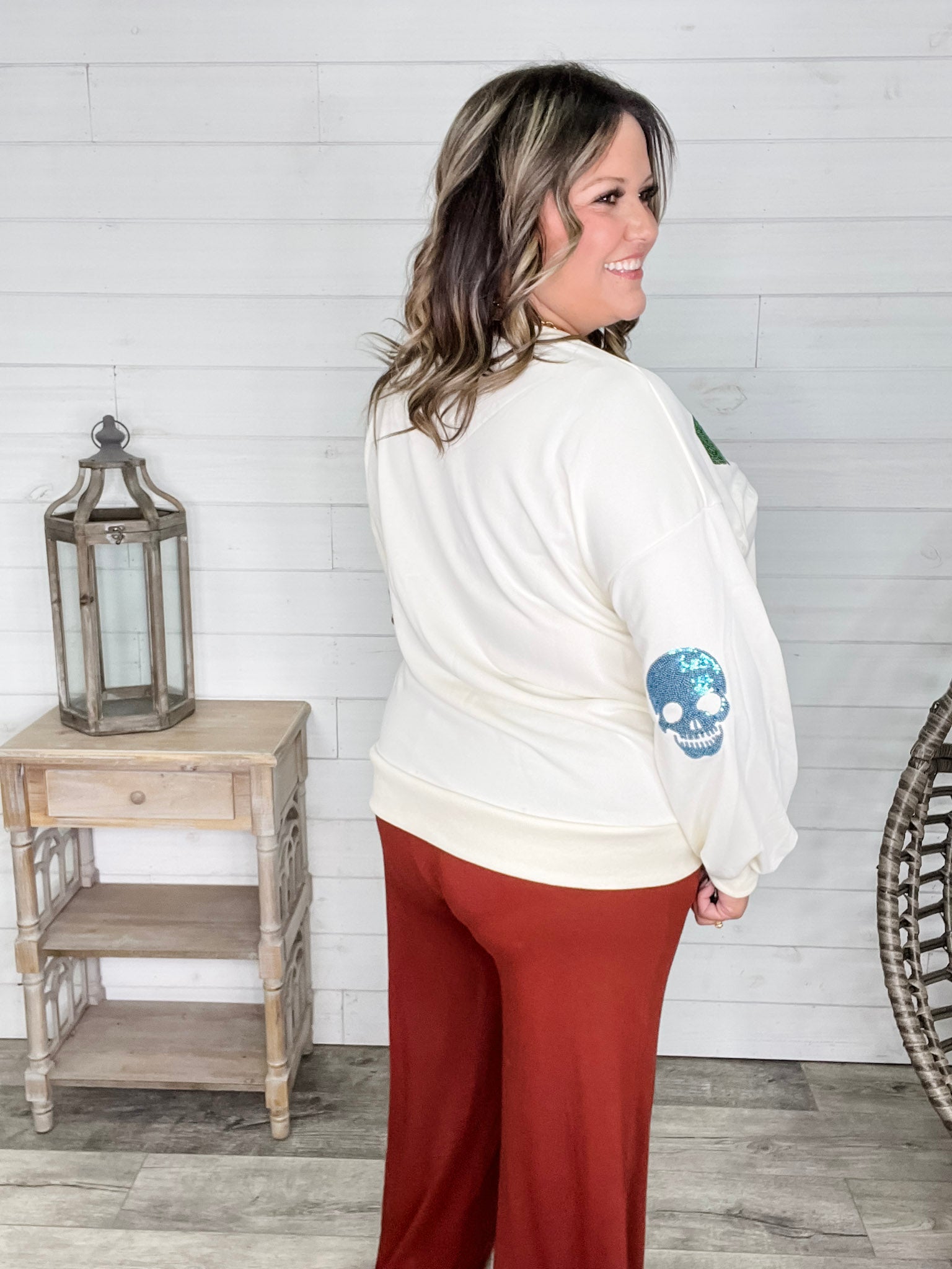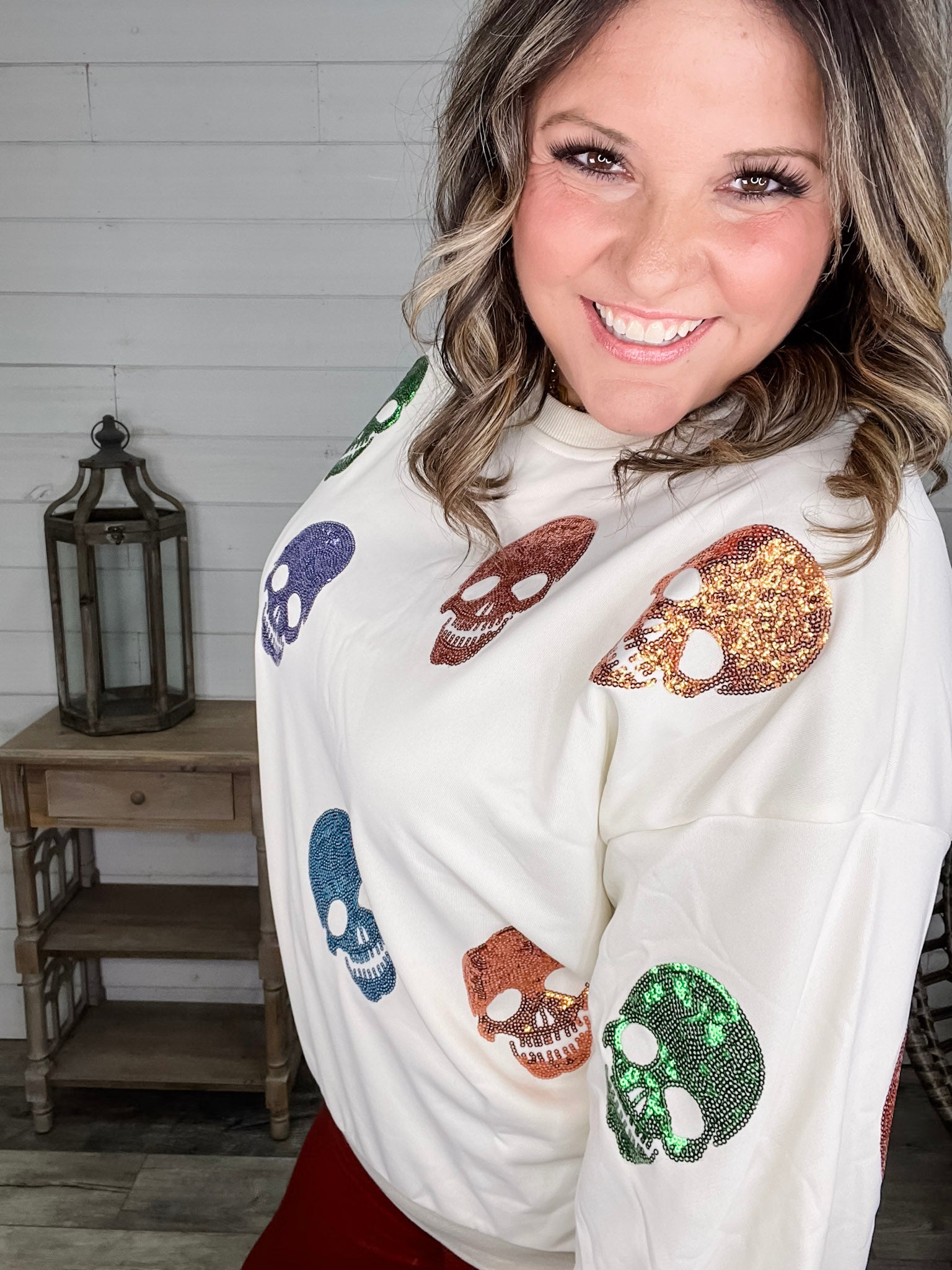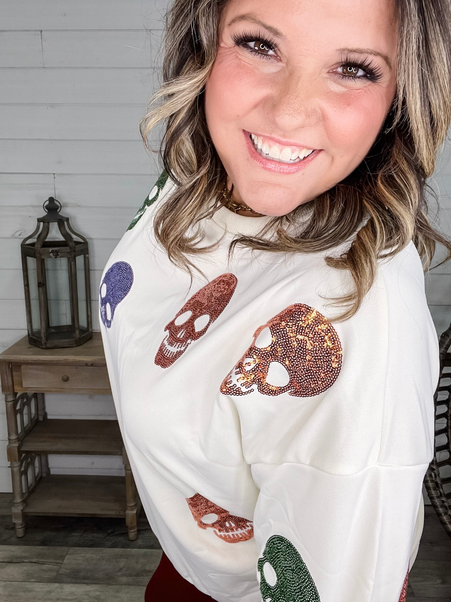 This Sequin Skull Crewneck Long Sleeve combines a soft, stretchy neoprene base with dazzling rainbow sequins for a fun, eye-catching look. Designed to fit true to size with a roomy feel, each top features unique sequin skull placements and colors, making yours one of a kind. Perfect for adding a playful edge to your wardrobe!