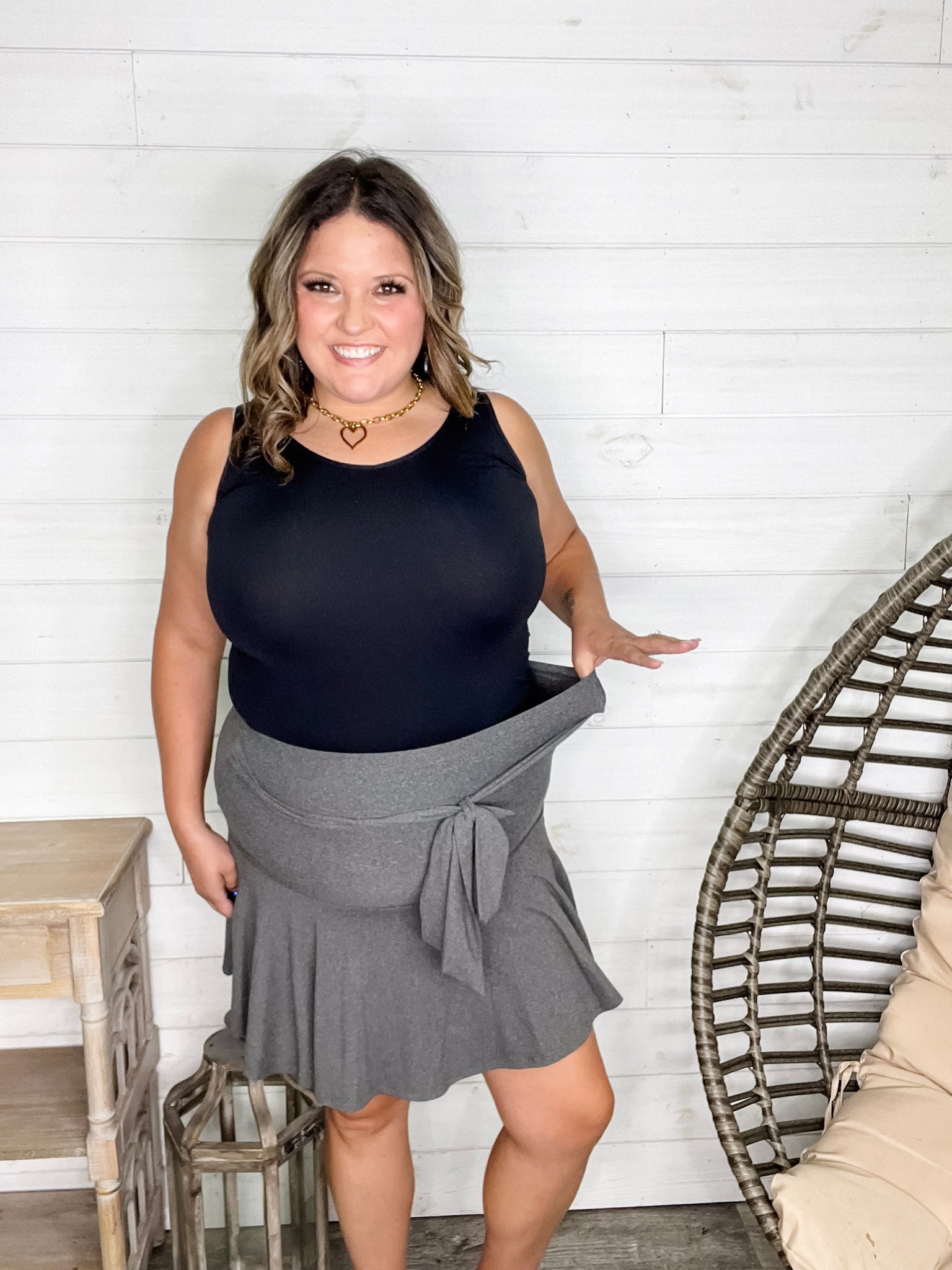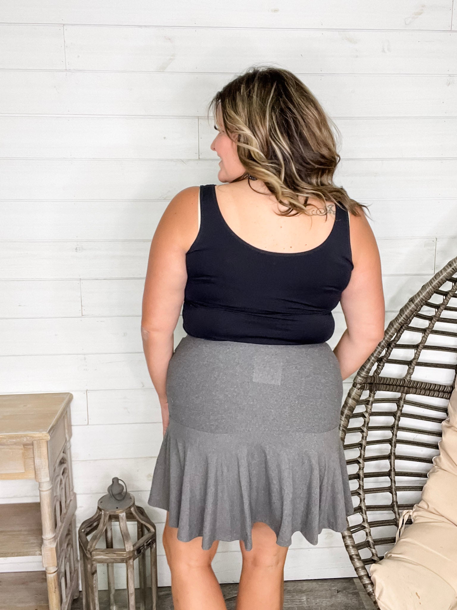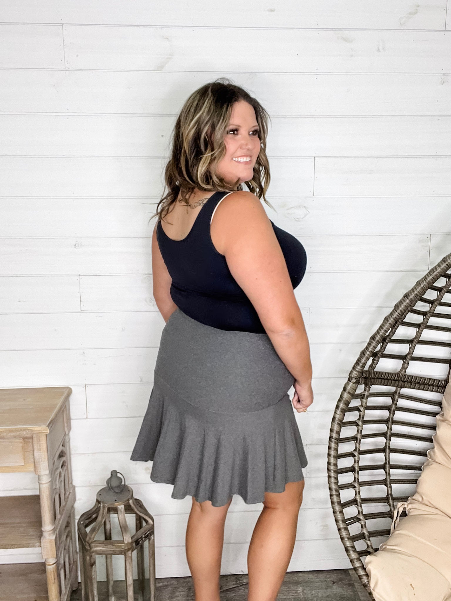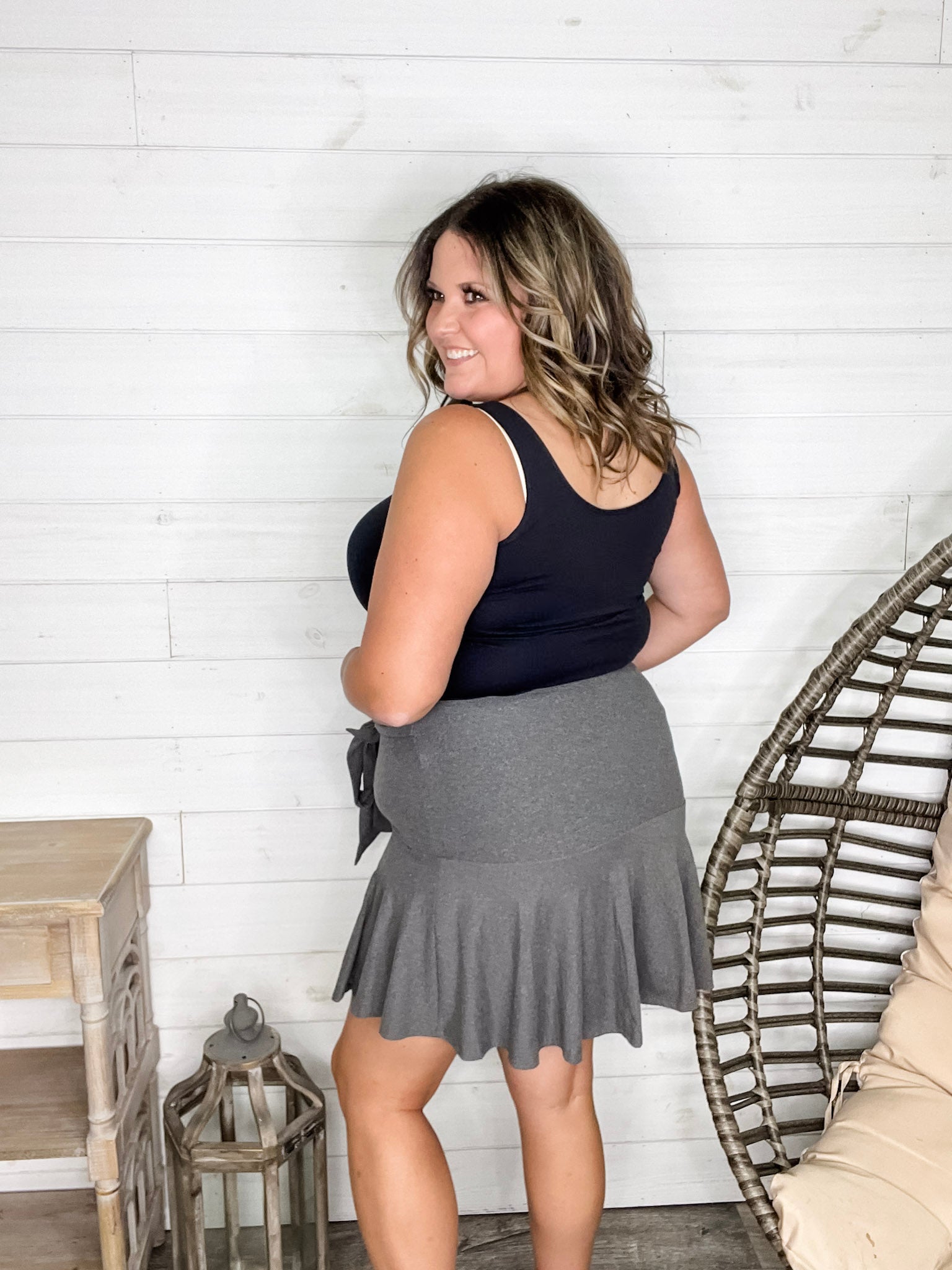 Experience comfort and style with the "Serena" Ruffled Skort in Charcoal. Crafted from buttery soft fabric with great stretch, it moves with you for all-day ease. The playful ruffled design adds a flirty touch, perfect for sunny days or casual outings. Embrace effortless charm and cozy wear in one chic piece!