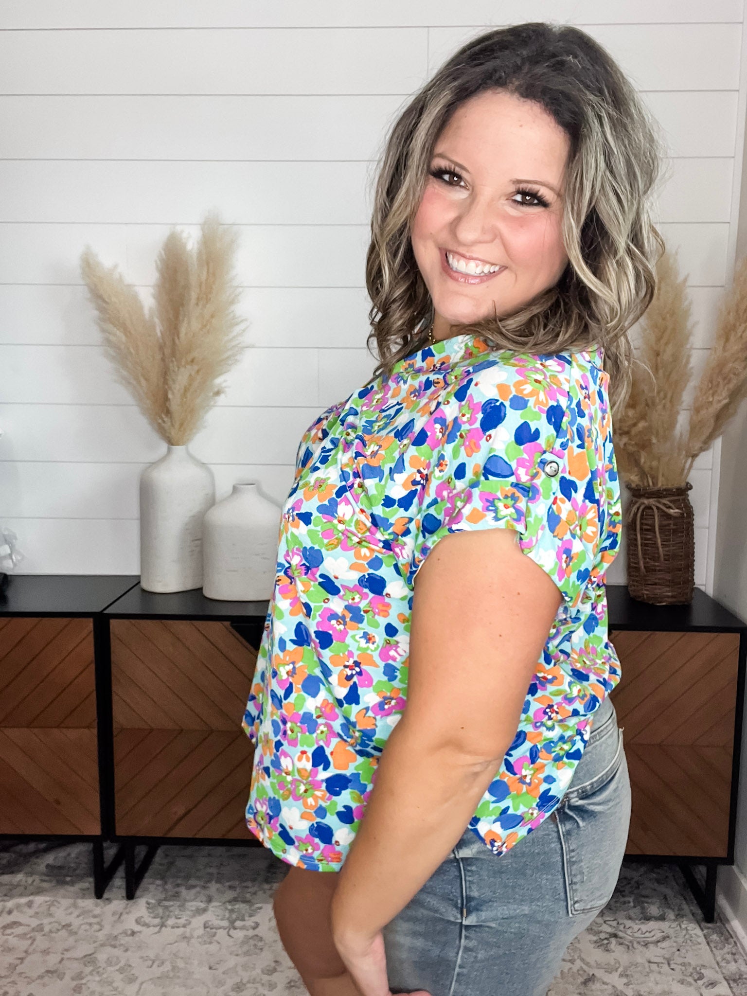"Smack Dab" Split Neck Cuffed Short Sleeve