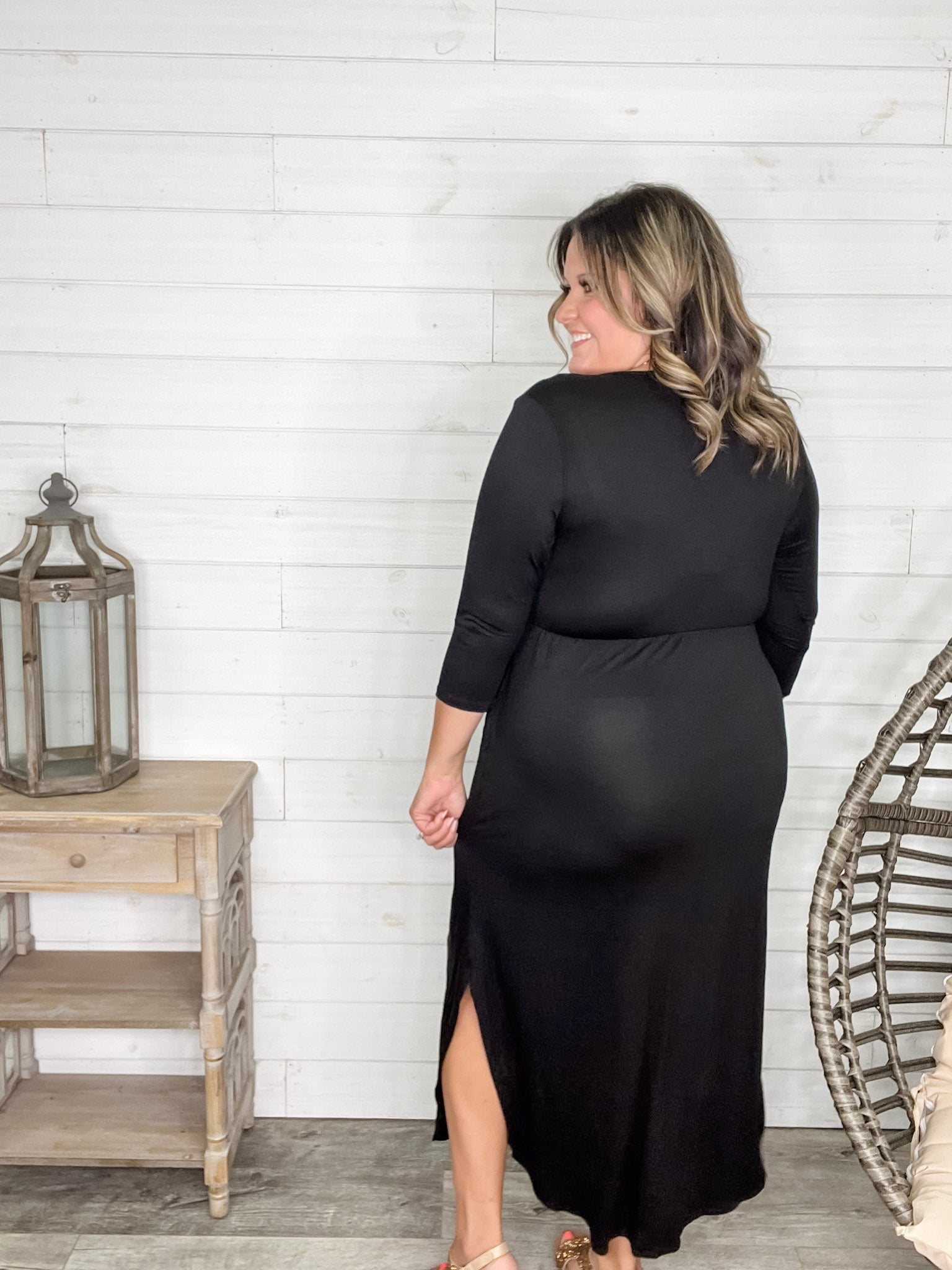 Solid 3/4 Sleeve Wrap Dress with Pockets (Black)