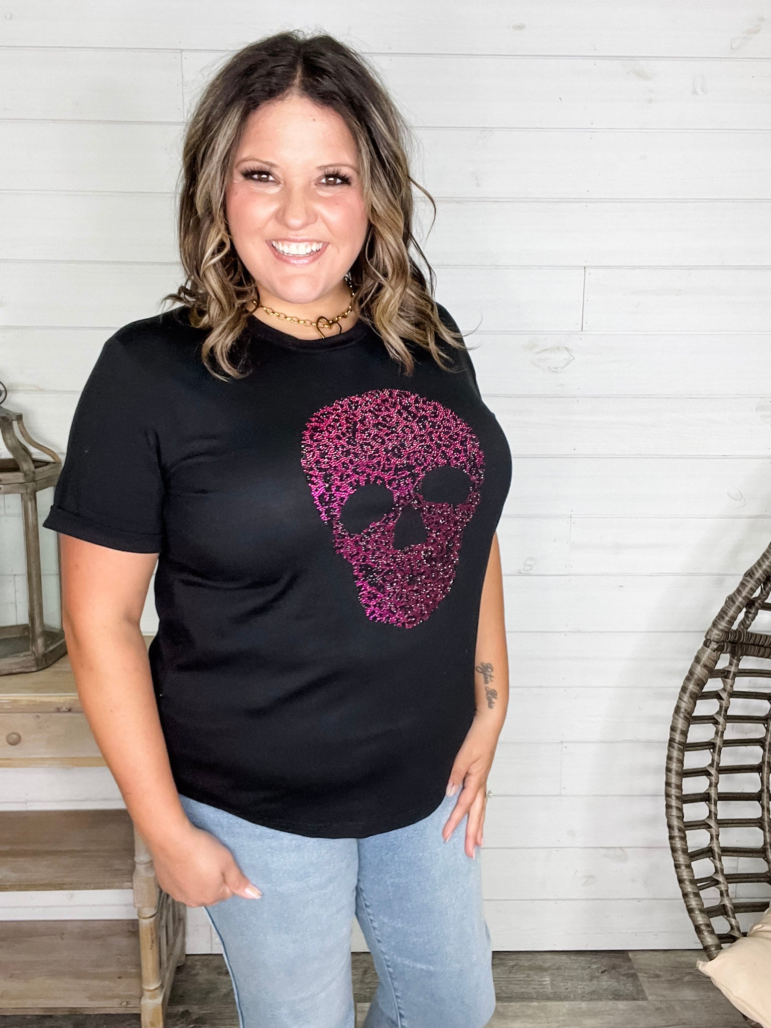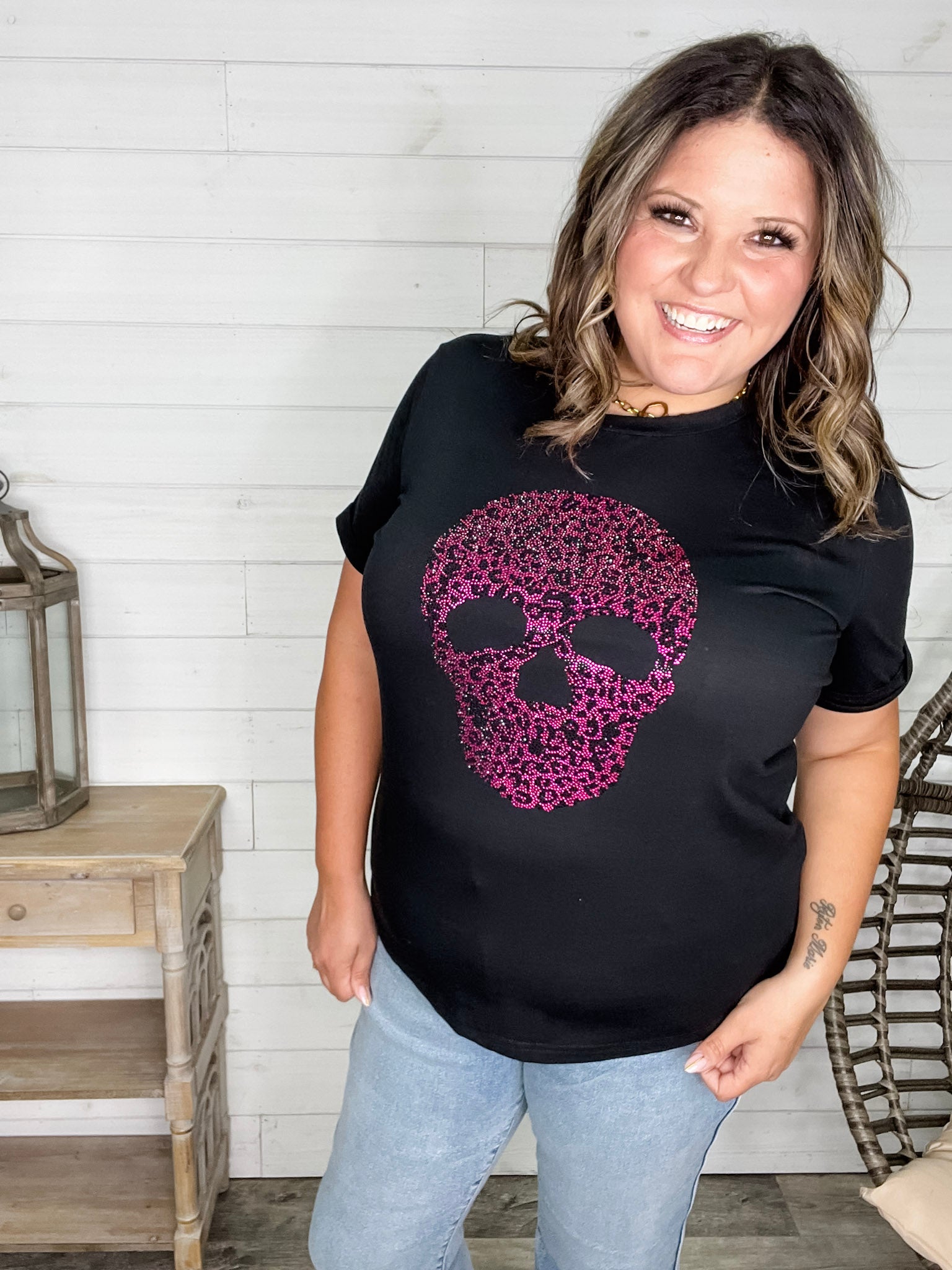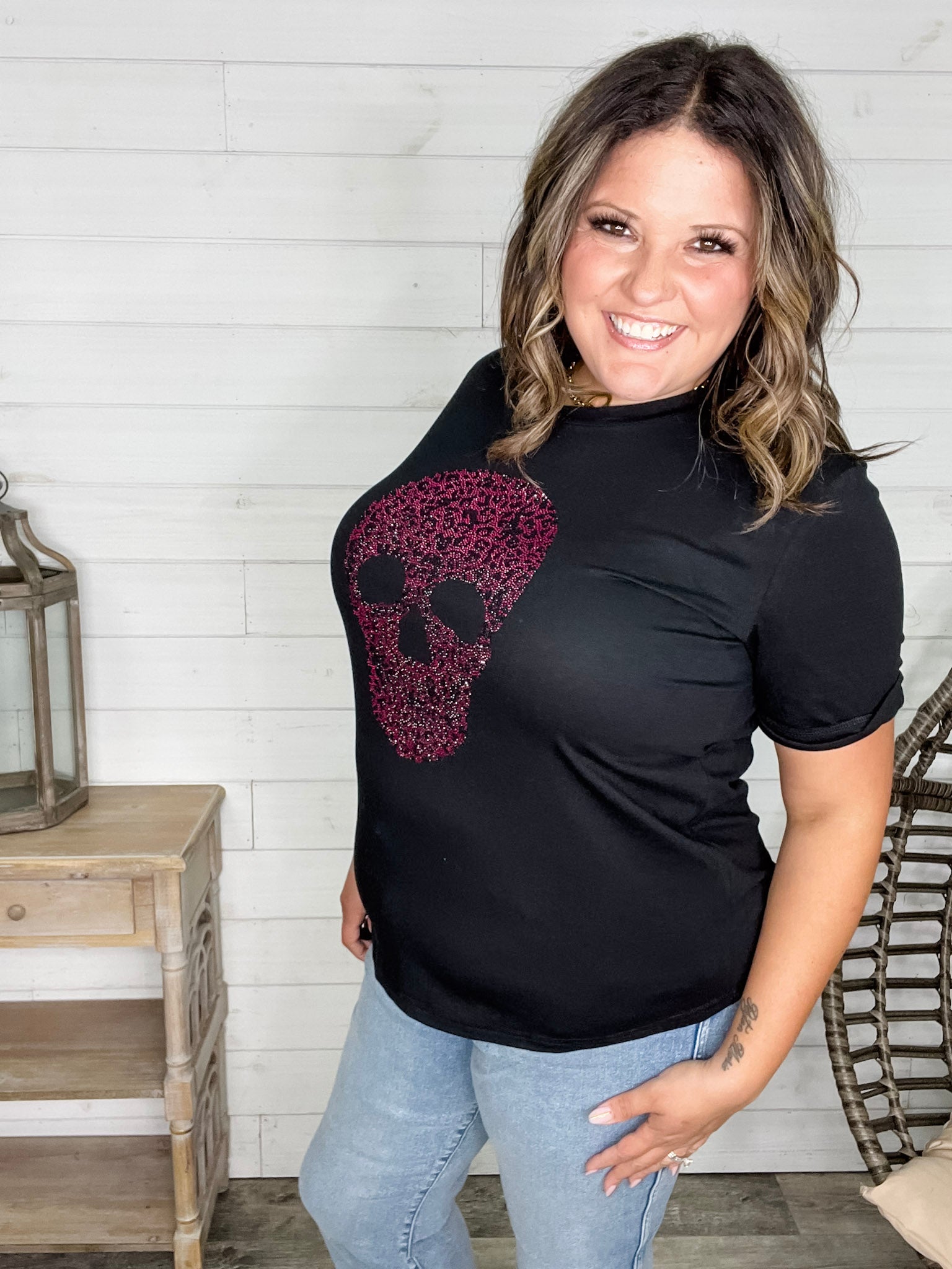 This uber-soft black tee combines comfort with a playful edge, featuring a sparkling rhinestone skull inspired by animal print. With plenty of stretch, it offers a relaxed fit—perfect for layering or wearing solo. To keep those rhinestones shining, wash inside out on a gentle cycle or by hand. For a more fitted look, consider sizing down if you’re not carrying extra tummy weight. Embrace your wild side with this standout tee!