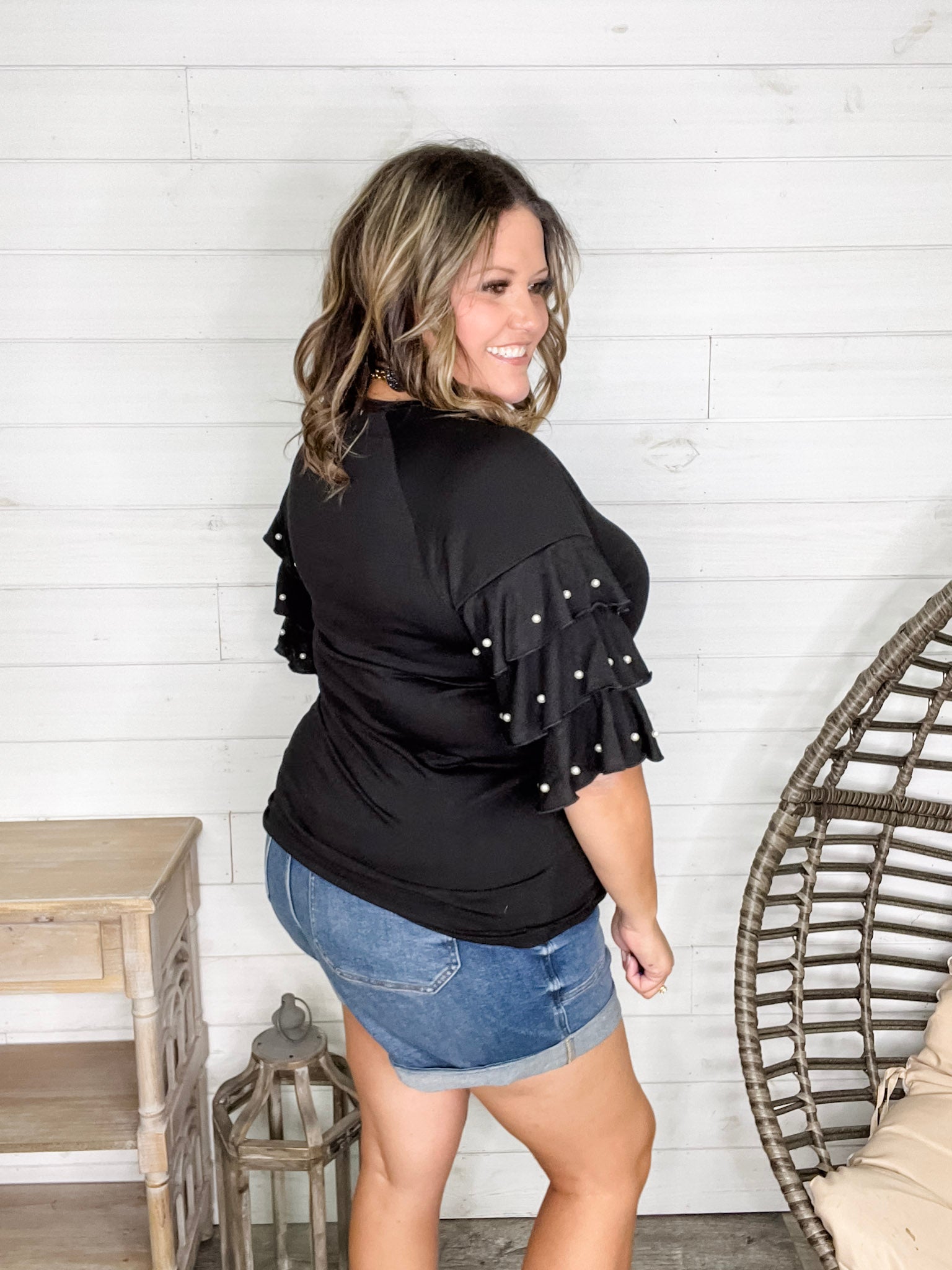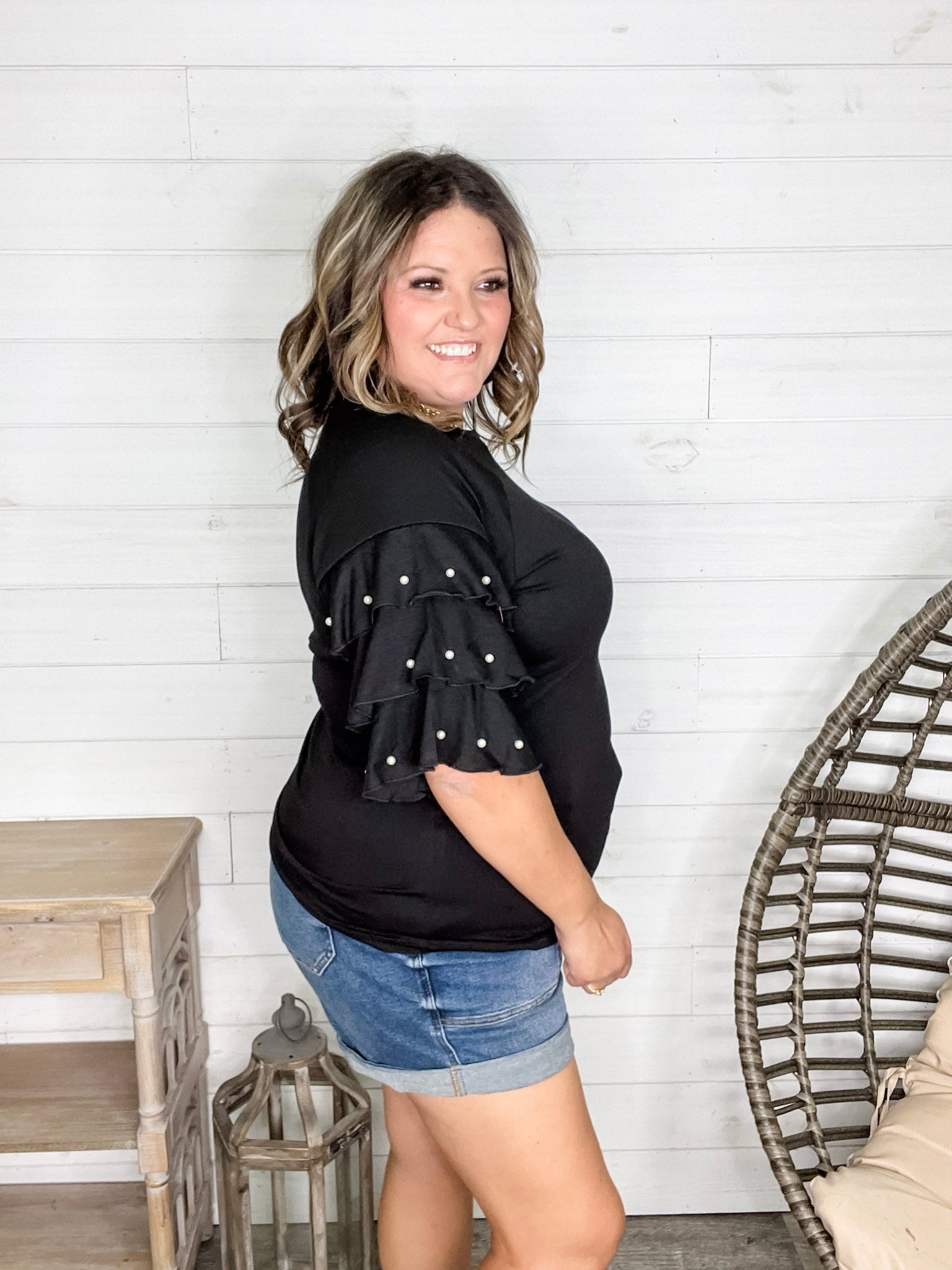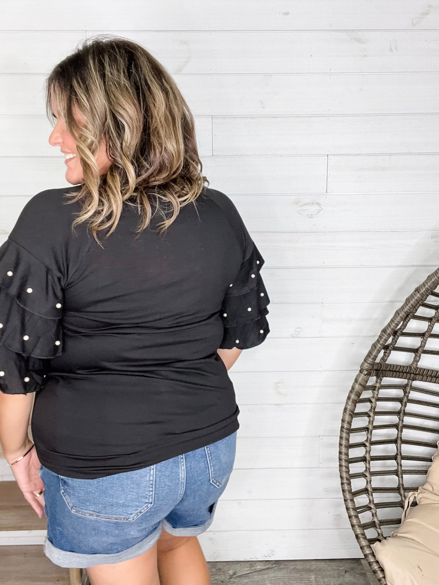 "Stay Classy" Round Neck Ruffle Tiered Sleeve with Pearl Detail