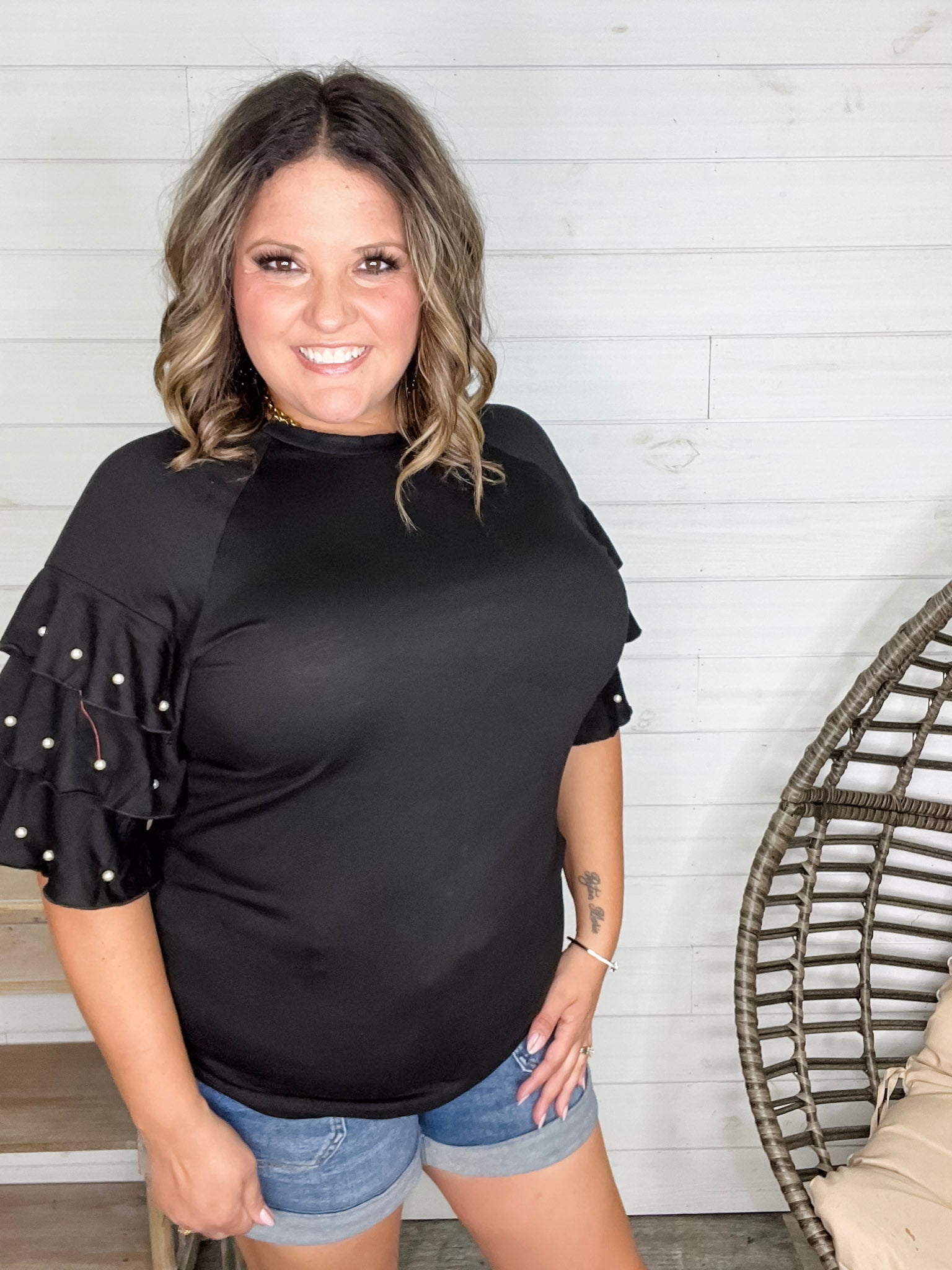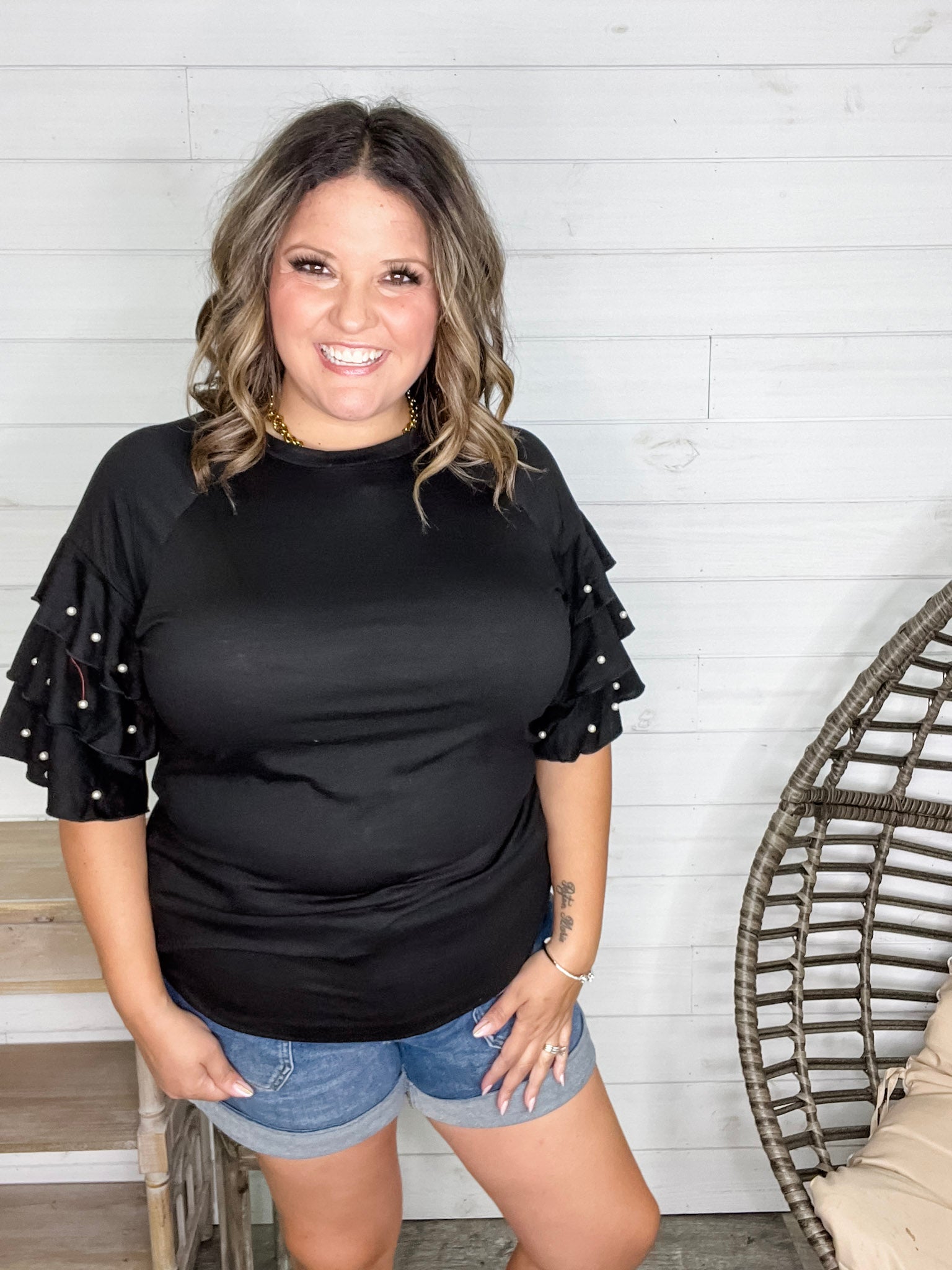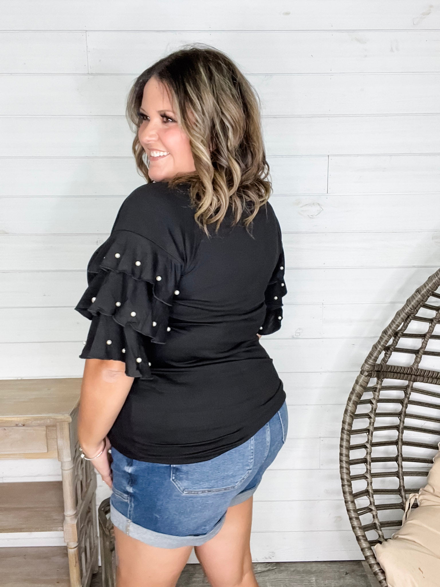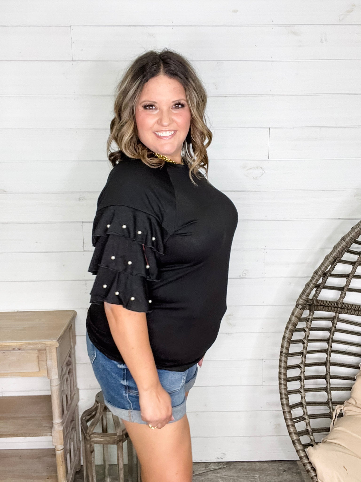 "Stay Classy" Round Neck Ruffle Tiered Sleeve with Pearl Detail