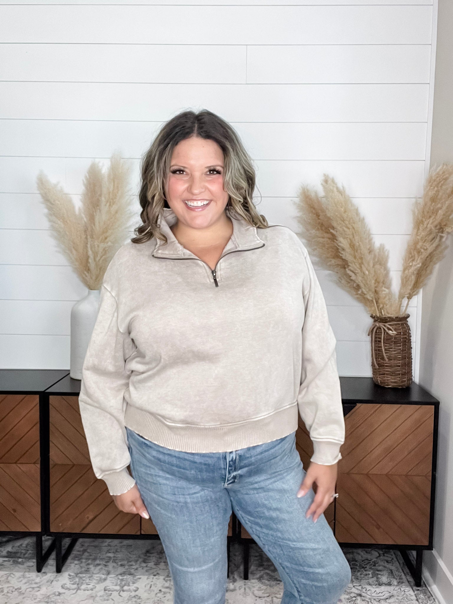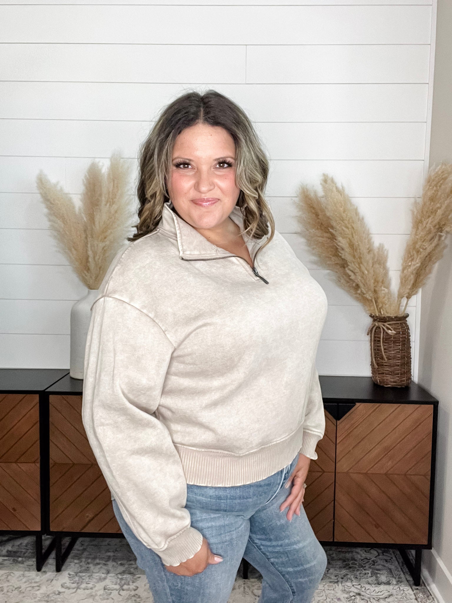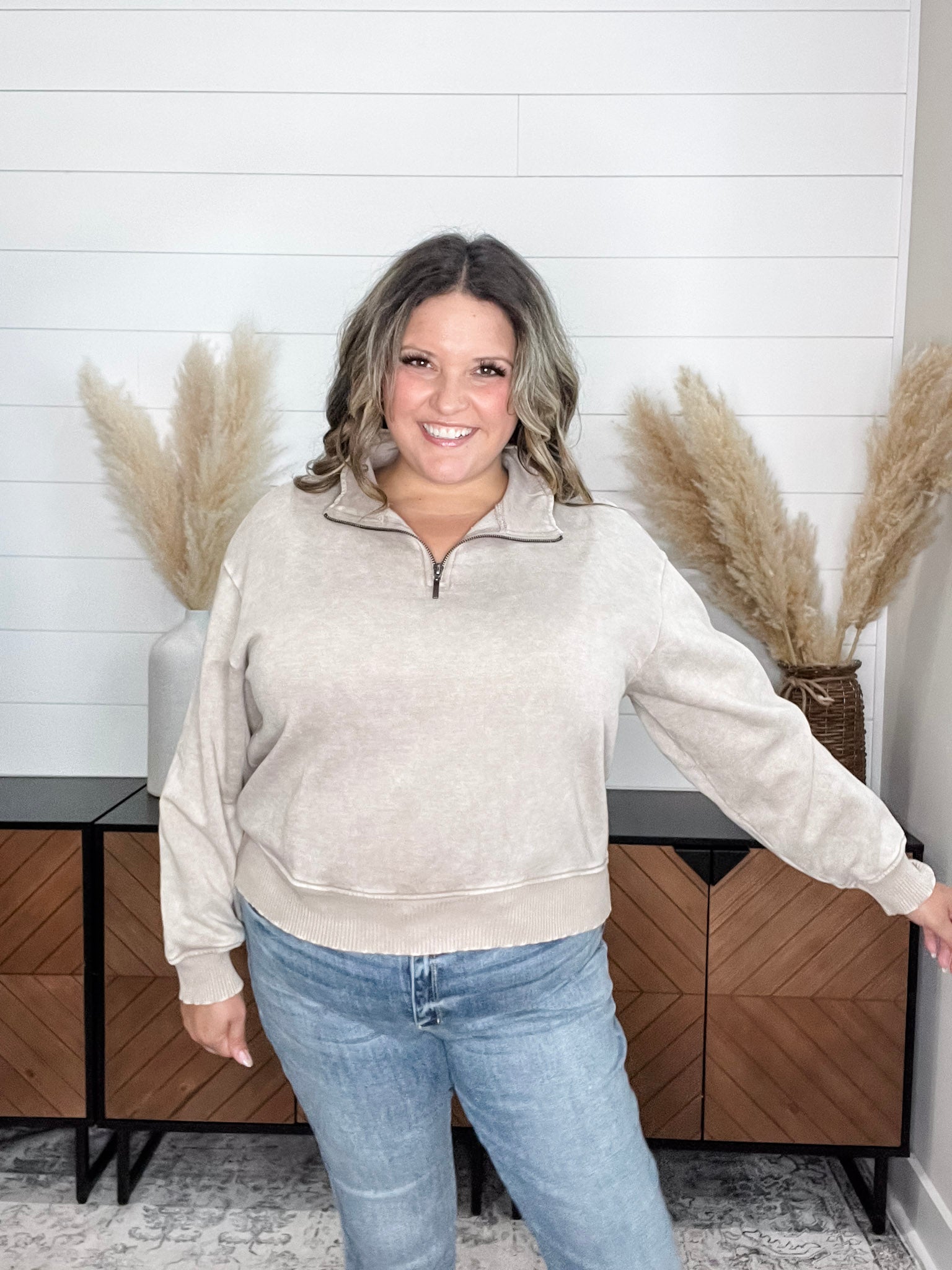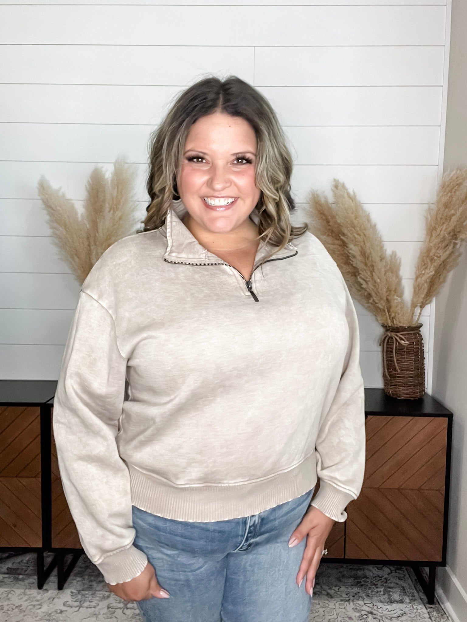 Stay cozy and cool in the "Stone Cold" Acid Wash Cropped 1/2 Zip. Its super soft fabric and slightly cropped length make it perfect for pairing with tummy control jeans or when you want long sleeves without full coverage. Designed for comfort and style, this playful piece adds a trendy edge to your casual wardrobe. Ash rocks the 1X, showing off the perfect fit for sizes 16/17.