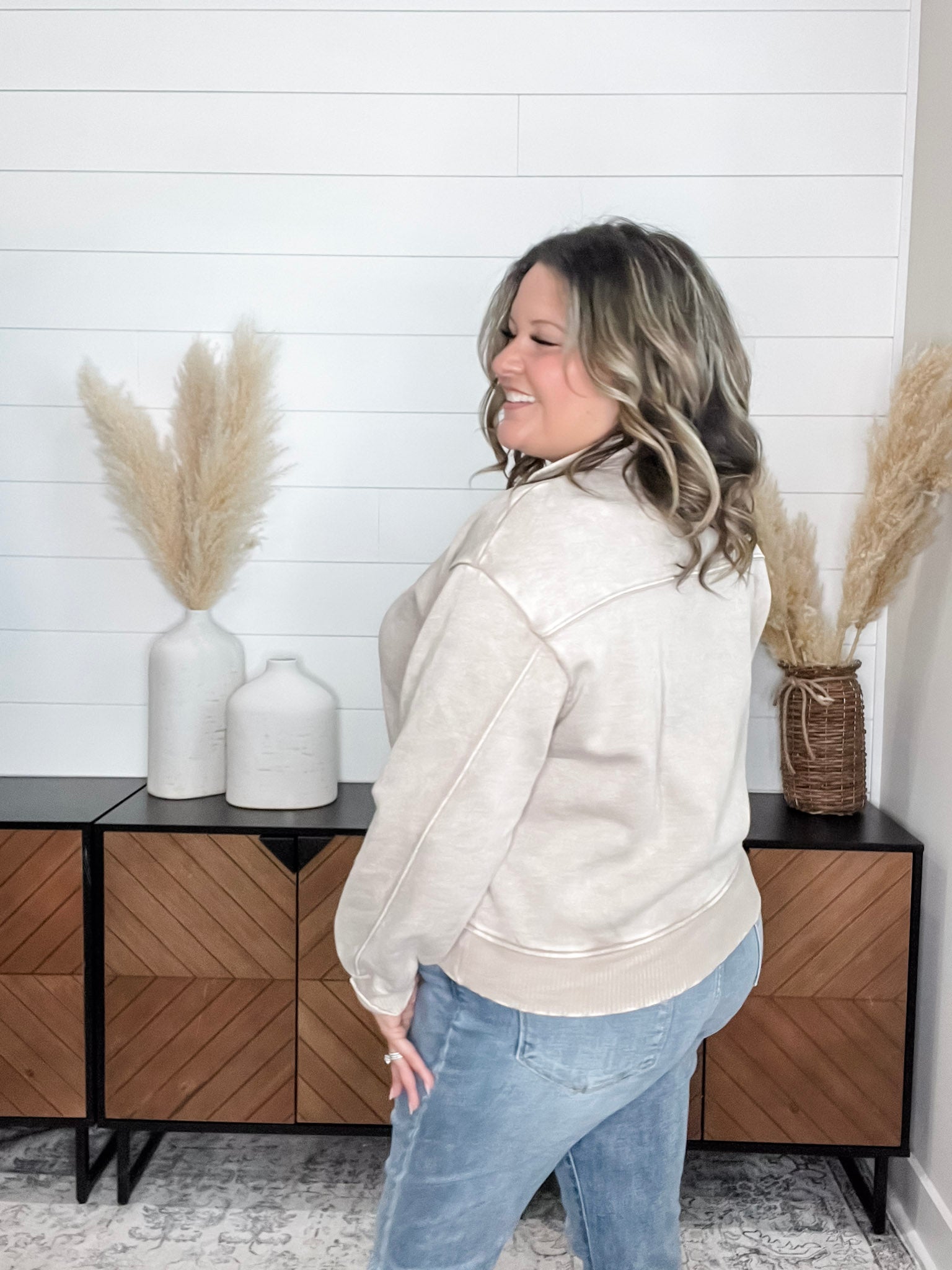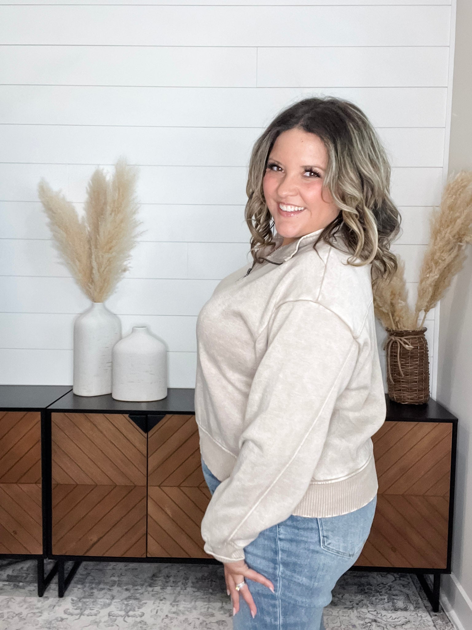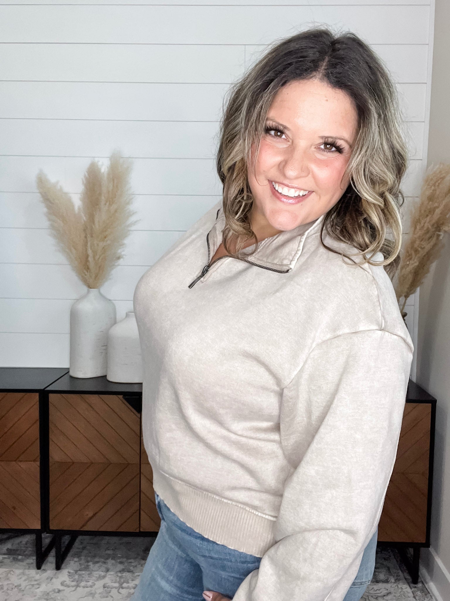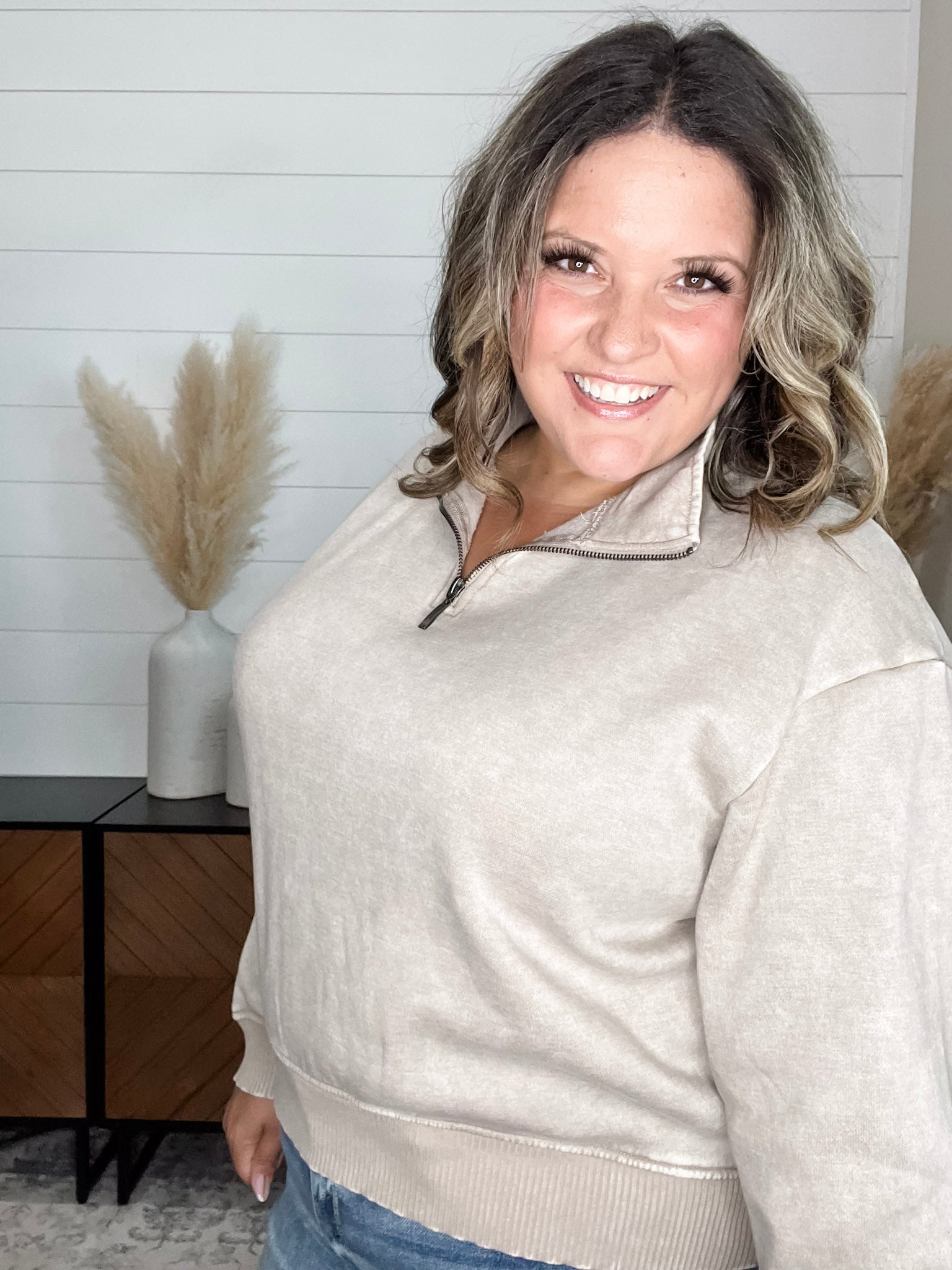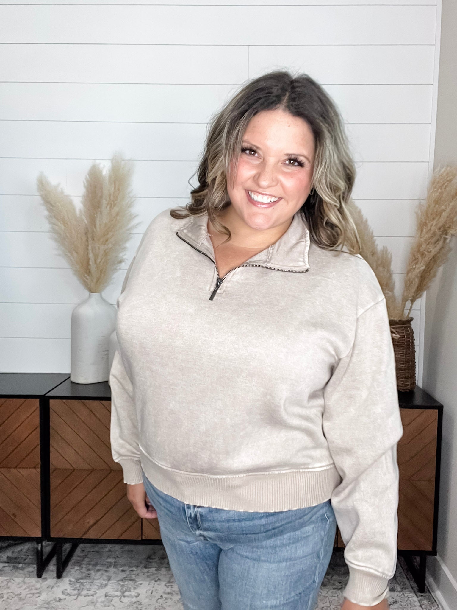 Stay cozy and cool in the "Stone Cold" Acid Wash Cropped 1/2 Zip. Its super soft fabric and slightly cropped length make it perfect for pairing with tummy control jeans or when you want long sleeves without full coverage. Designed for comfort and style, this playful piece adds a trendy edge to your casual wardrobe. Ash rocks the 1X, showing off the perfect fit for sizes 16/17.