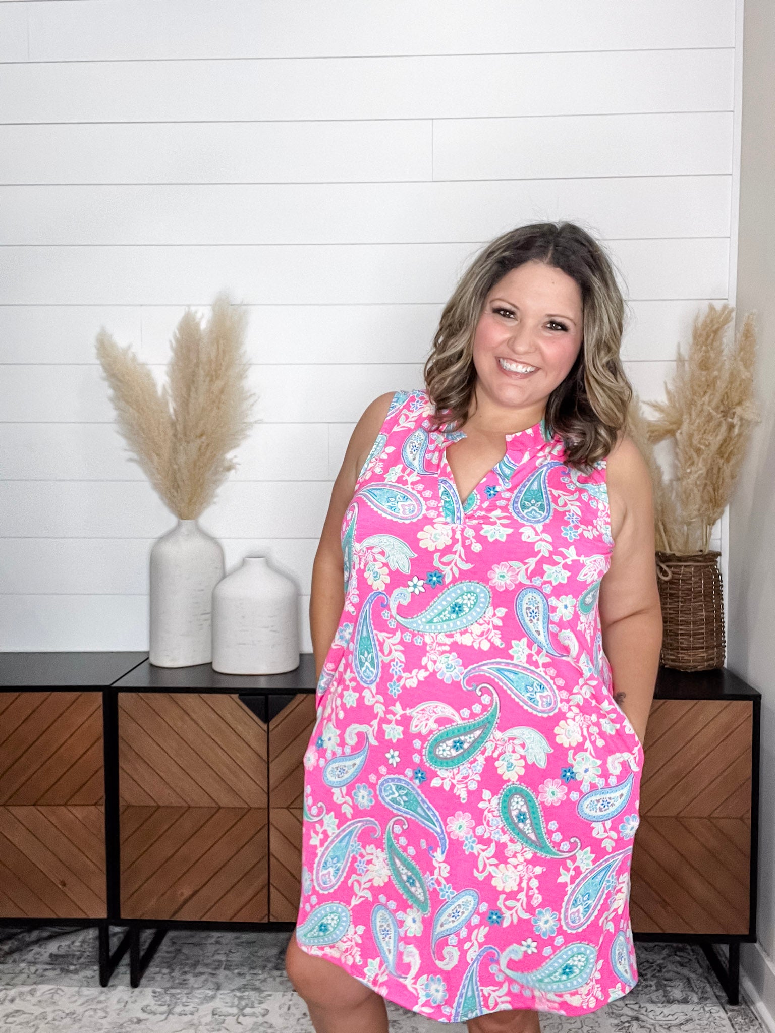 Introducing the "Struthers" Sleeveless Split Neck Dress with Pockets - the perfect addition to your wardrobe. Made with slinky stretchy fabric, this dress offers comfort and style. The hot pink base, paired with a unique paisley and floral design, will surely make a statement. Plus, pockets for added convenience!