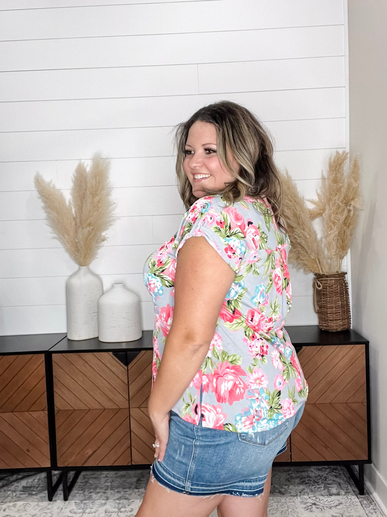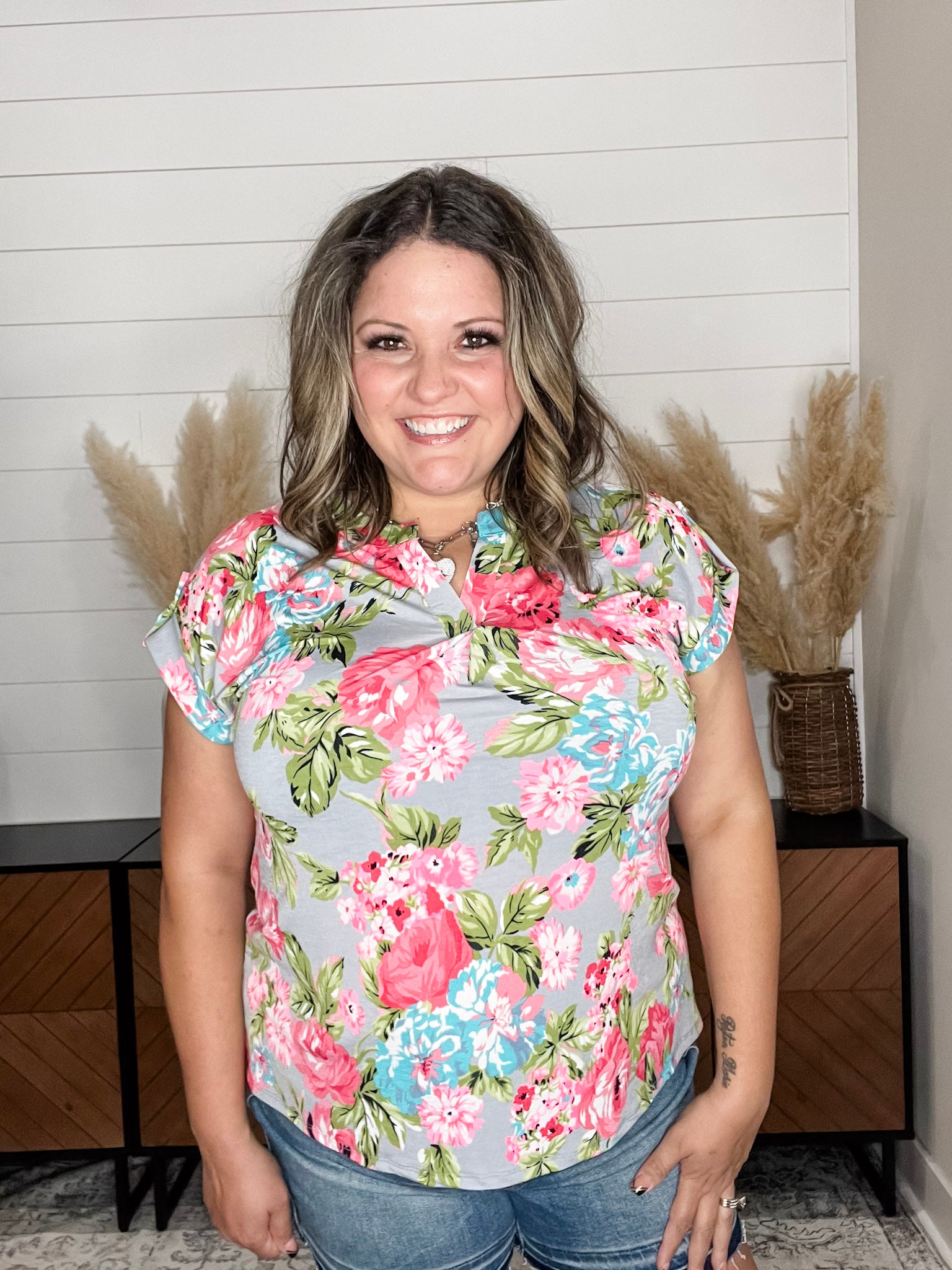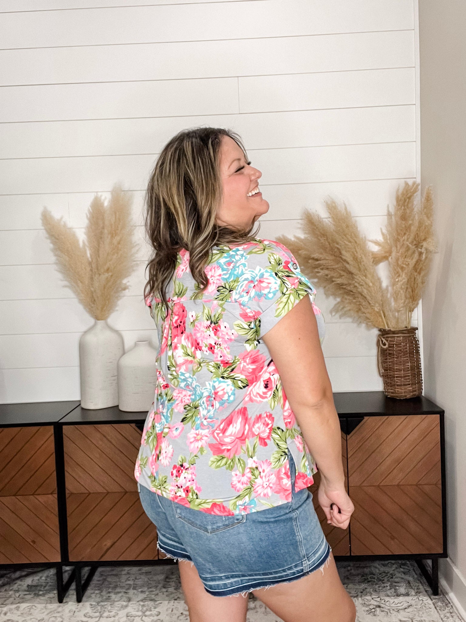 For optimum fit, it is recommended to select a size smaller than your usual size when purchasing the "Suspect" Split Neck Cuffed Short Sleeve by Dear Scarlett. The short sleeves add a stylish touch to the design, featuring a captivating large pink floral print on a complementary background.