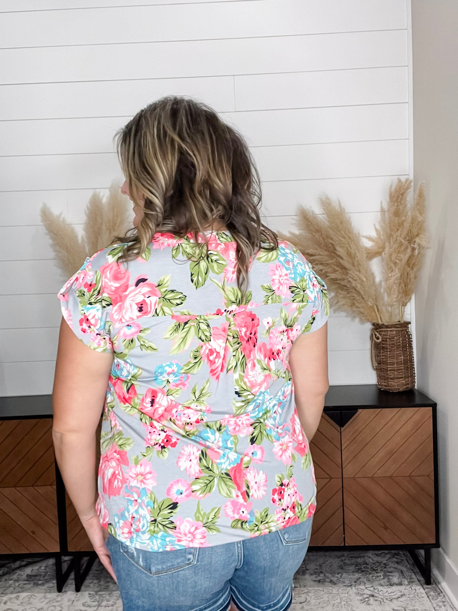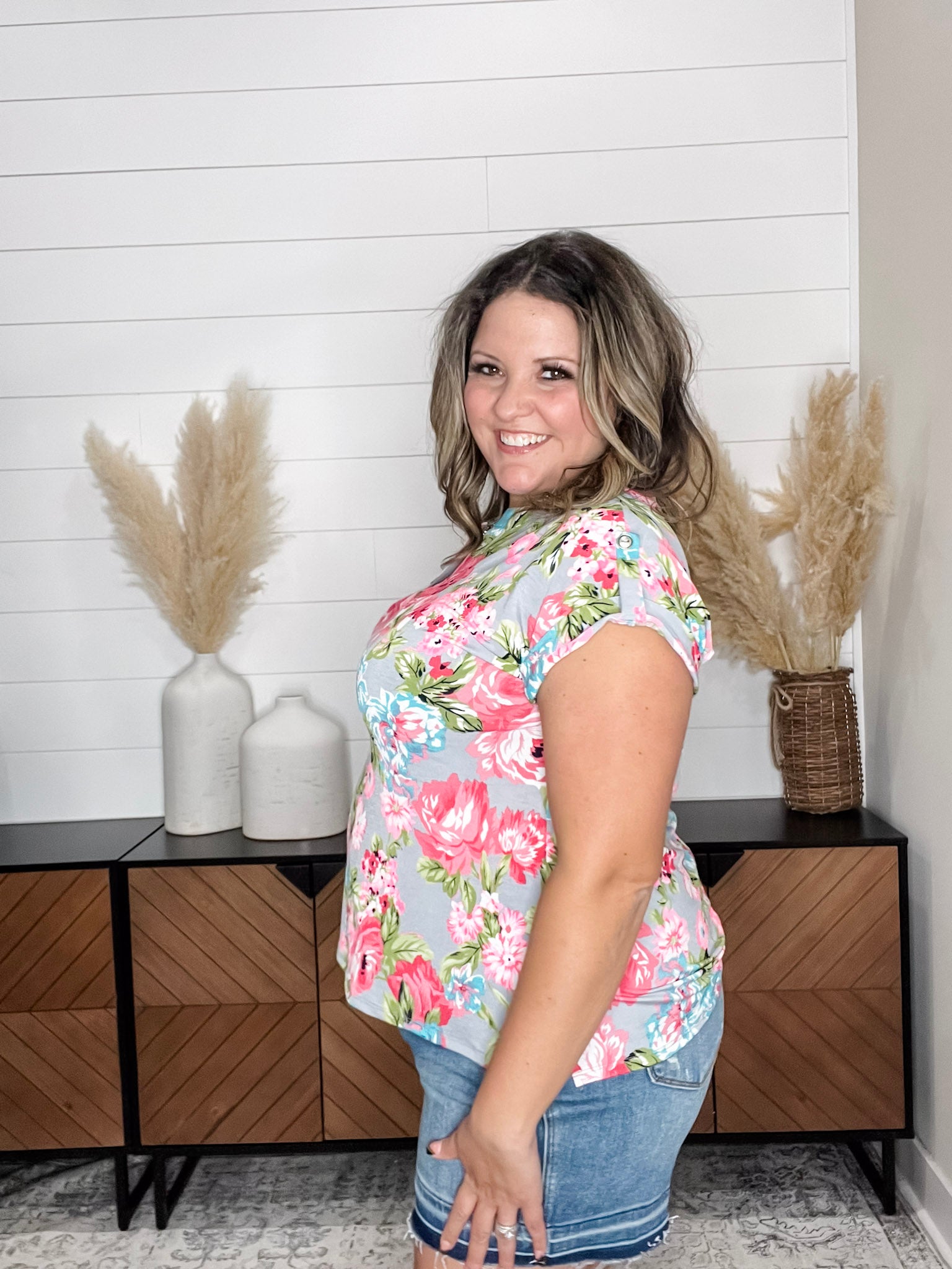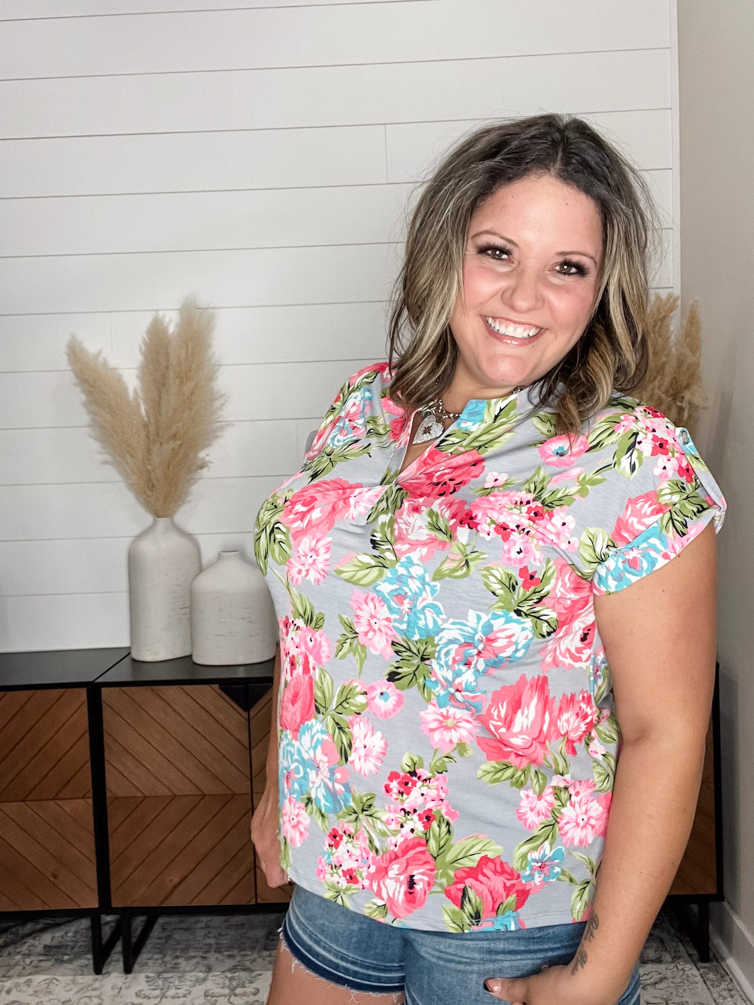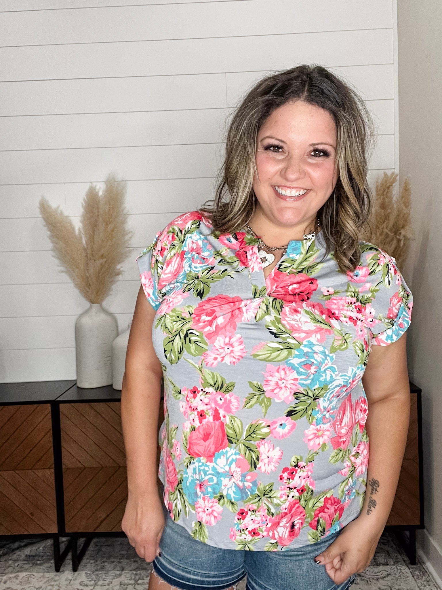 For optimum fit, it is recommended to select a size smaller than your usual size when purchasing the "Suspect" Split Neck Cuffed Short Sleeve by Dear Scarlett. The short sleeves add a stylish touch to the design, featuring a captivating large pink floral print on a complementary background.