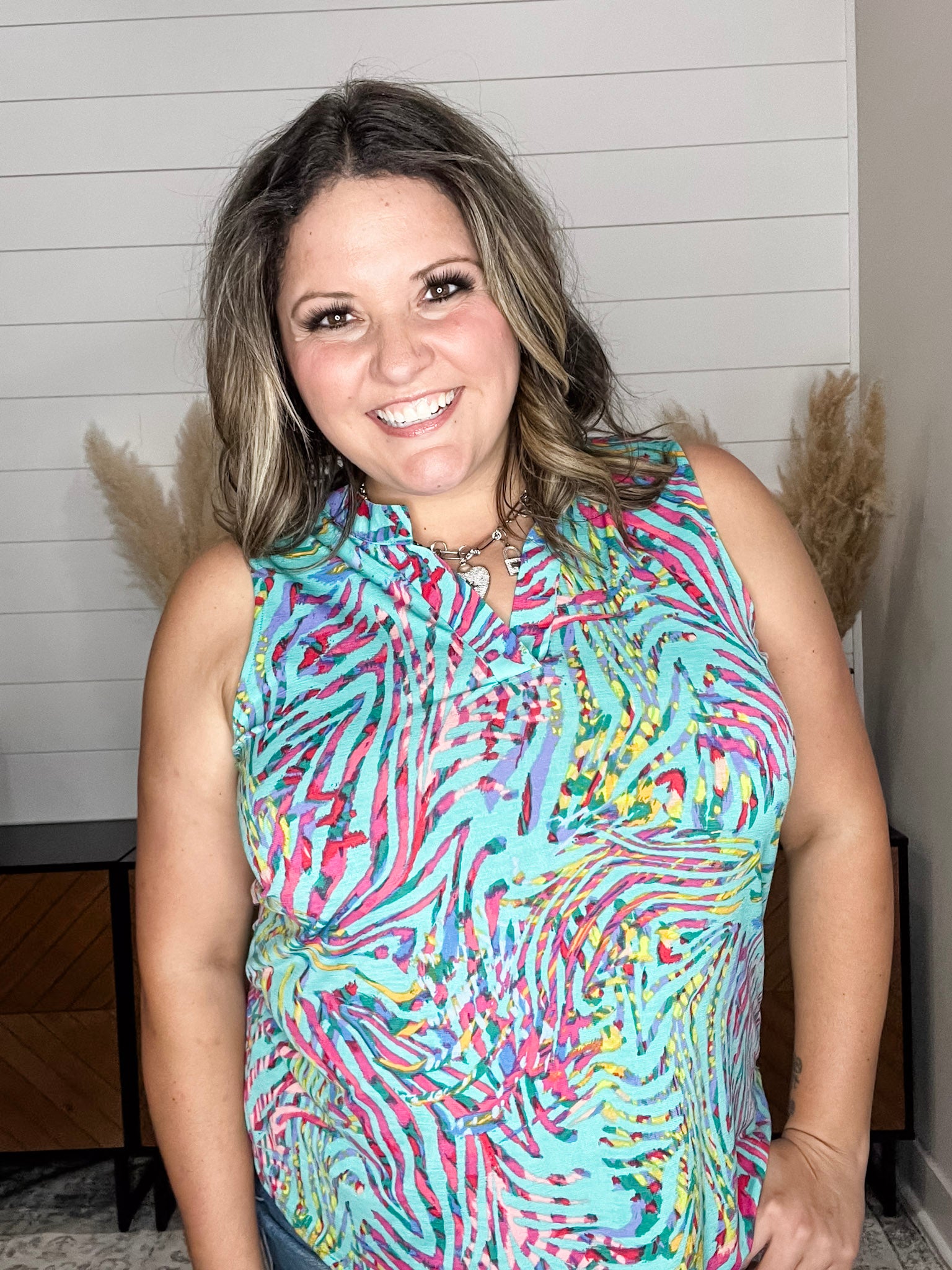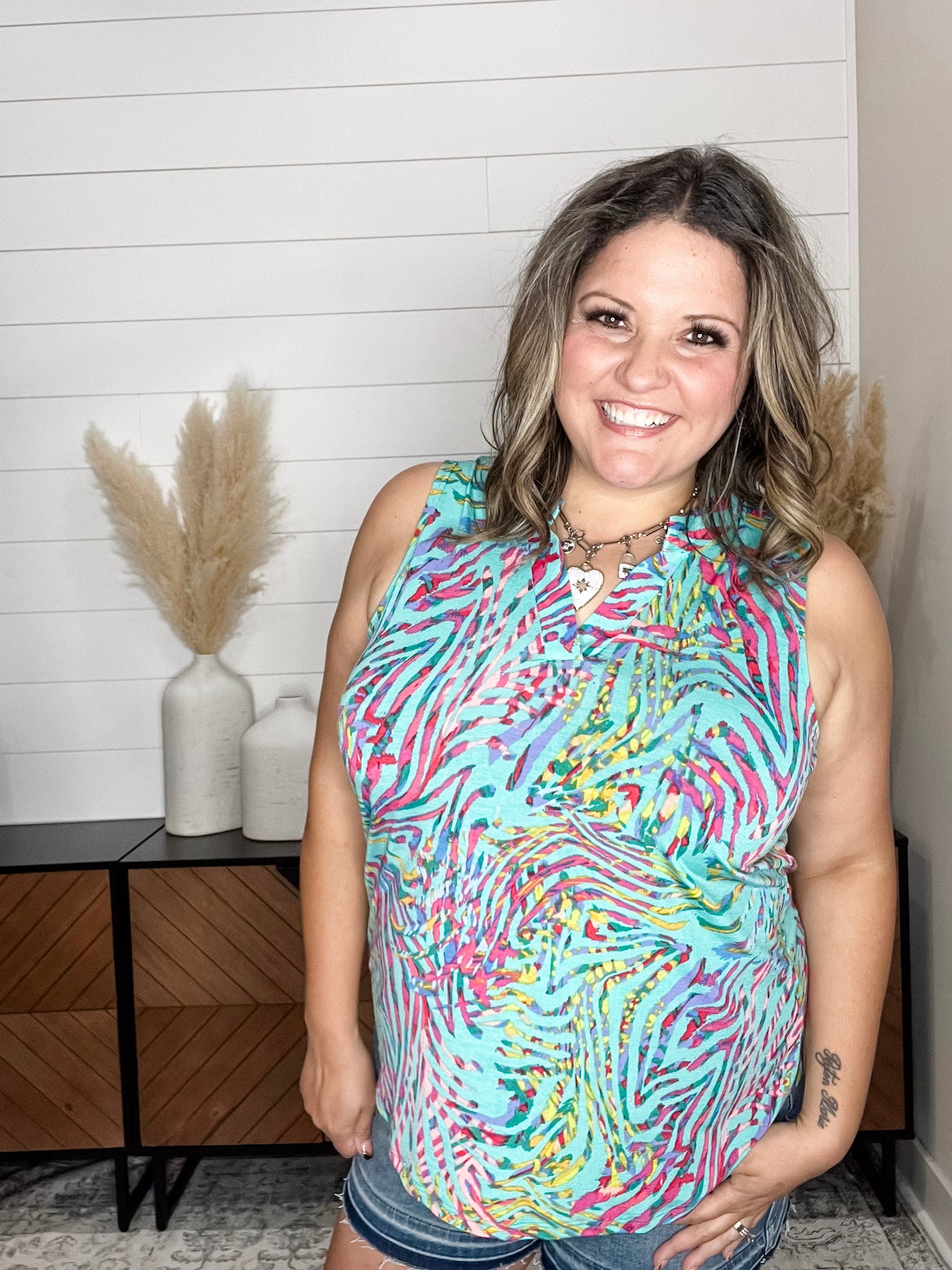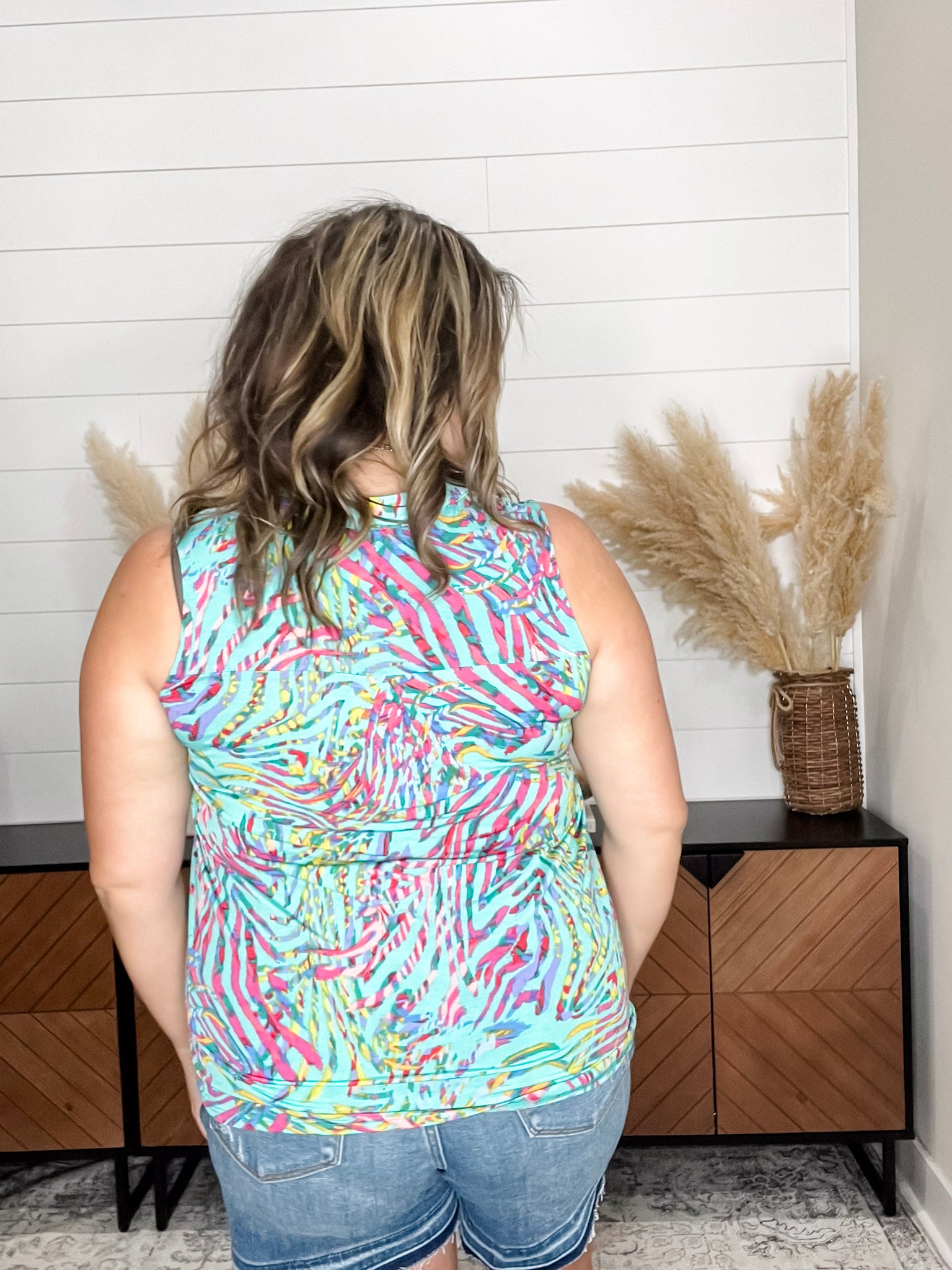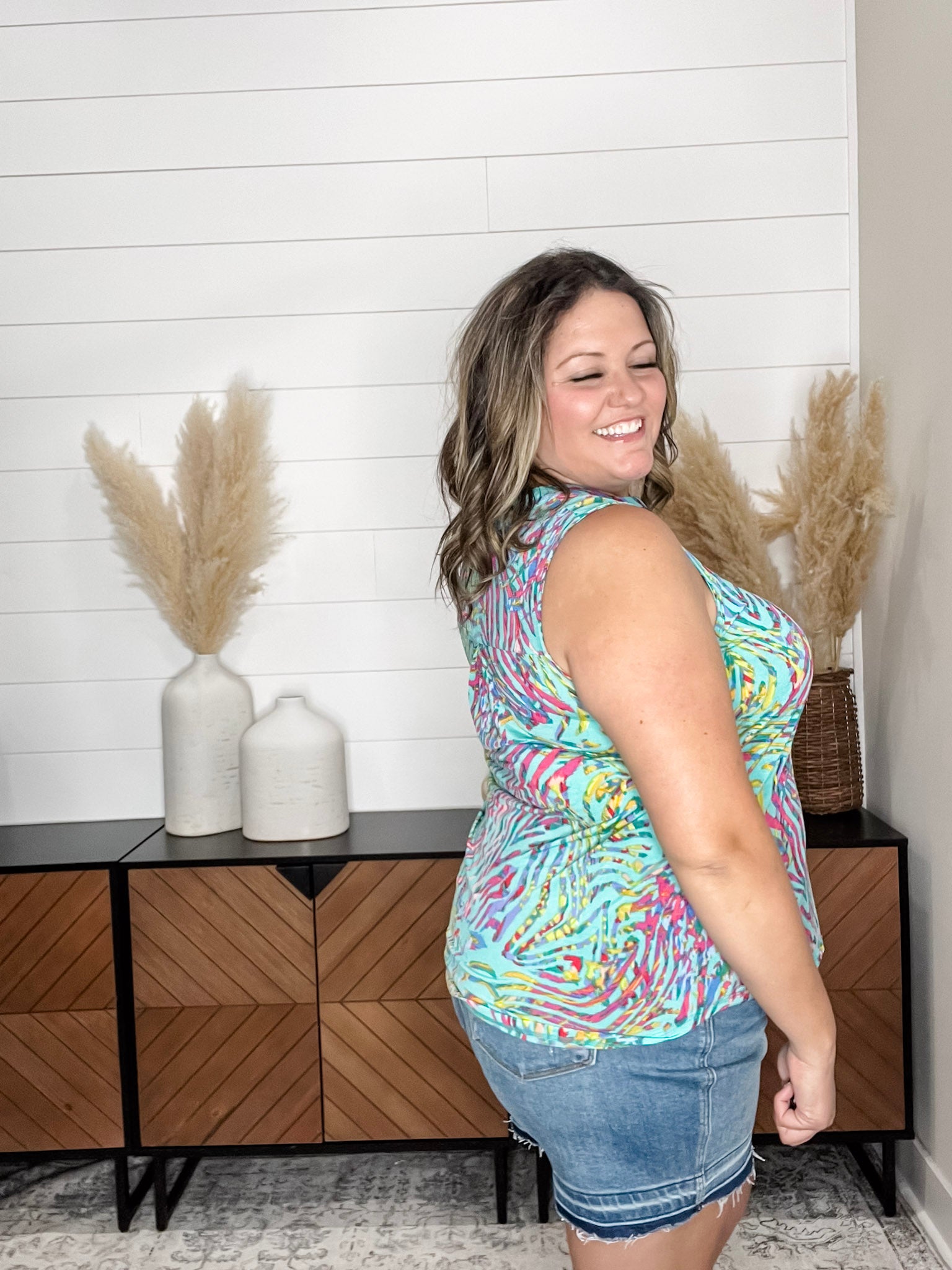 The "Tangled" Sleeveless Lizzy features a mandarin neckline and lapel, providing a sleek, sophisticated look. Made with slinky stretchy fabric, it is both comfortable and wrinkle-free. The wavy rainbow zebra-like pattern adds a unique touch. True to size and from the trusted Dear Scarlett brand.