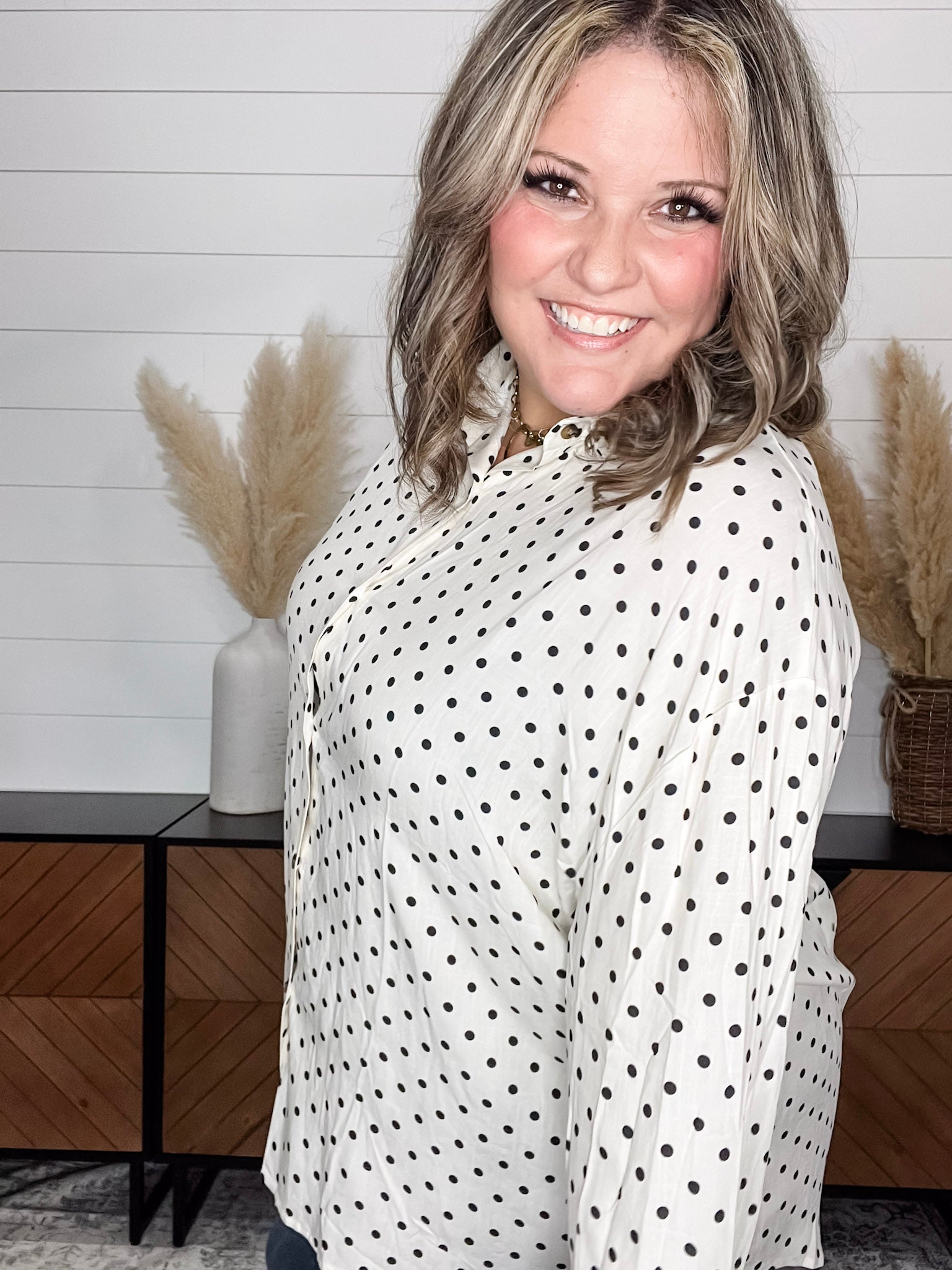 Add a touch of fun to your wardrobe with the "Temper" Polka Dot Button Up Long Sleeve. This lightweight shirt keeps you comfortable all day while its playful polka dot pattern brings lively charm to any look. Perfect for layering or wearing solo, it effortlessly blends casual ease with a quirky twist.