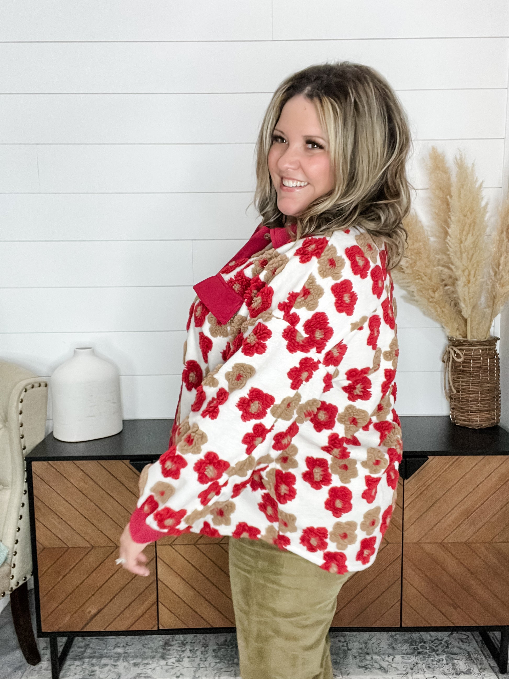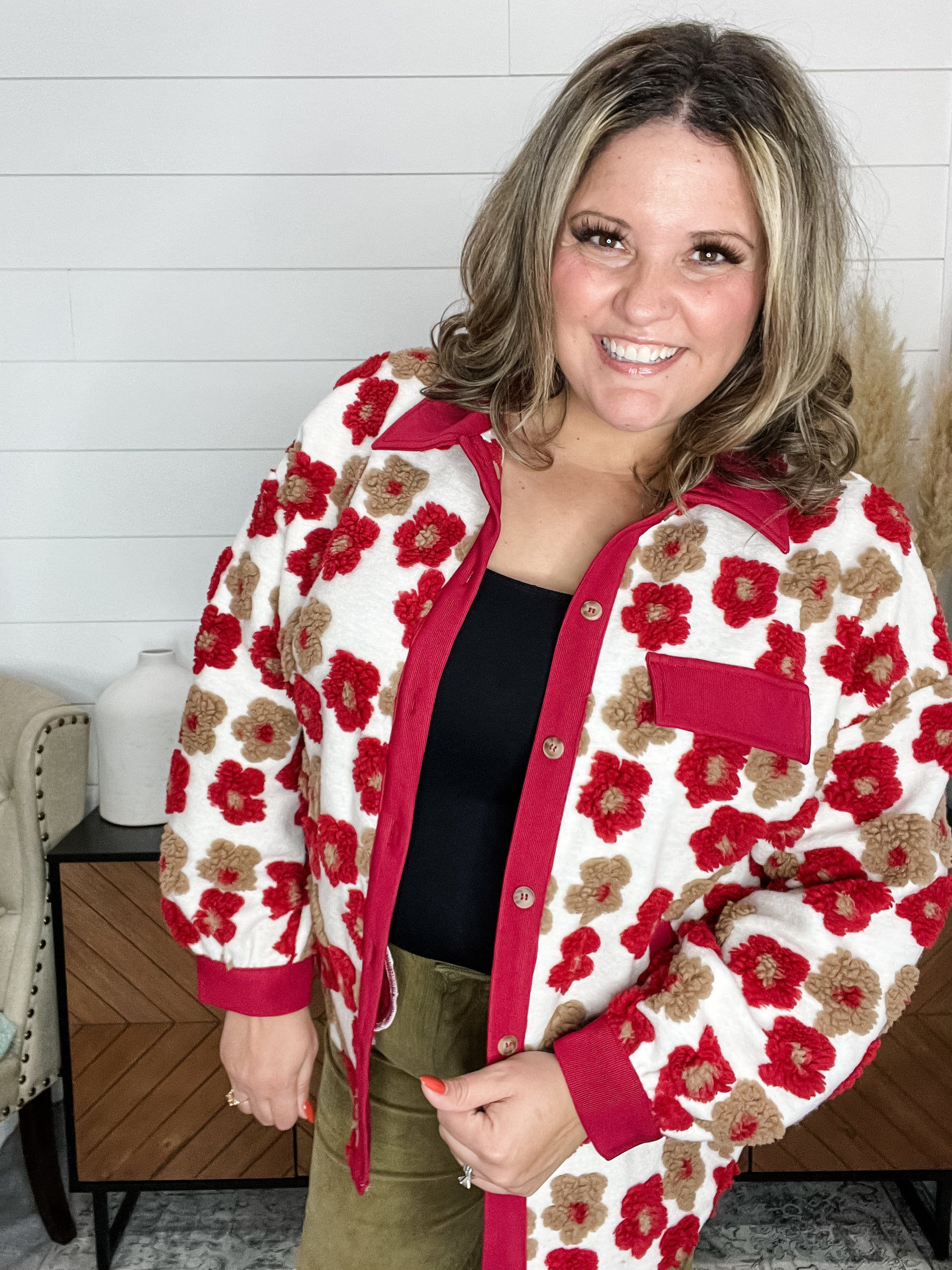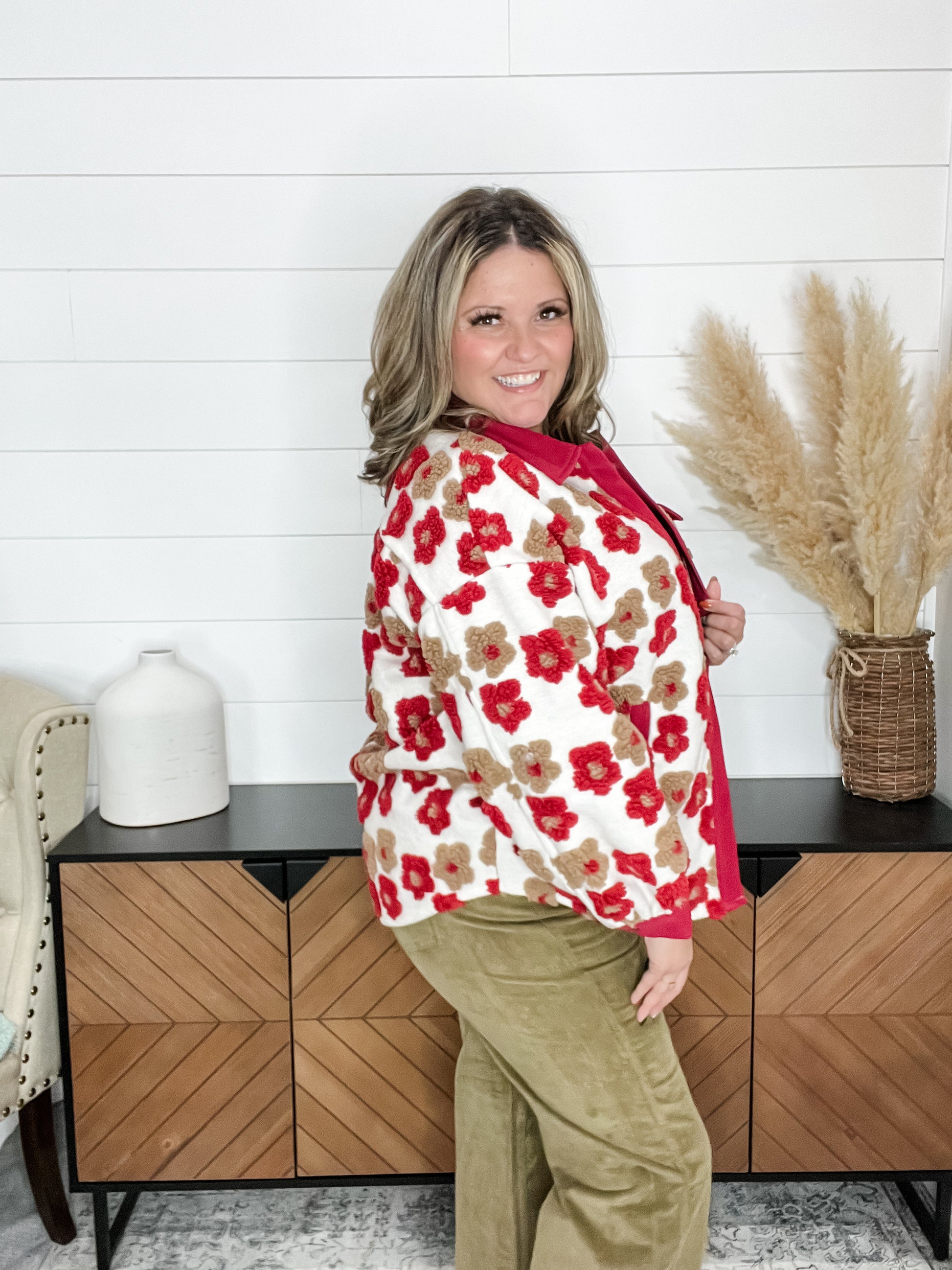 Wrap yourself in cozy charm with the "Thornhill" Floral Sherpa Shacket. This playful layering piece blends rich burgundy, brown, and cream hues with soft sherpa fabric, offering warmth and style in one. With handy pockets perfect for stashing little essentials, it’s the ideal companion for spontaneous outdoor adventures or relaxed days in. Embrace comfort and a splash of floral fun wherever you go!