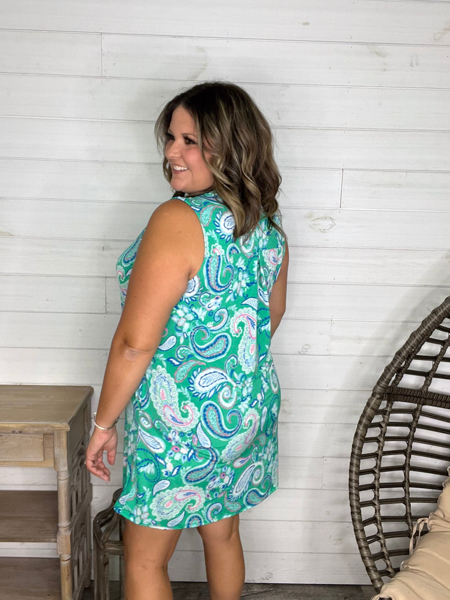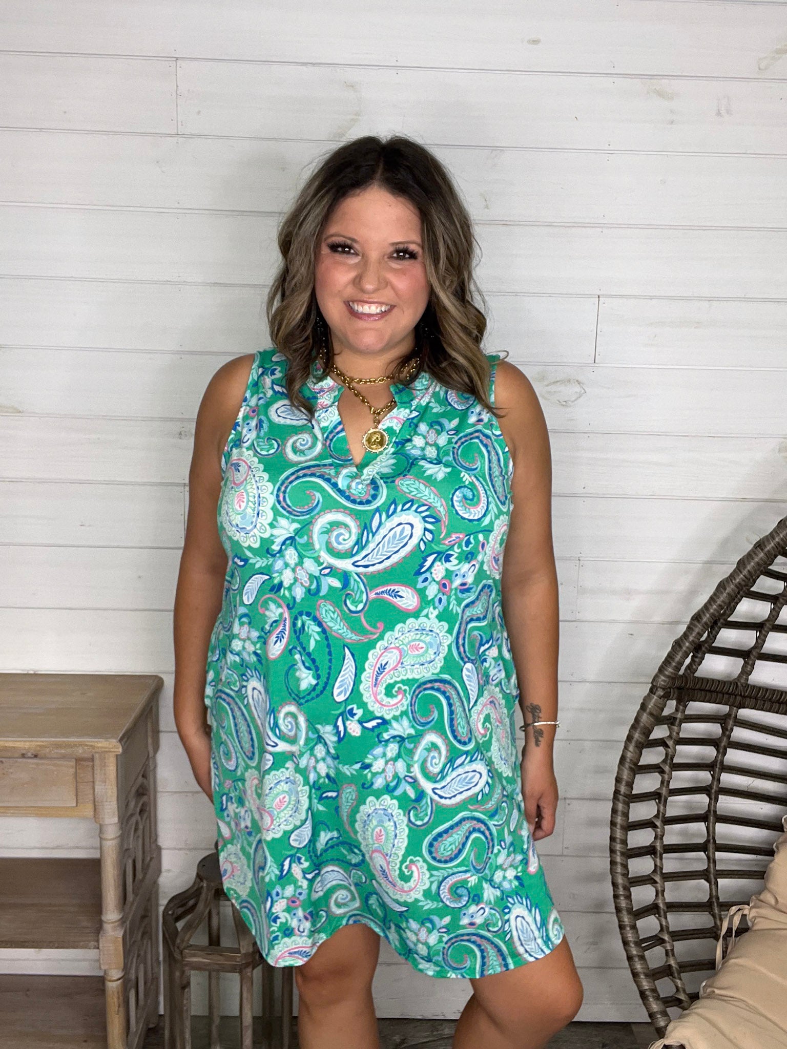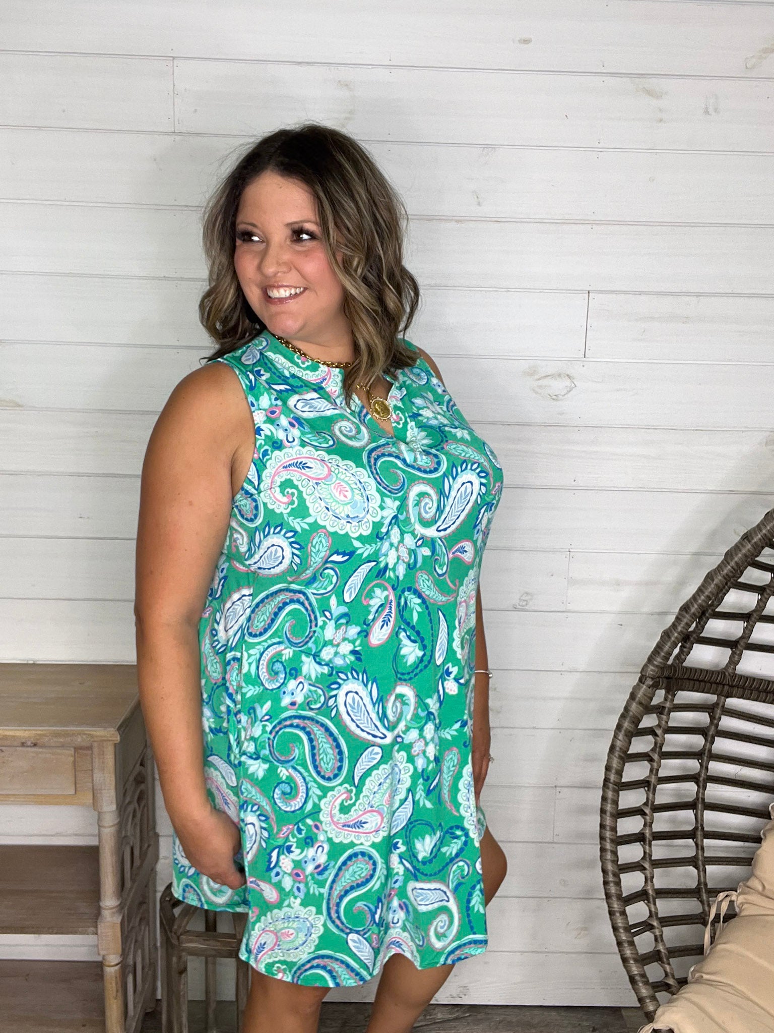 The "Tilapia" Sleeveless Split Neck Dress with Pockets dazzles in a bold kelly green base, crafted from slinky, stretchy fabric that moves with you. True to size and effortlessly playful, this dress combines comfort with style—and those handy pockets add a fun, practical touch!