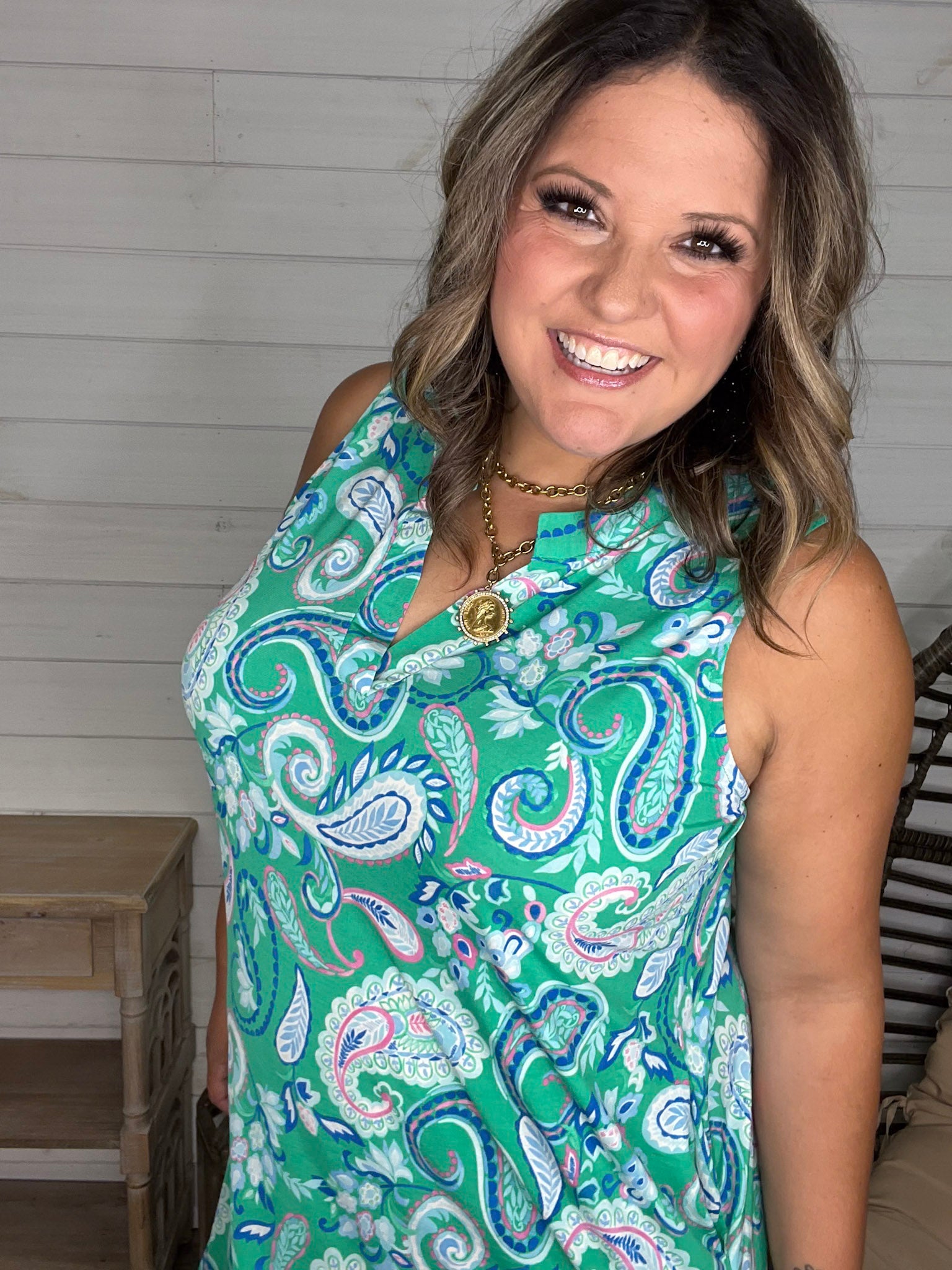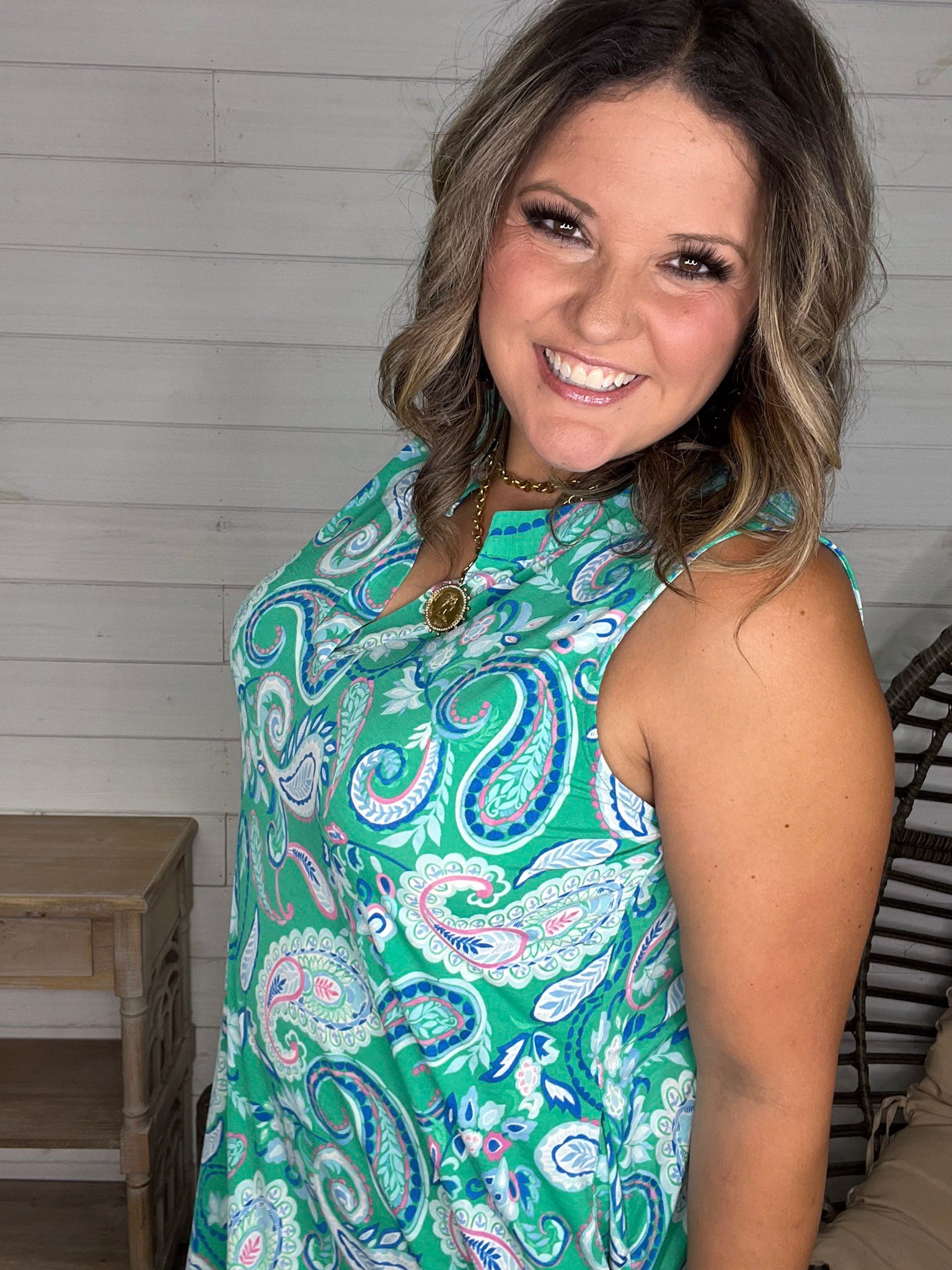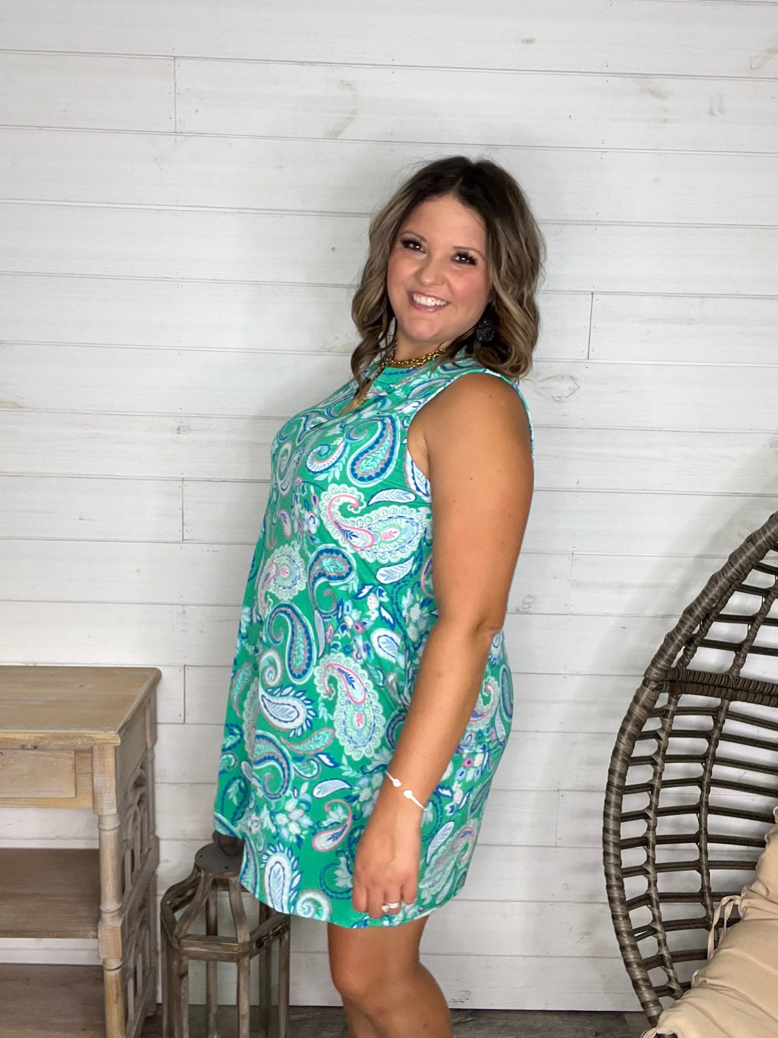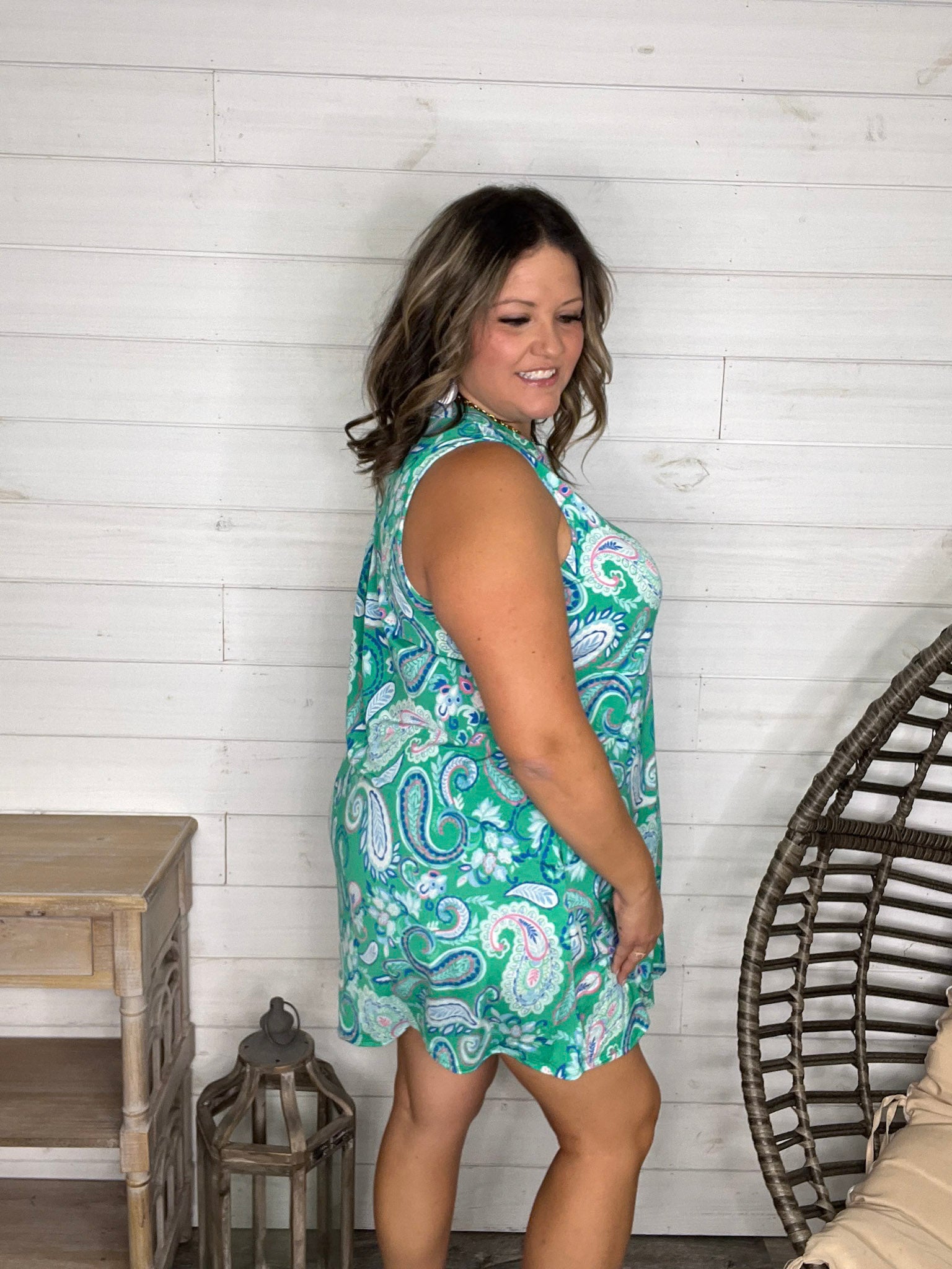 The "Tilapia" Sleeveless Split Neck Dress with Pockets dazzles in a bold kelly green base, crafted from slinky, stretchy fabric that moves with you. True to size and effortlessly playful, this dress combines comfort with style—and those handy pockets add a fun, practical touch!