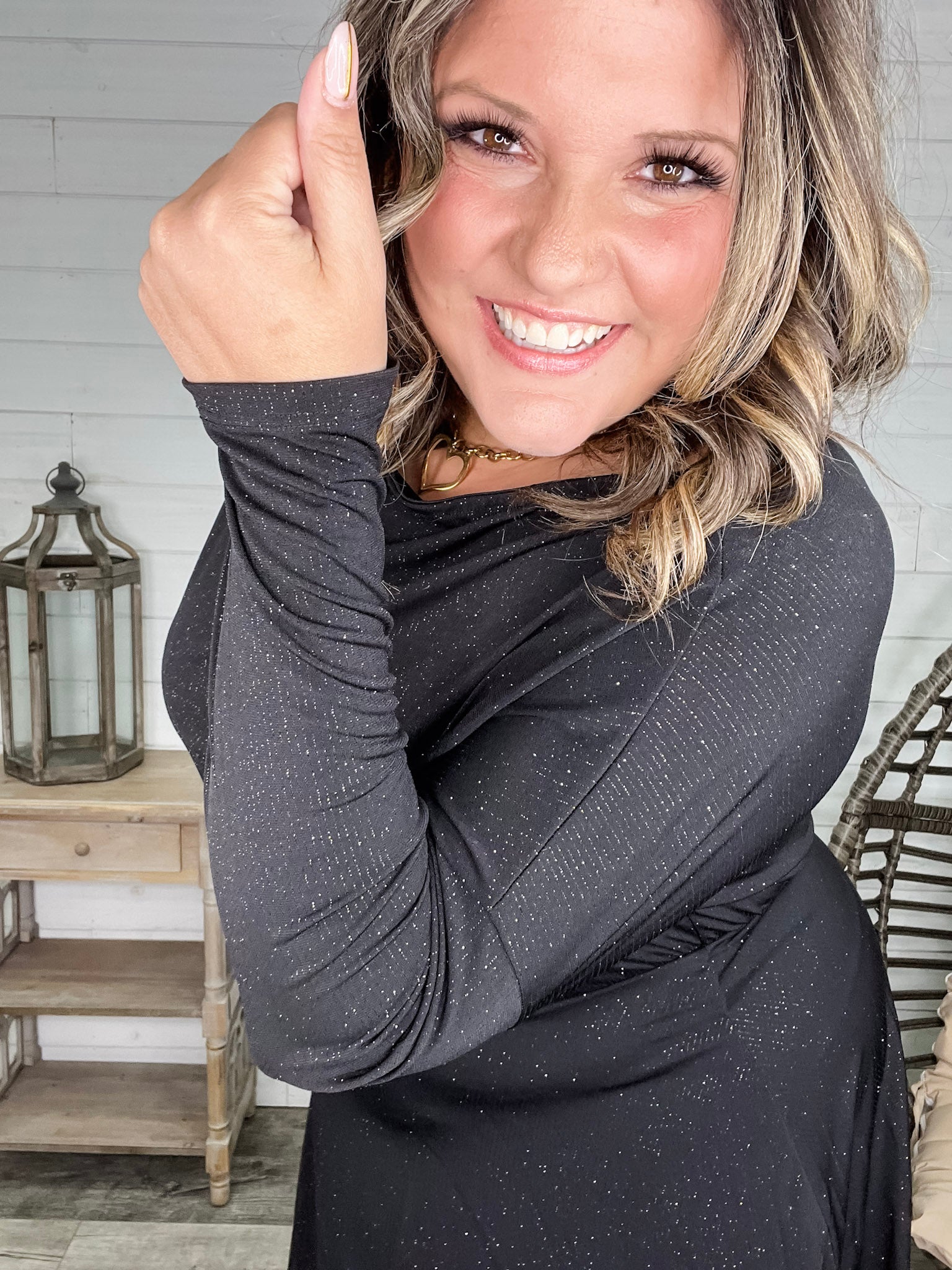 Step into sparkle and comfort with the "Tiny Dancer" Boat Neck Dress, featuring built-in shorts for carefree twirling. Ashley, wearing XL in black and 1X in forest, shows how sizing up adds extra tummy room. The attached shorts have a convenient button at the crotch—feel free to cut them out and pair the dress with leggings or tights for versatile style. Perfect for dancing through your day with a playful shine!