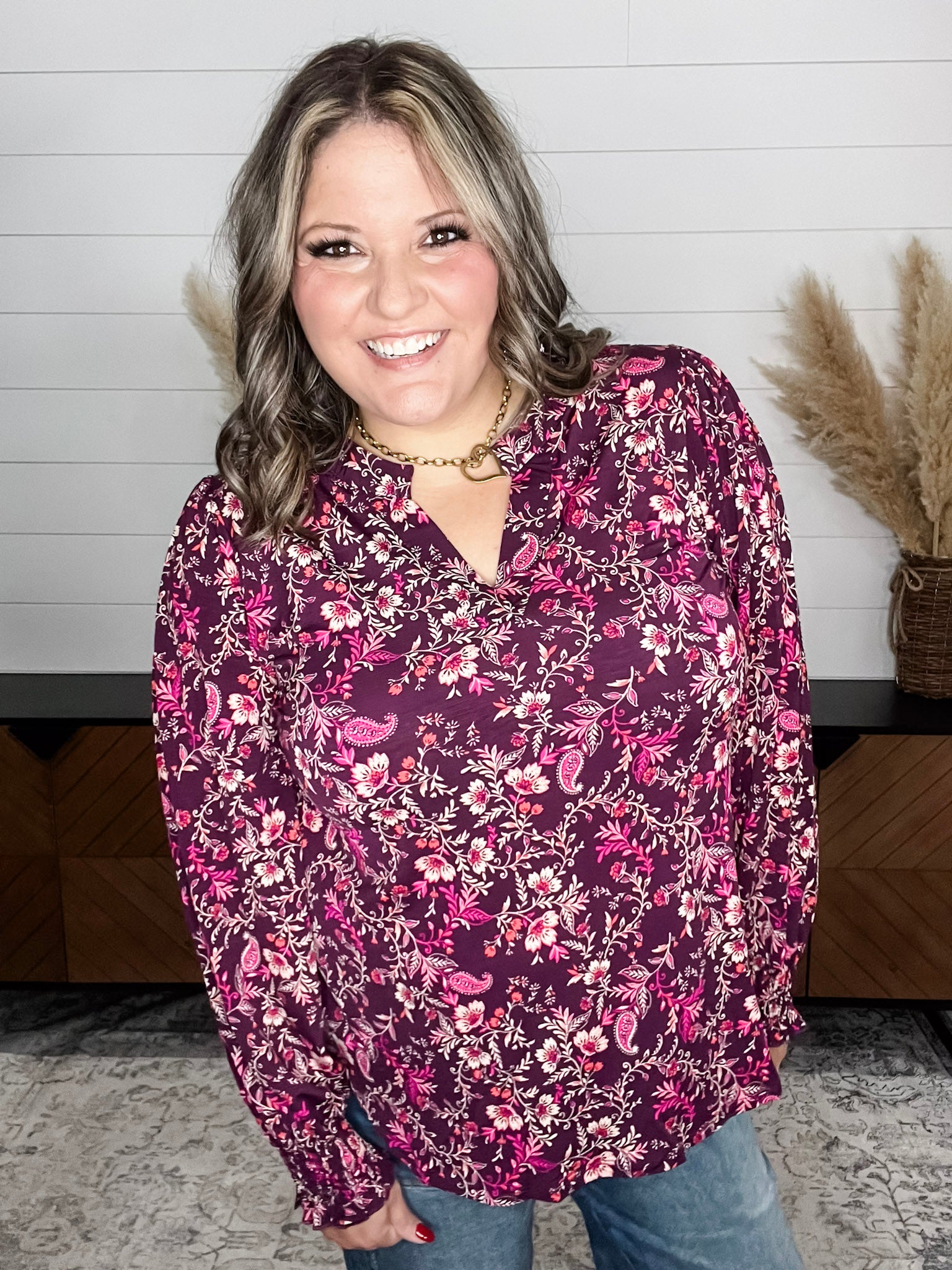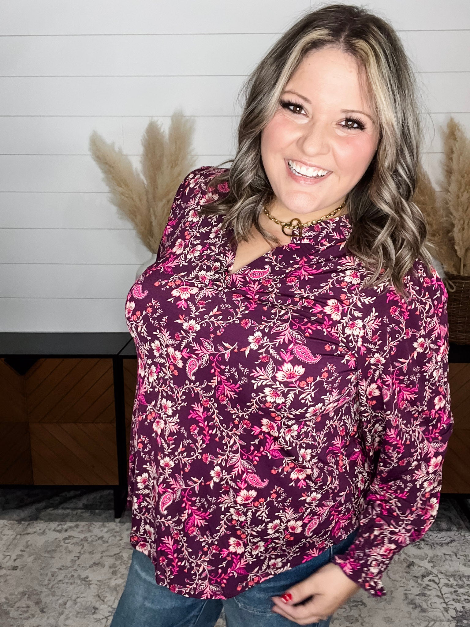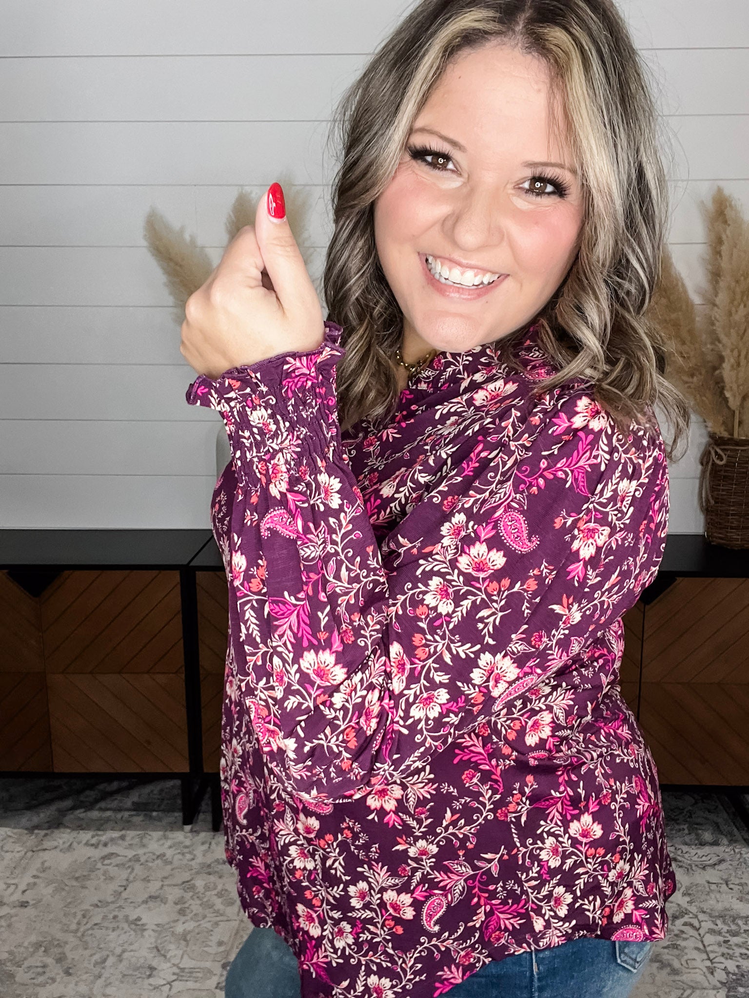 Get cozy and chic with the "Titanium" Smocked Wrist Long Sleeve Split Neck top. Its slinky, stretchy fabric feels like a second skin—just remember to size down one for the perfect fit. Featuring a rich wine base, this playful piece adds a splash of color and style to any outfit.