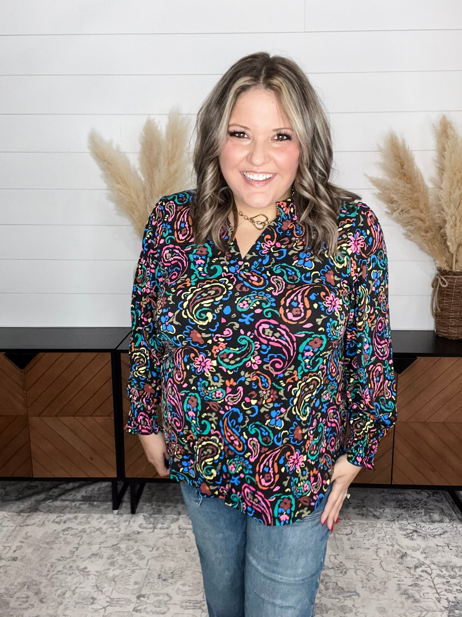 "Tungsten" Lizzy Smocked Wrist Long Sleeve Split Neck