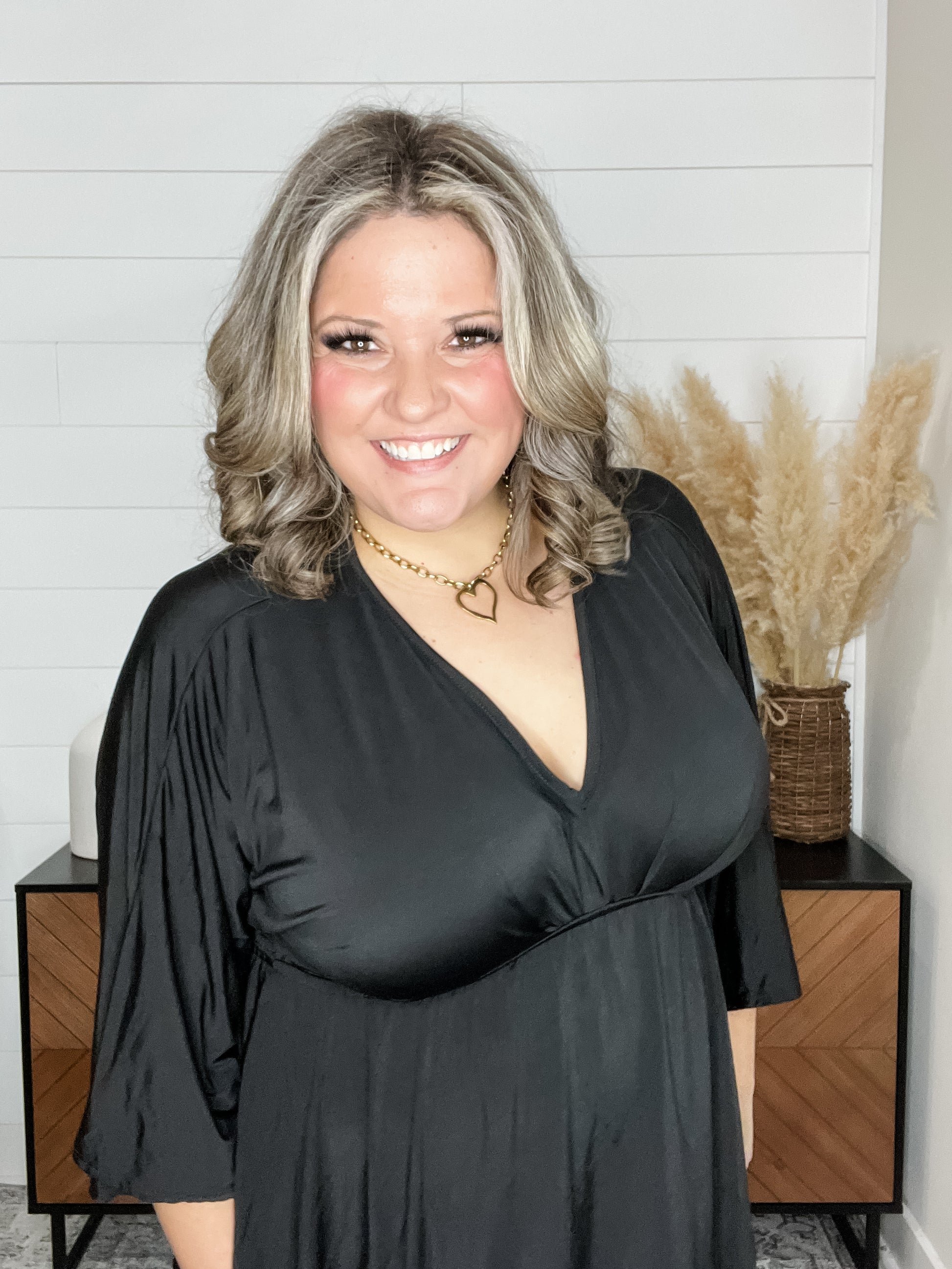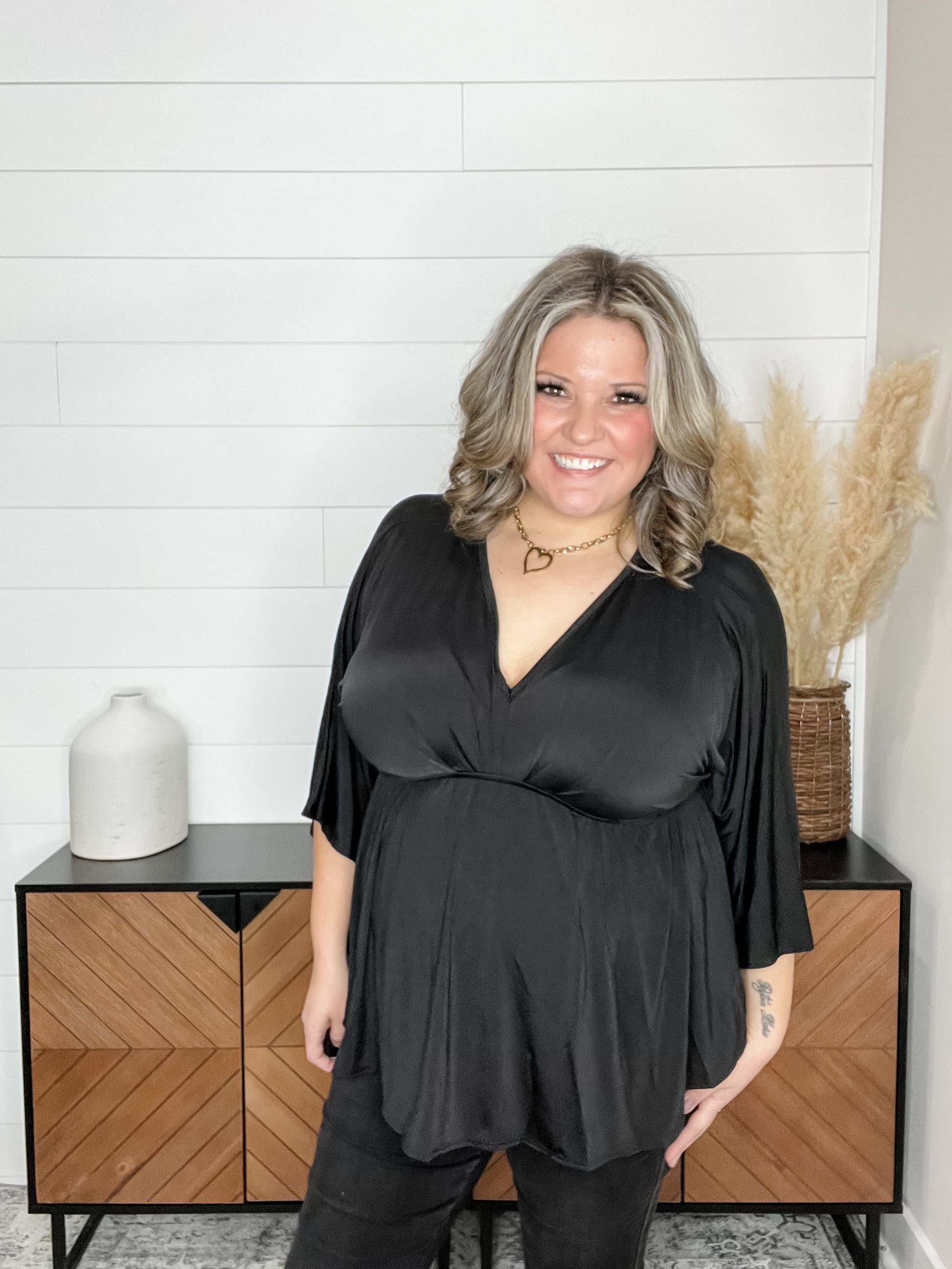 This "Undertaking" 3/4 Sleeve V Neck top in sleek black hugs your curves with its slinky, stretchy fabric and elastic empire waist for a flattering fit. True to size and effortlessly chic, it’s perfect for turning heads while keeping you comfy all day long.