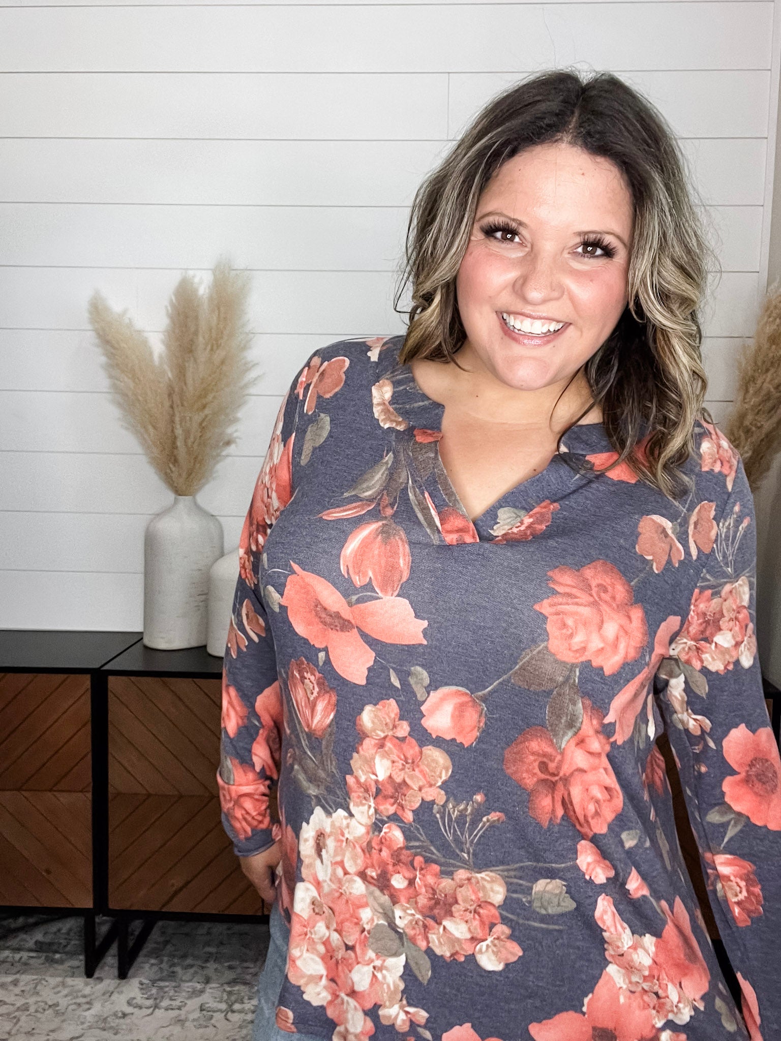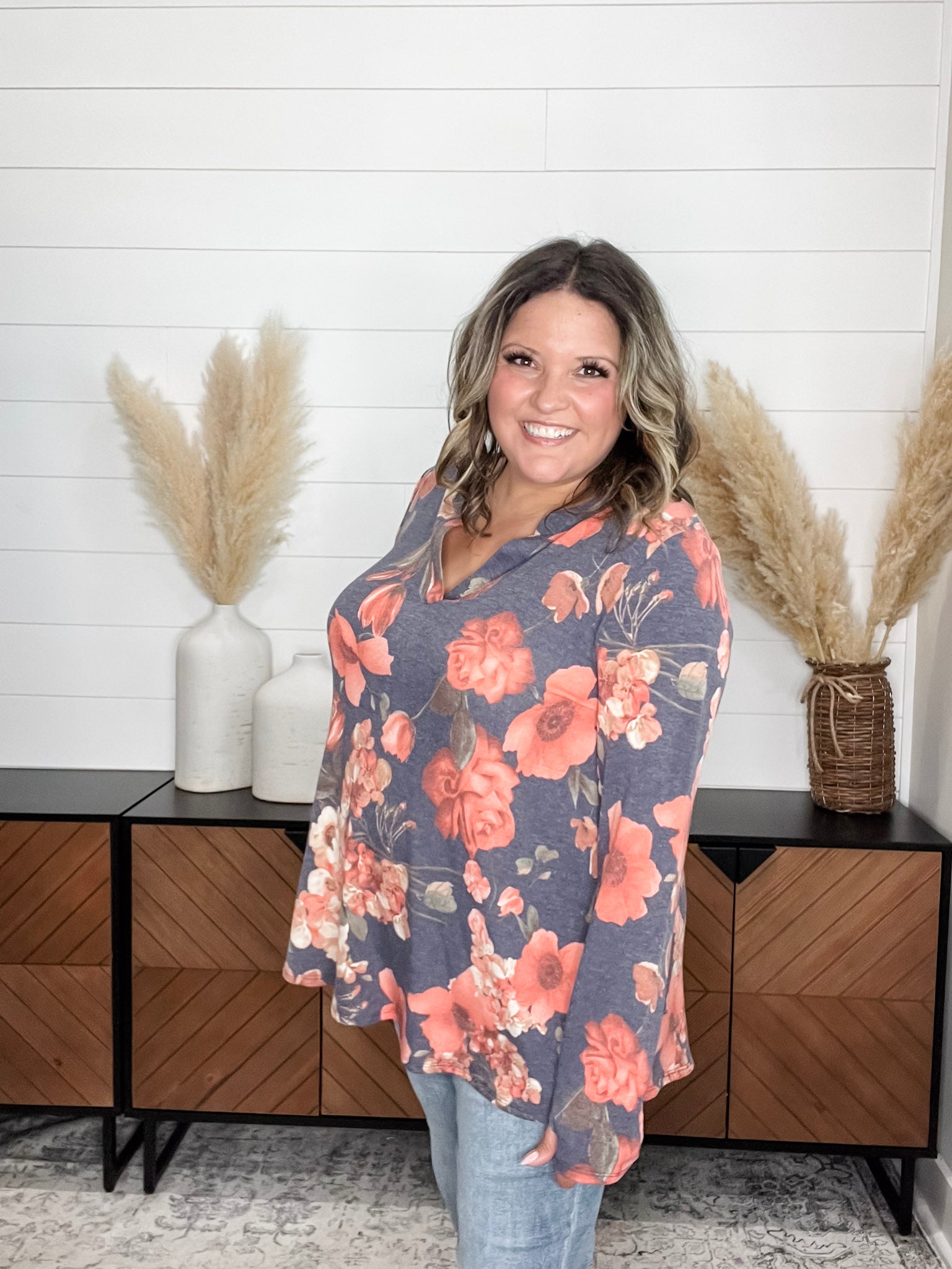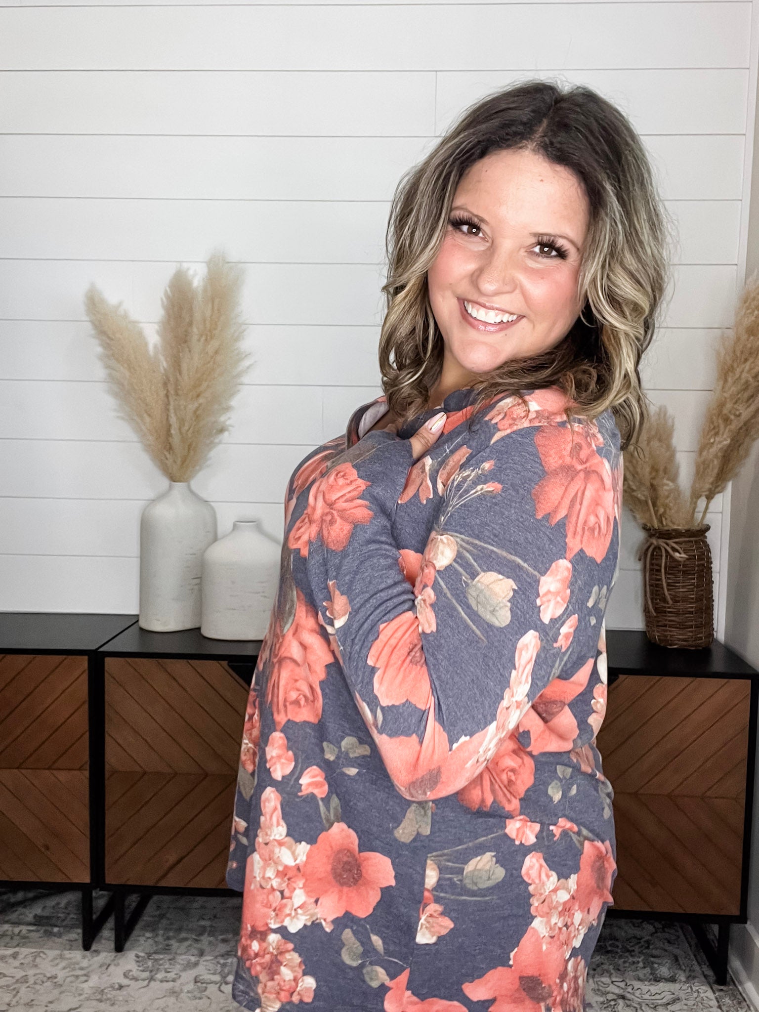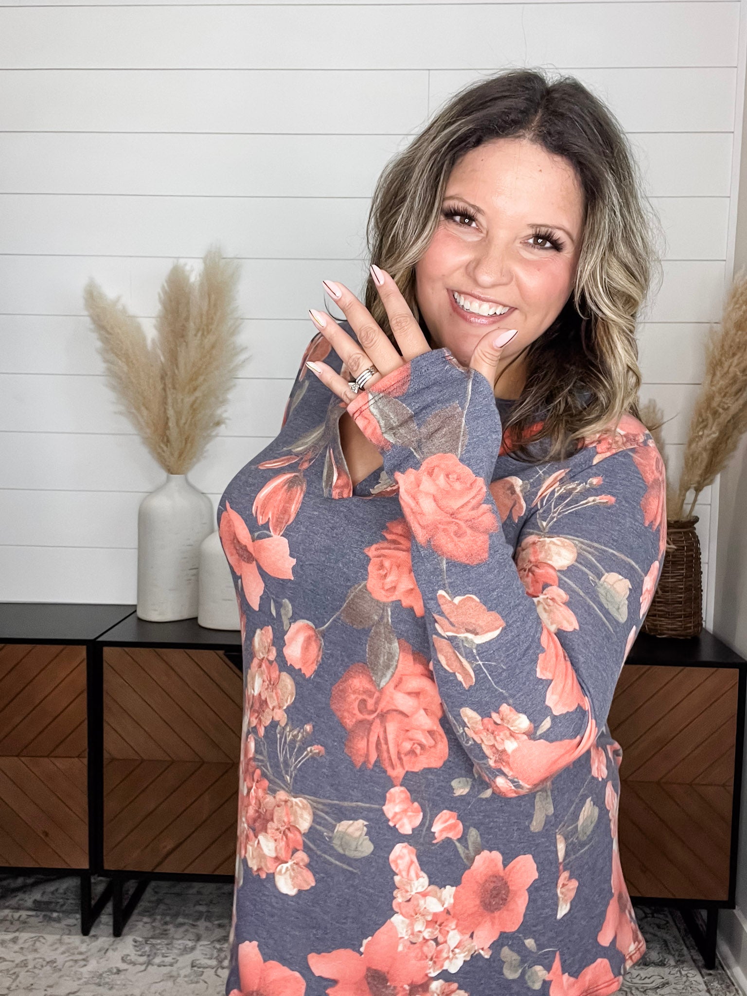Cozy up in the "Walk Away" Floral Long Sleeve Split Neck, crafted from soft terry material for ultimate comfort. Its playful floral design and relaxed fit invite you to size down one for a perfectly snug, flattering look that’s ready for any casual adventure.