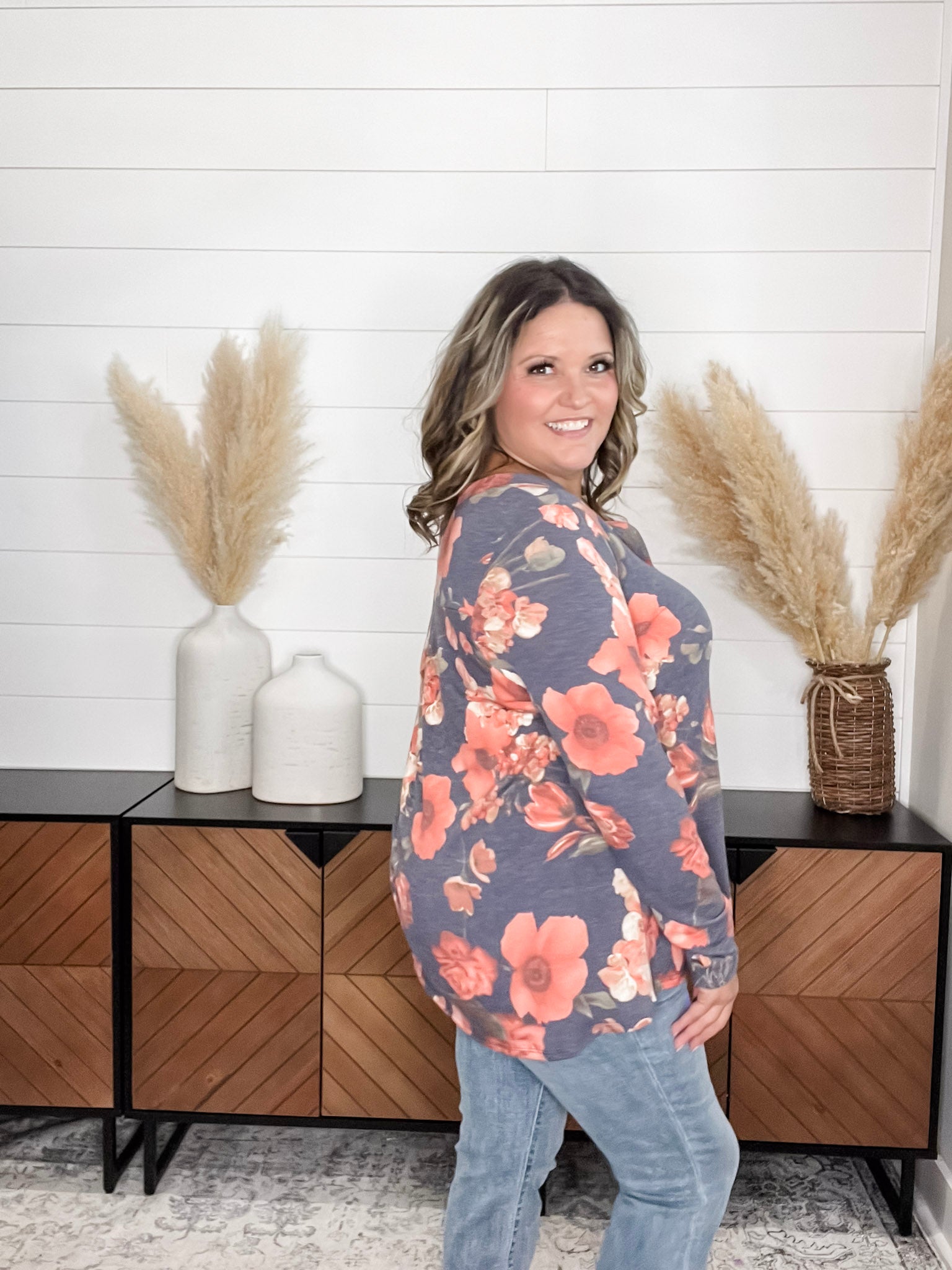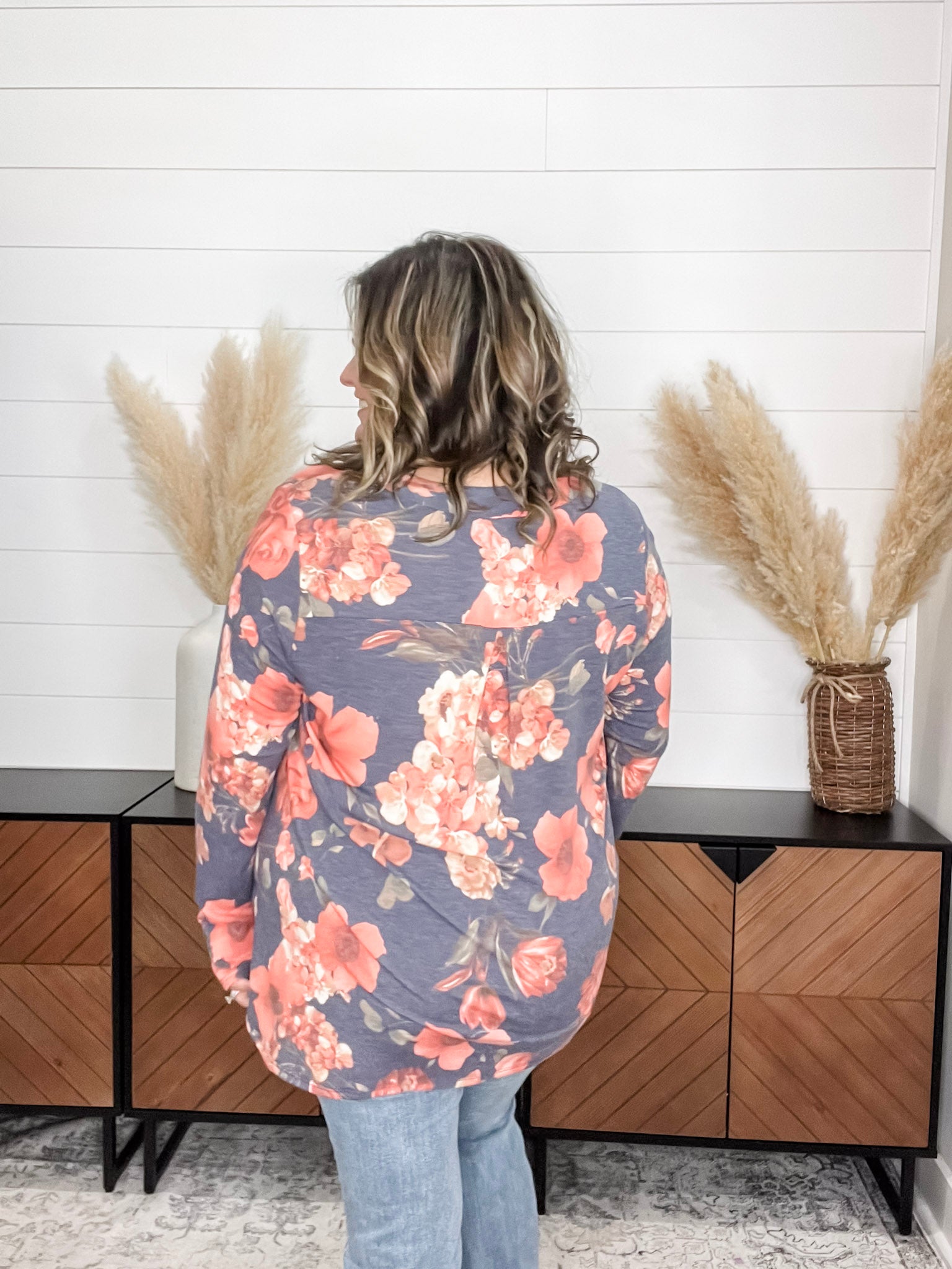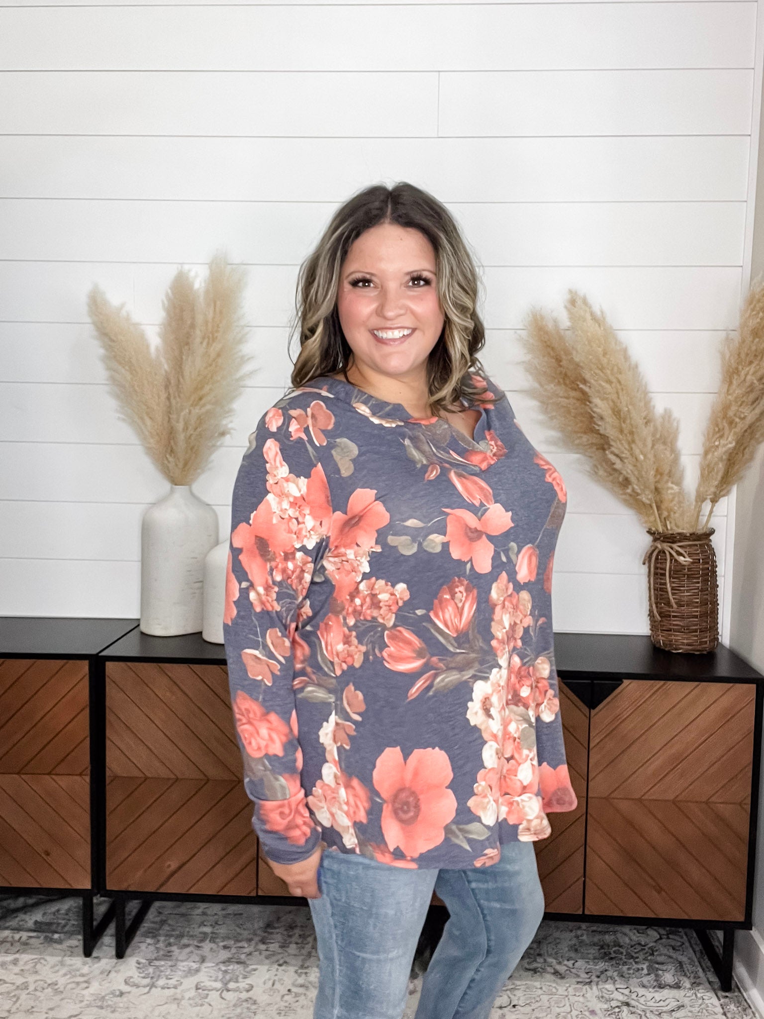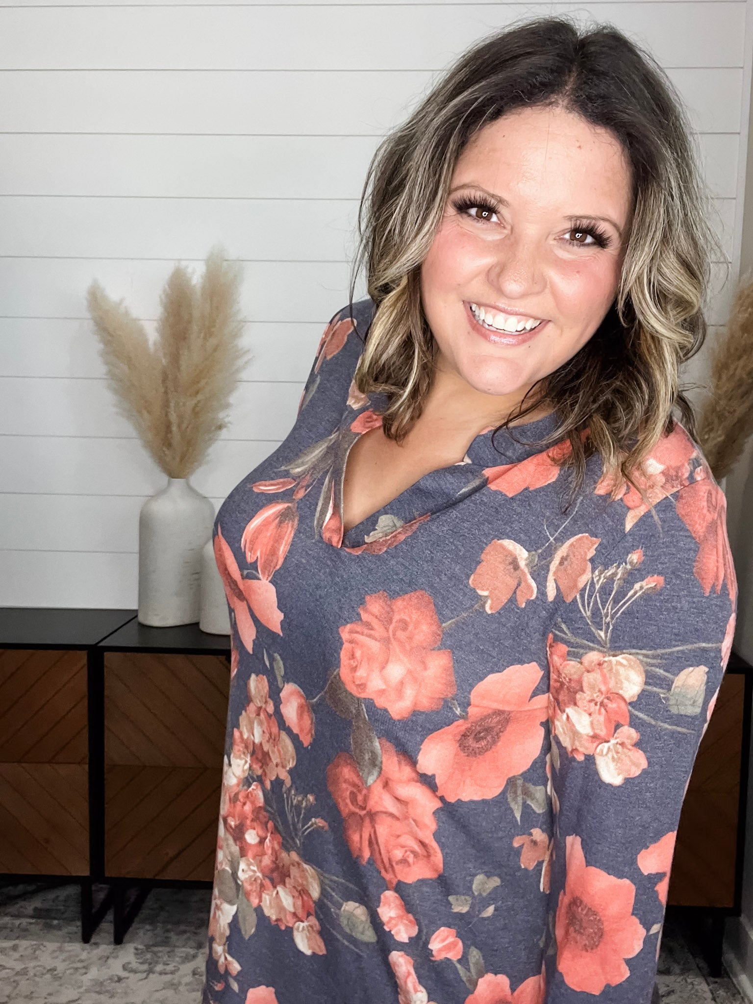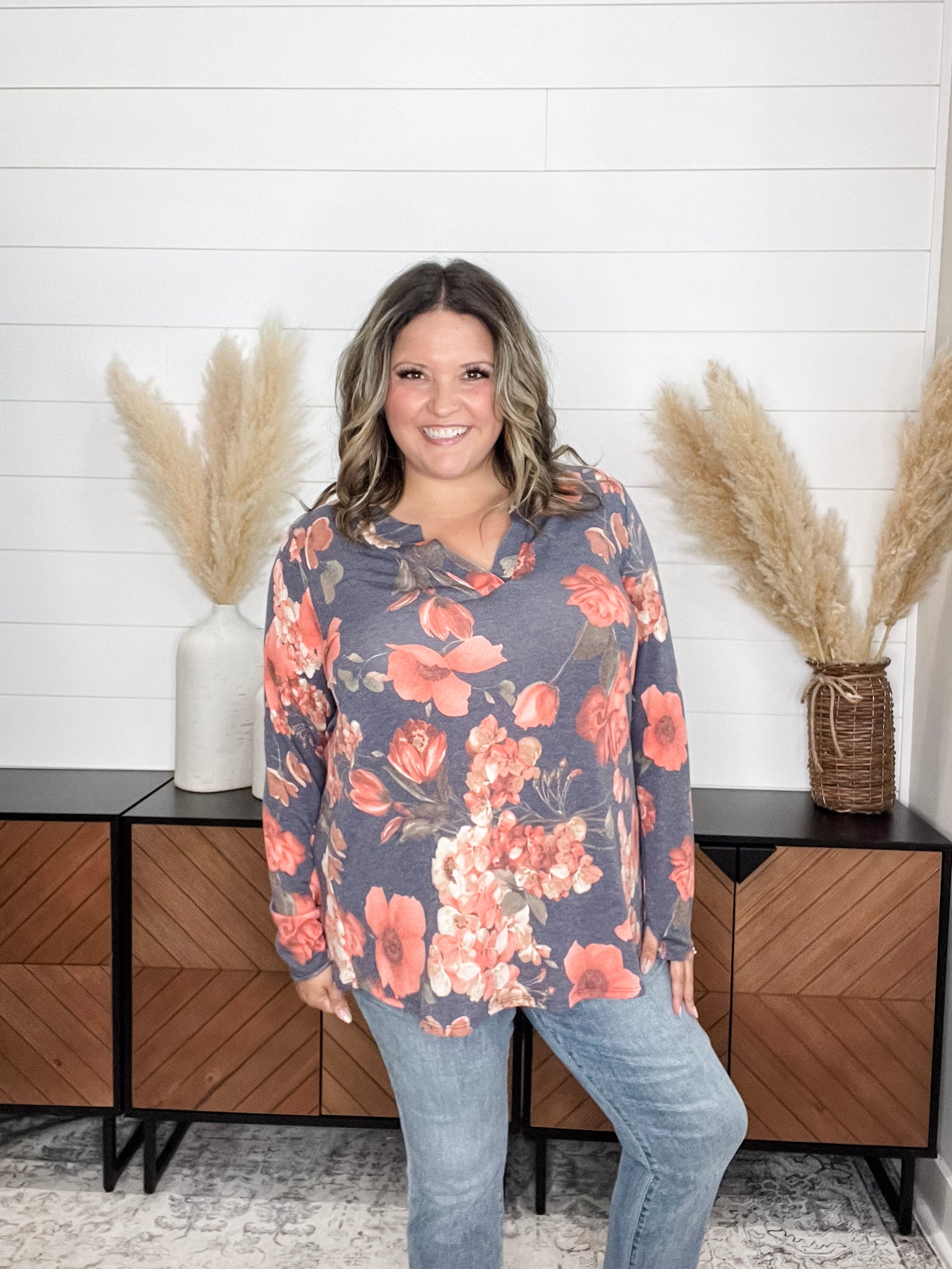 Cozy up in the "Walk Away" Floral Long Sleeve Split Neck, crafted from soft terry material for ultimate comfort. Its playful floral design and relaxed fit invite you to size down one for a perfectly snug, flattering look that’s ready for any casual adventure.