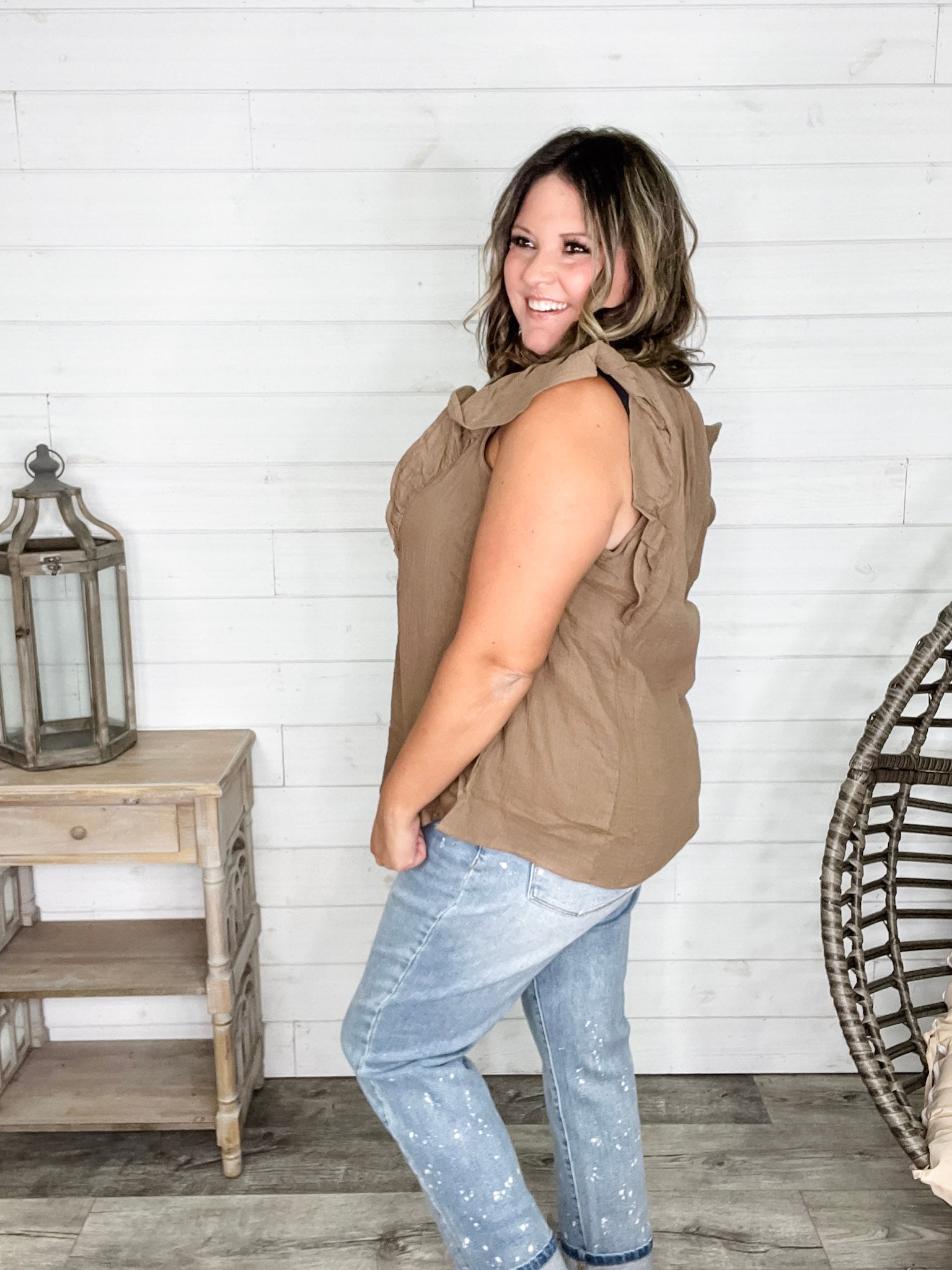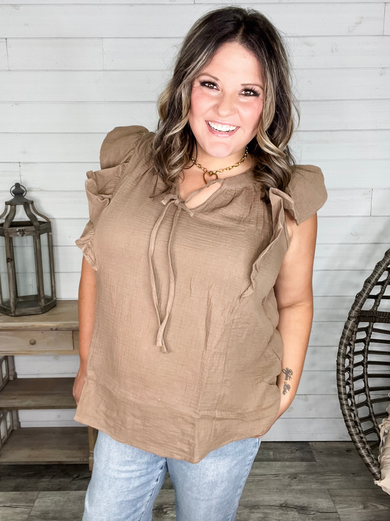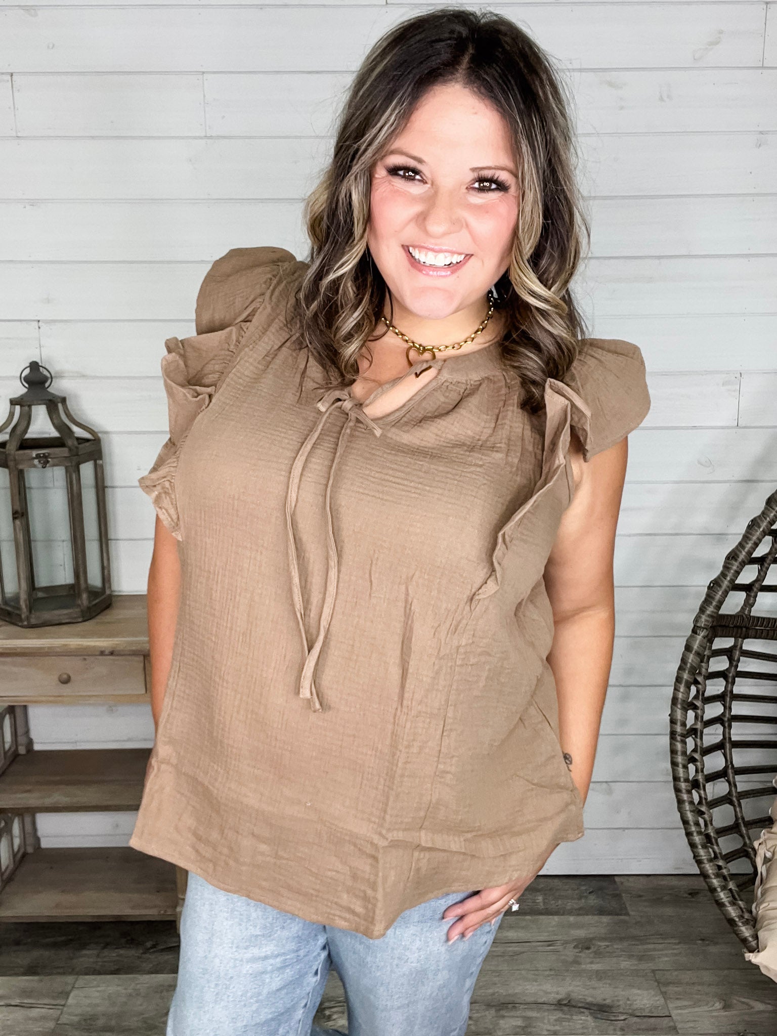 "Wheatland" Ruffle Cap V Neck with Tie Detail (Mocha)