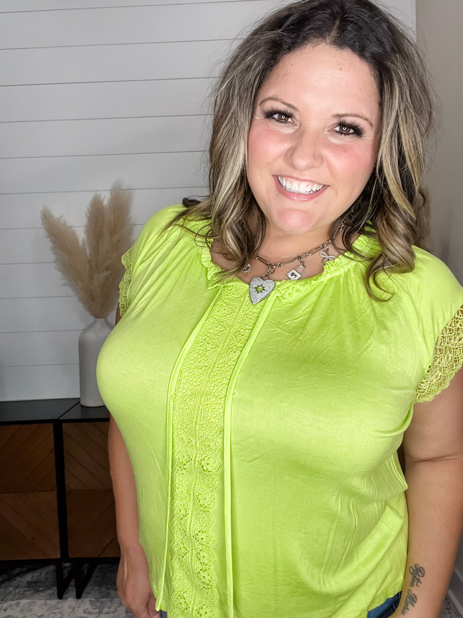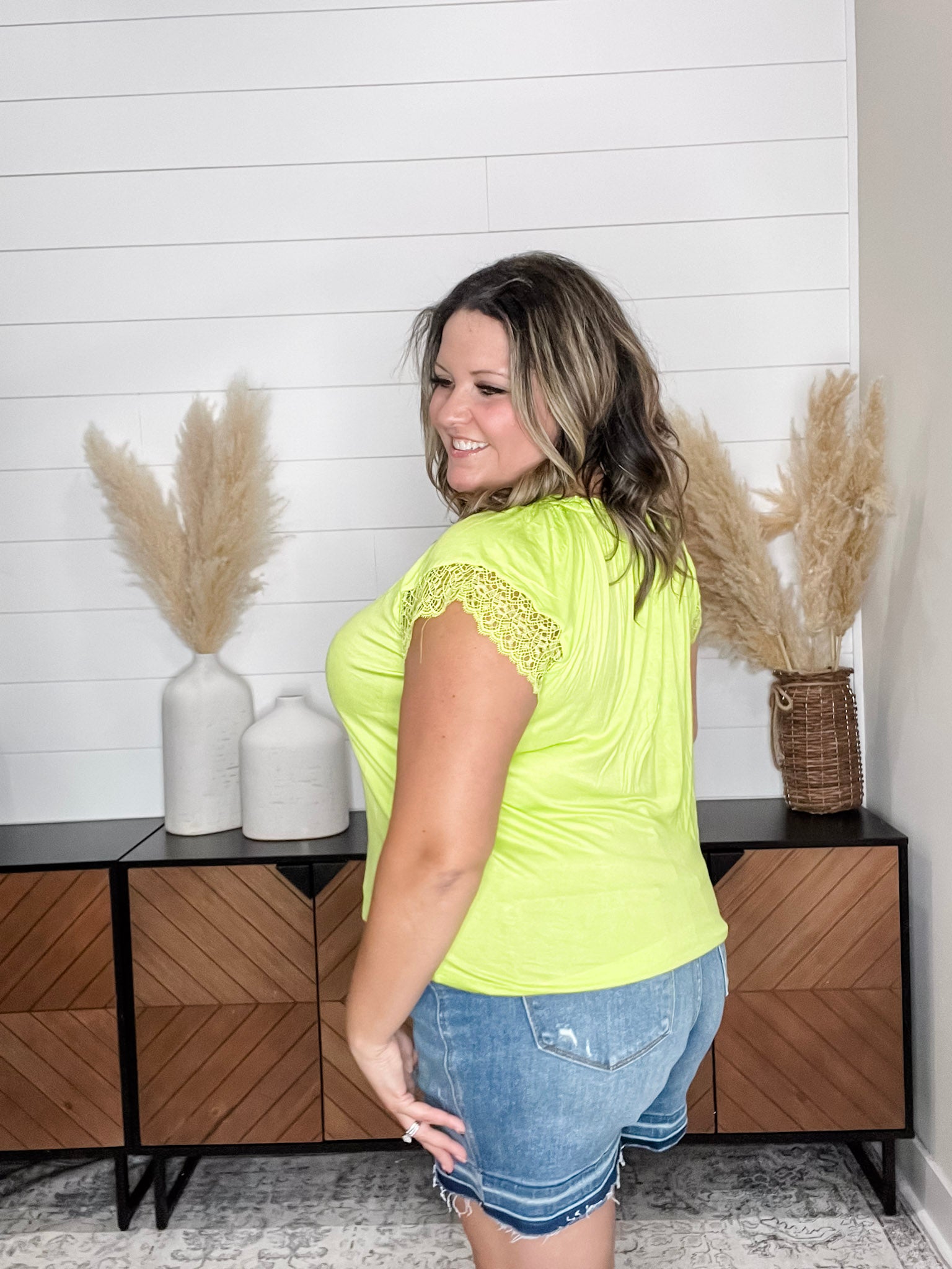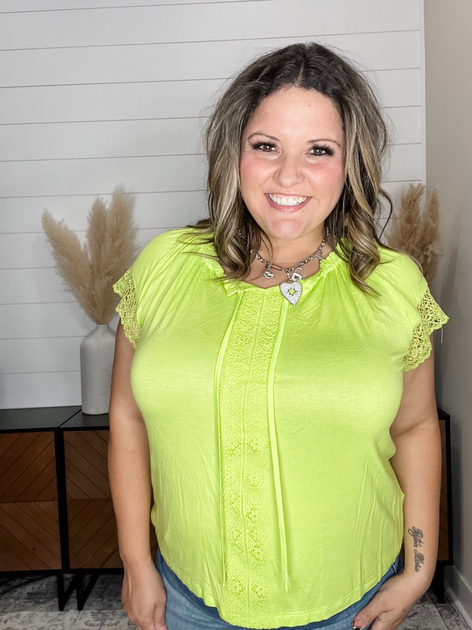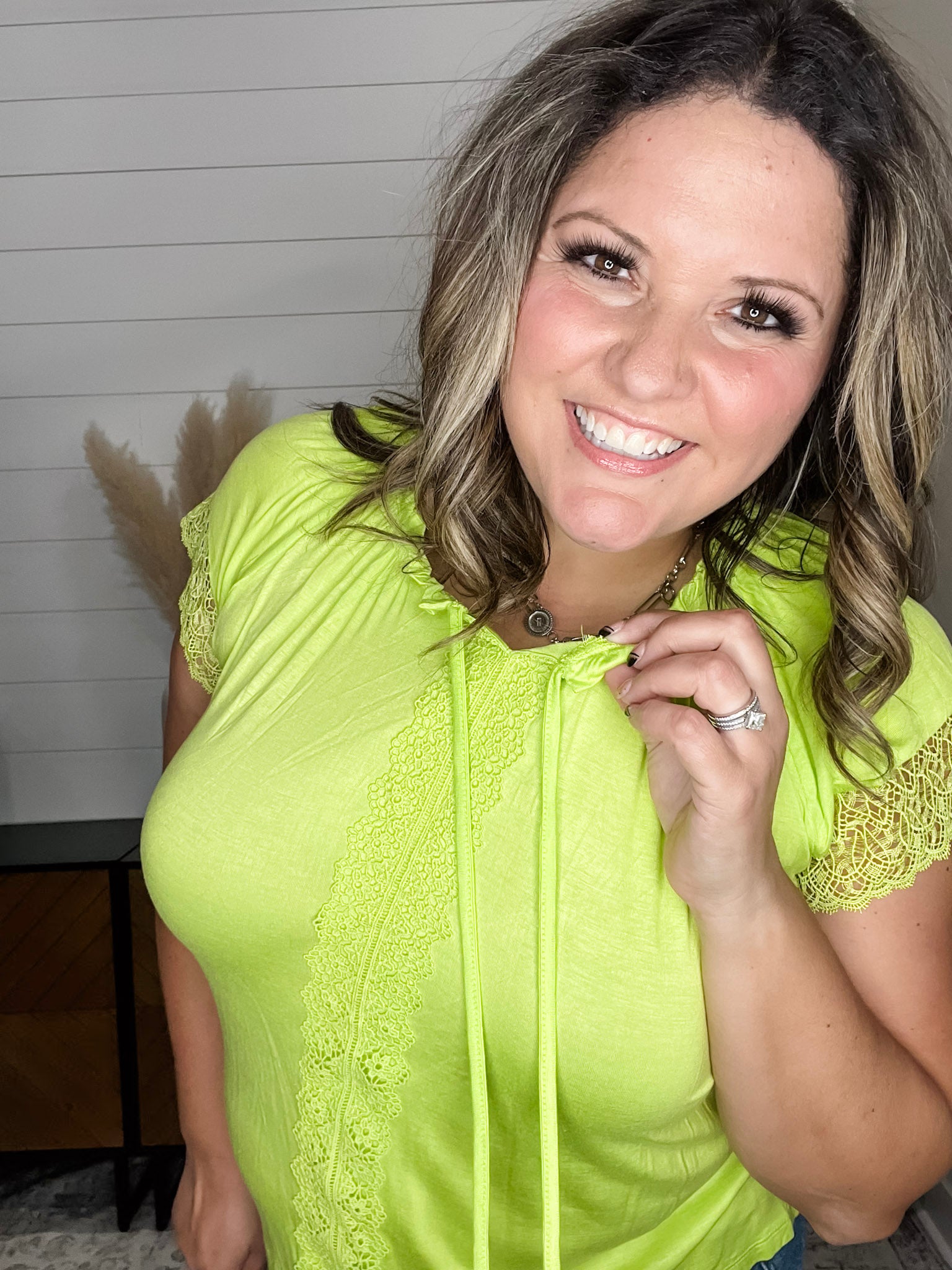 The "Wheeler" Lace Cap Sleeve with Front Tie by Sew in Love is a must-have addition to your wardrobe. The delicate lace detailing on the sleeves and body adds a touch of elegance, while the soft and lightweight tee material ensures comfort. Complete with a flattering tie at the neckline, this top fits true to size flowy or you can size down one.