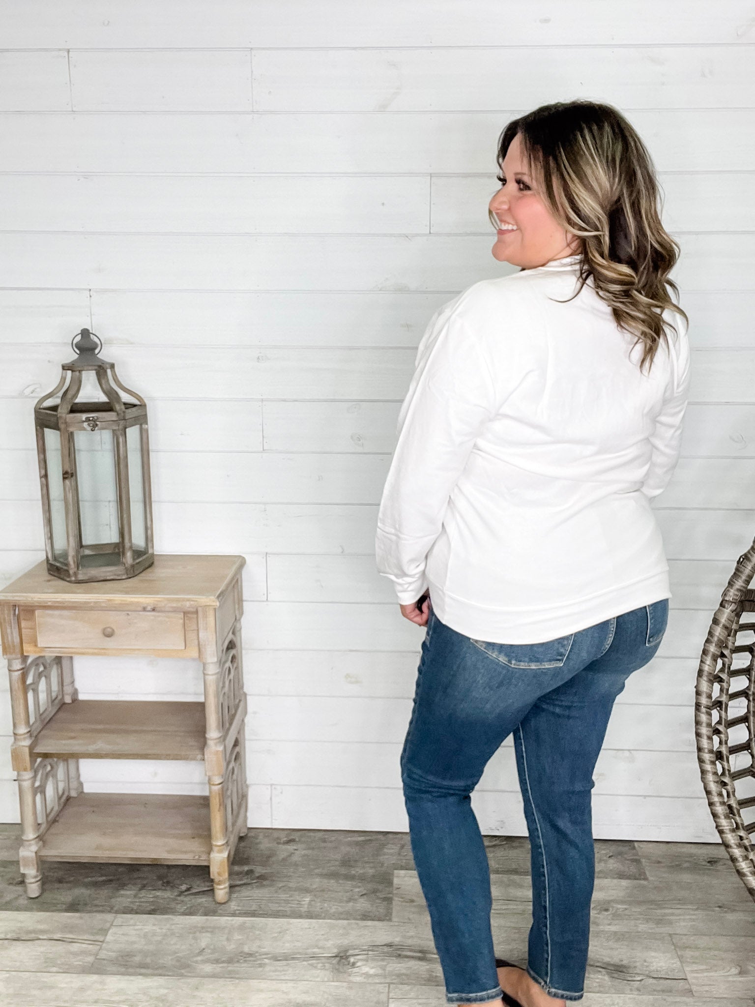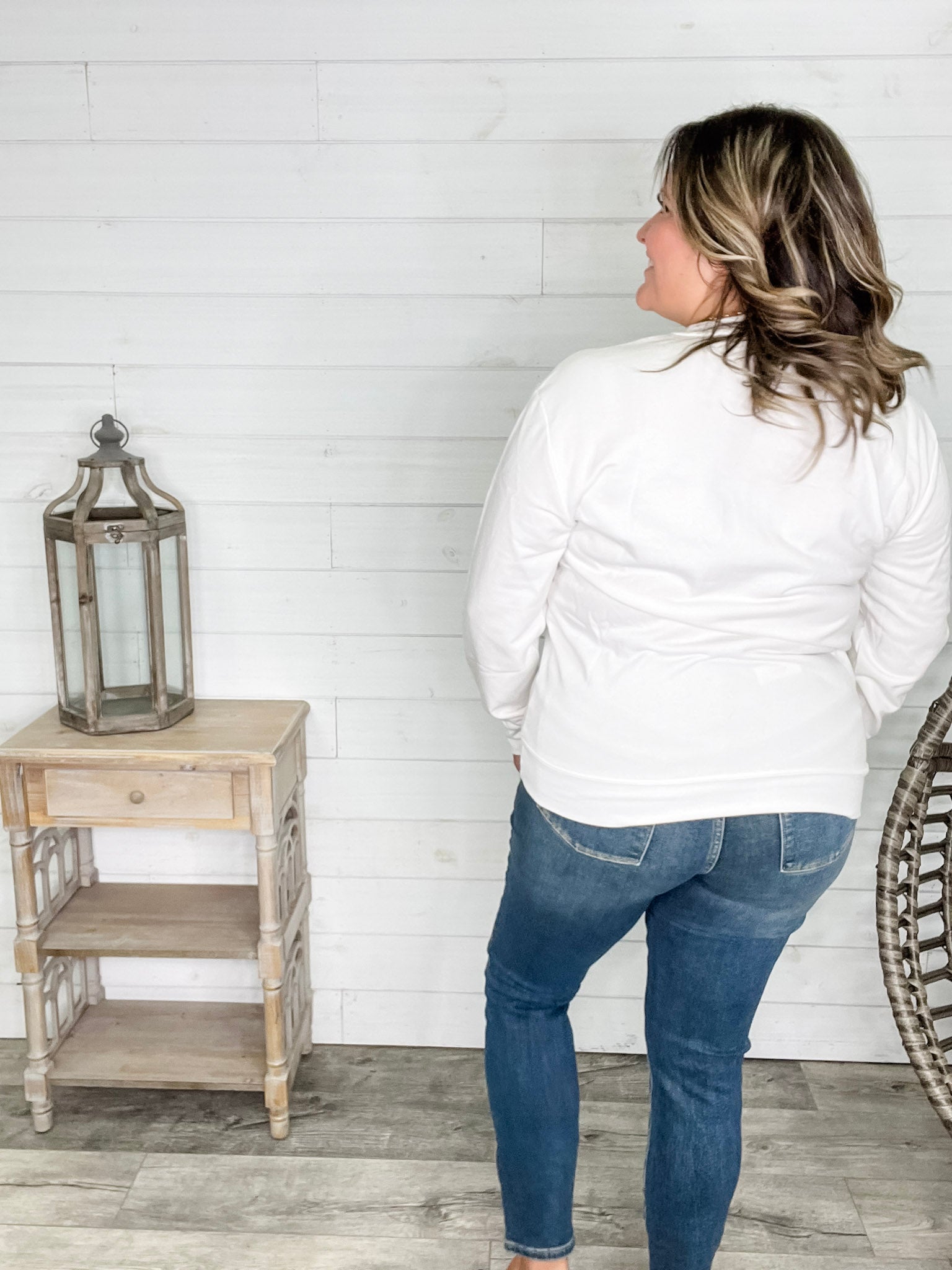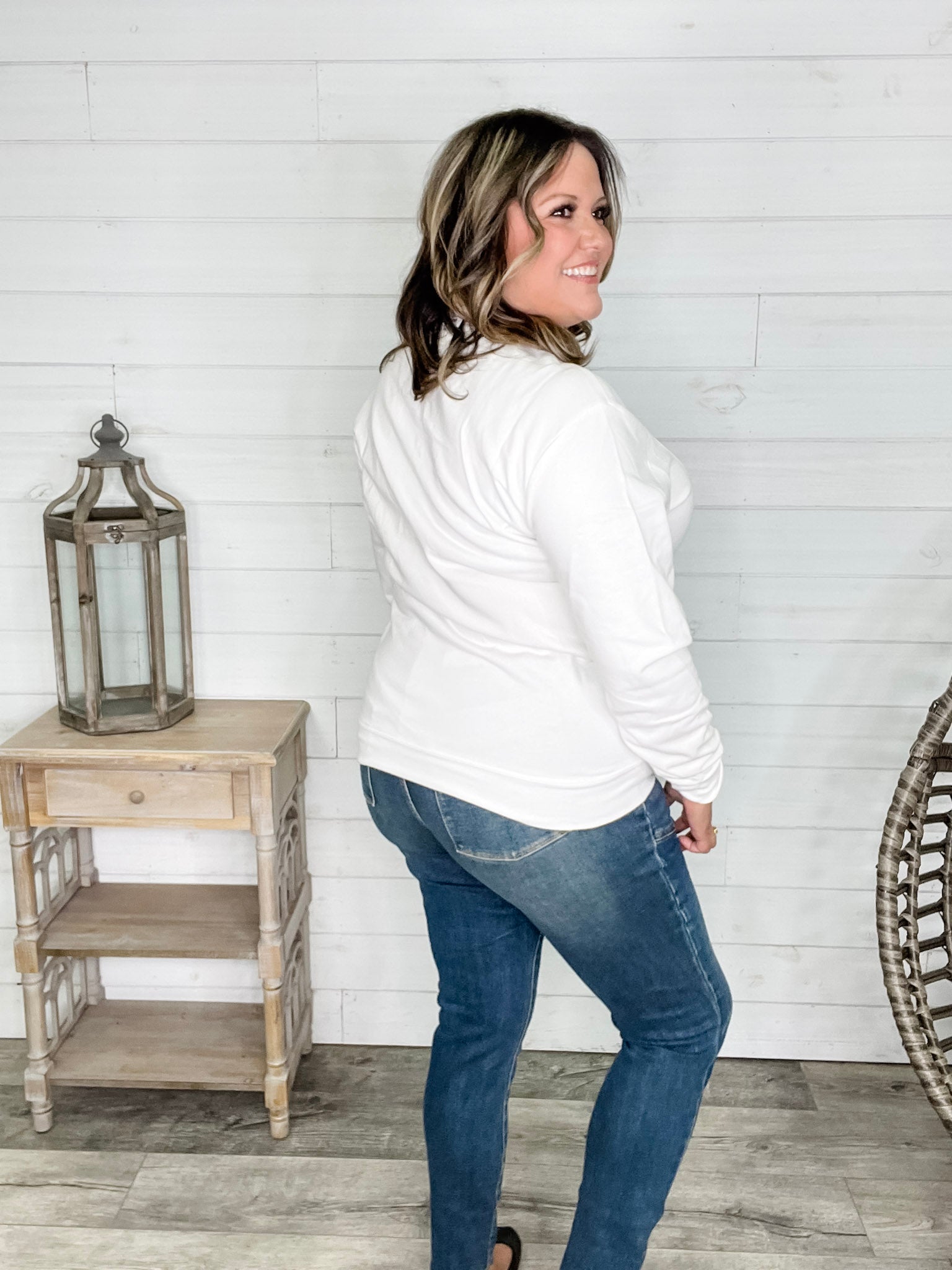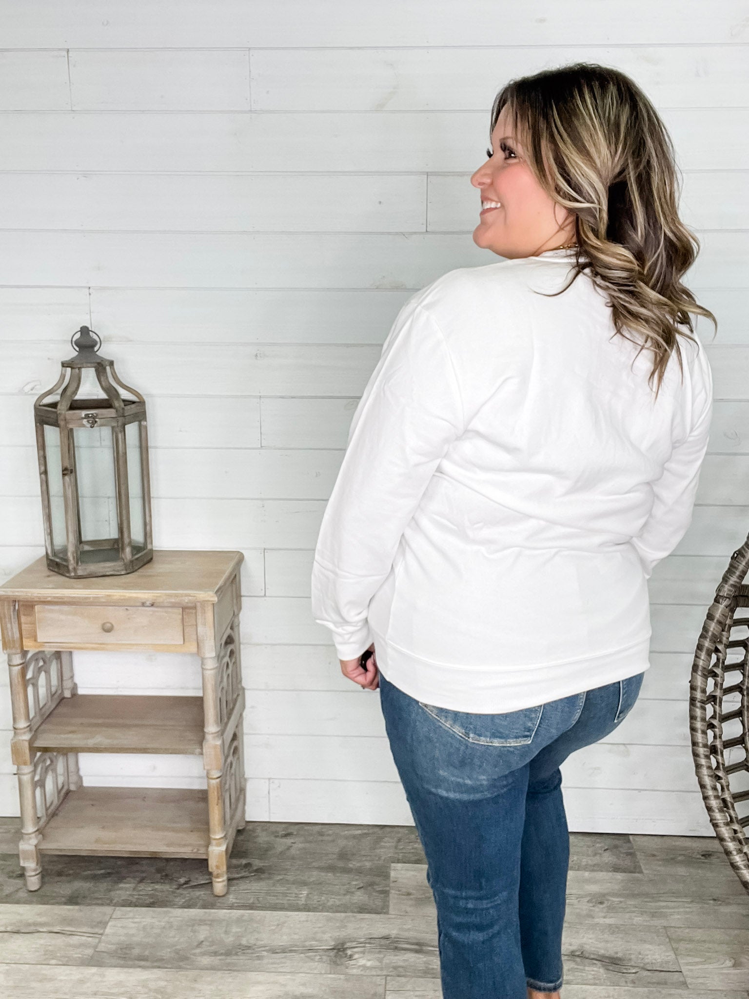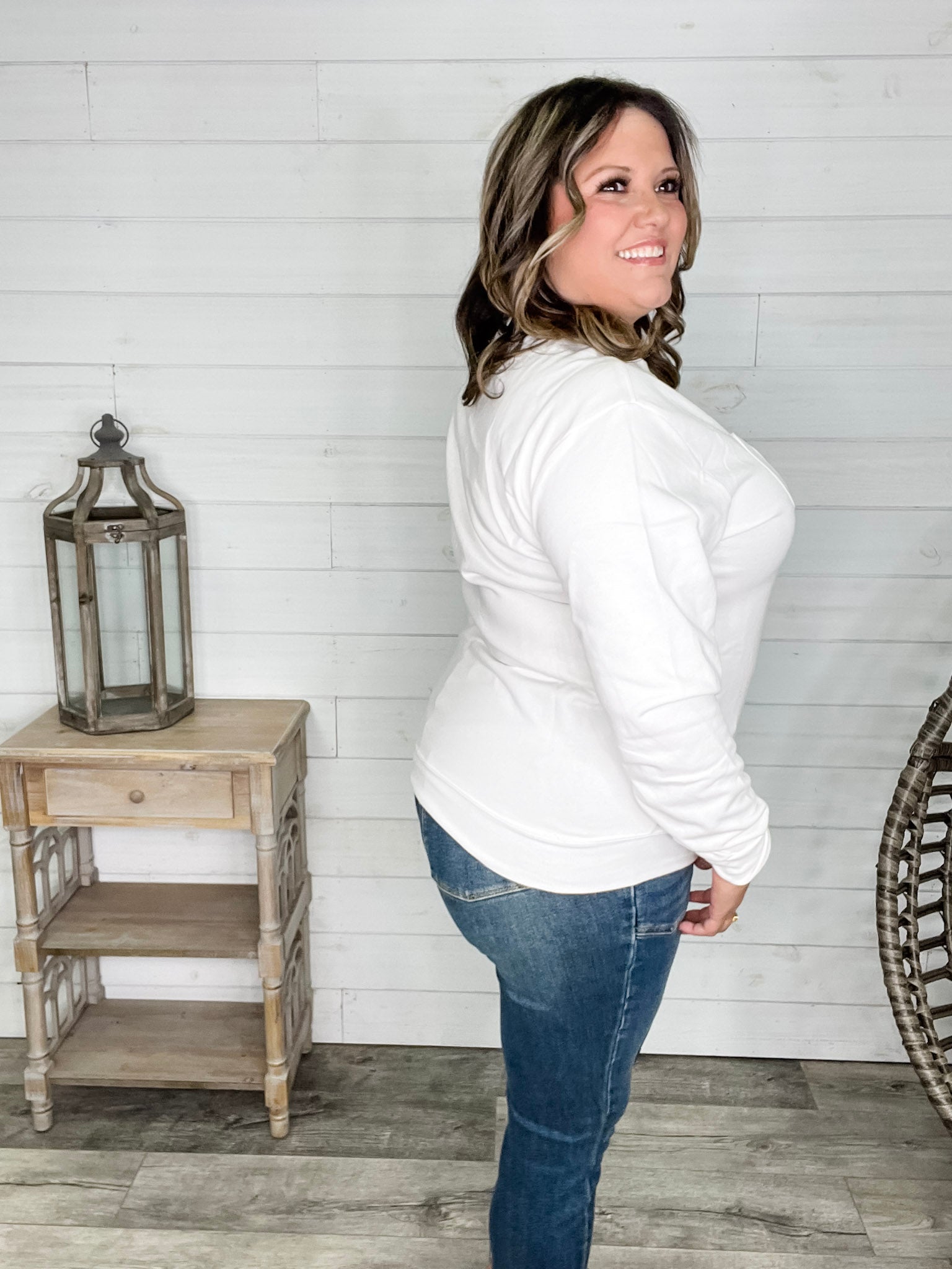 Ashley (Size 16 regular and 40H bust) wears the size 2X for a true to size long sleeve fit and 3X for a unisex roomy sweatshirt style fit.