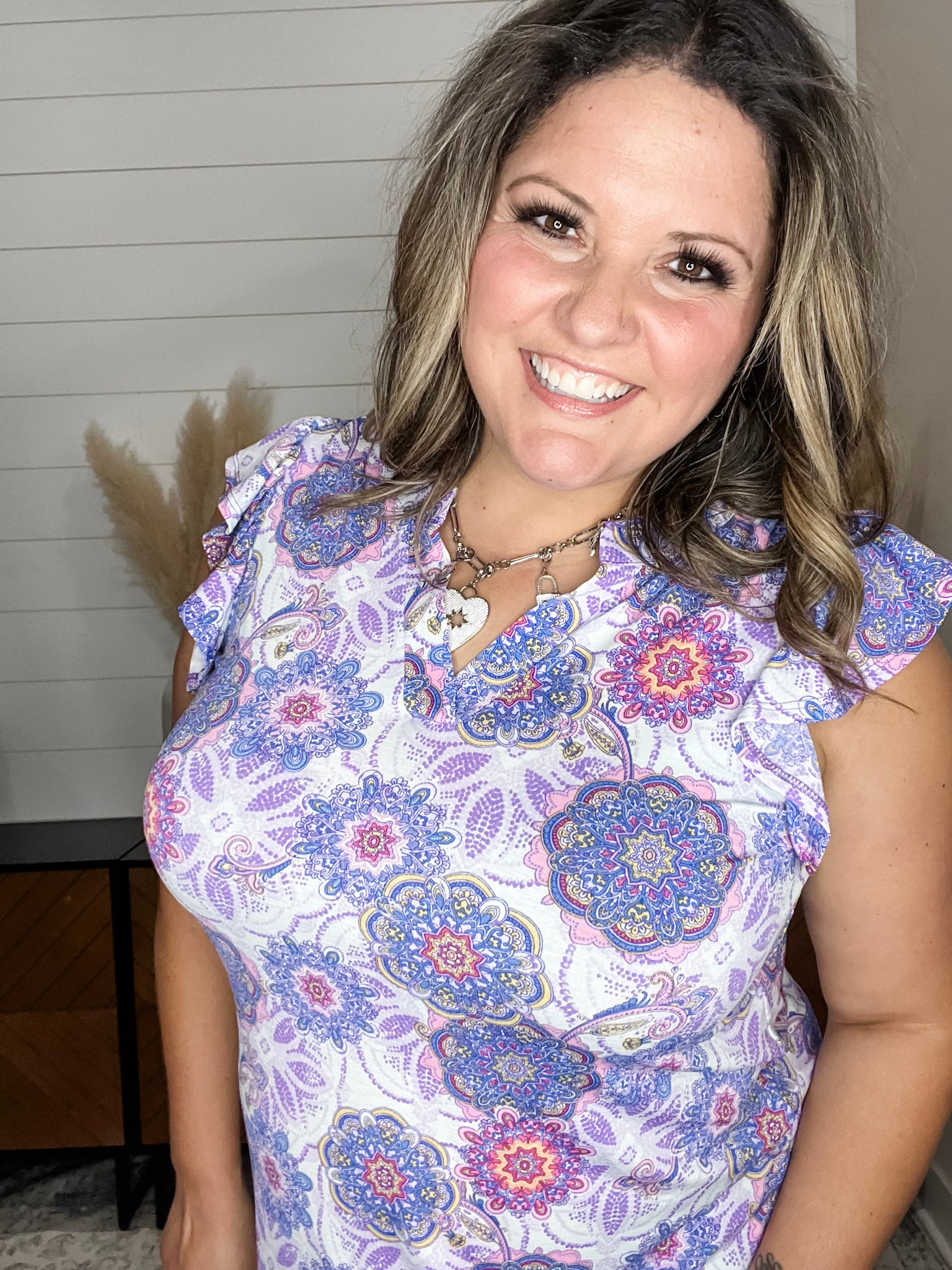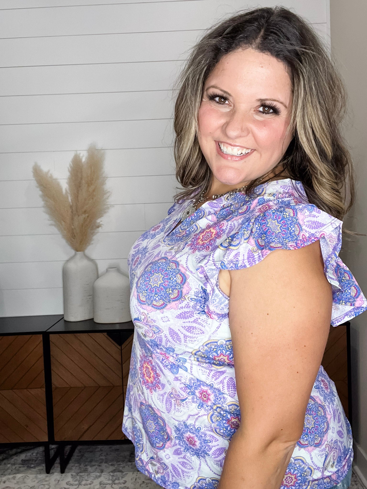 Introducing the "Woodrow" Ruffle Cap Sleeve by Dear Scarlett. With its short flutter sleeves, this top adds a delicate touch to any outfit. The light purple base is both flattering and true to size, while the slinky, stretchy fabric ensures a comfortable fit. Best of all, it's wrinkle-free, making it perfect for any occasion.