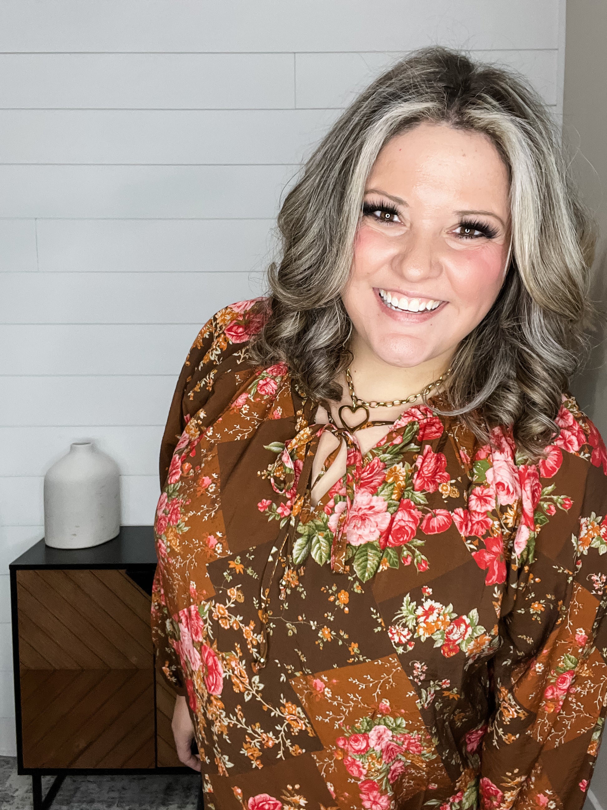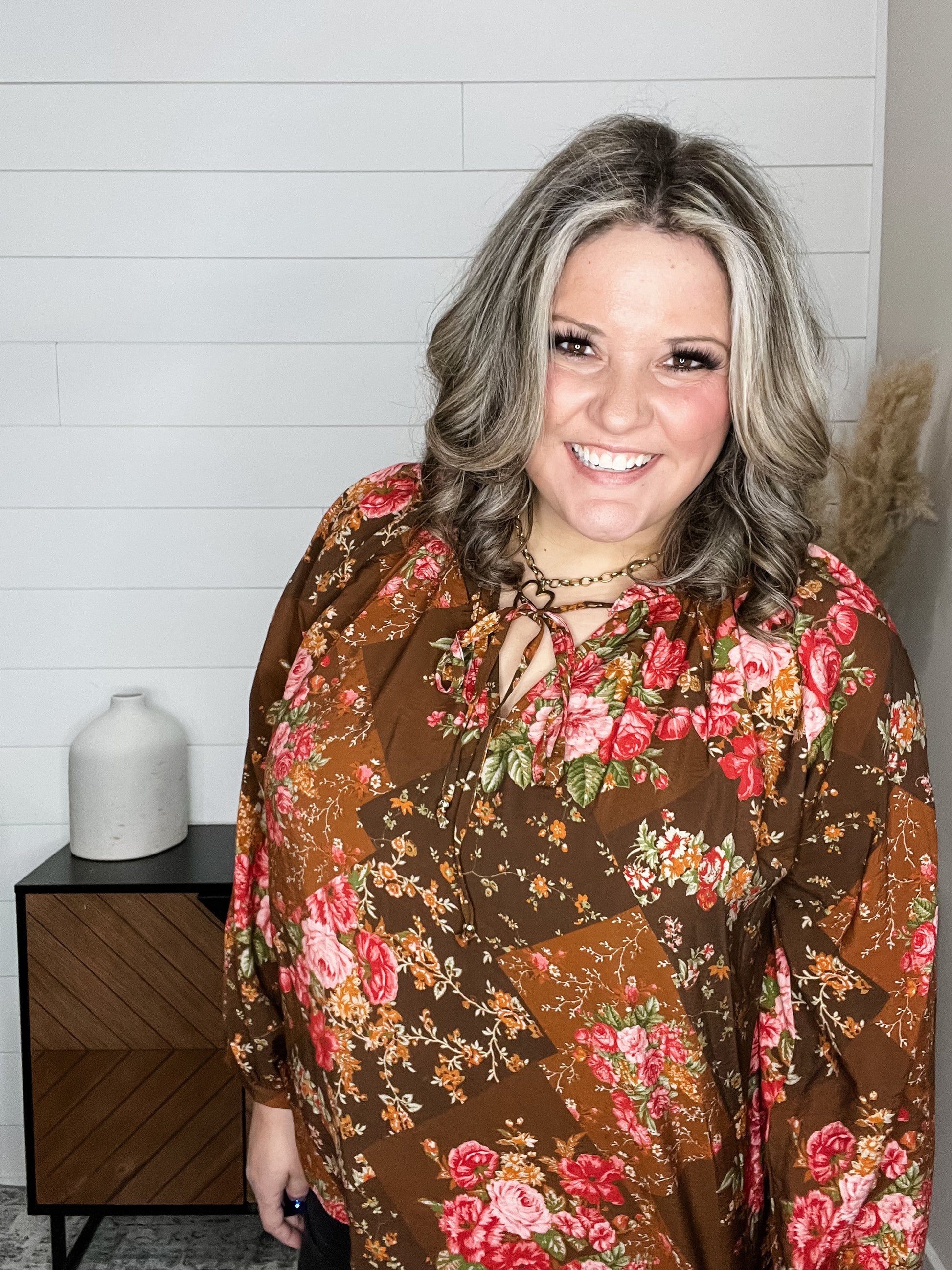 Embrace the season in this charming floral blouse featuring a front tie detail that adds instant personality to your look. The balloon sleeves bring a playful, romantic vibe, while the ruffled collar frames your face beautifully. Crafted in a lightweight, non-stretch fabric perfect for fall layering, this piece transitions effortlessly from casual brunches to weekend adventures. The rich fall color palette makes it an easy go-to for creating effortless, stylish outfits all season long.