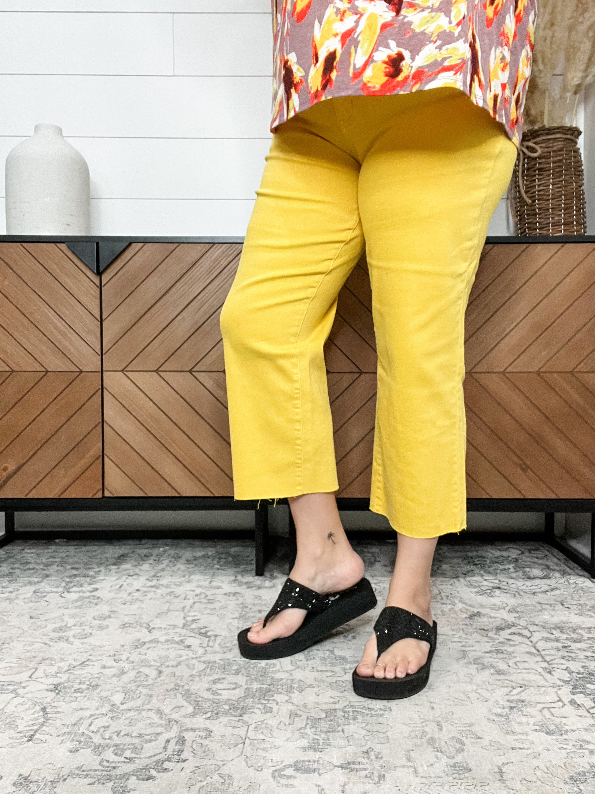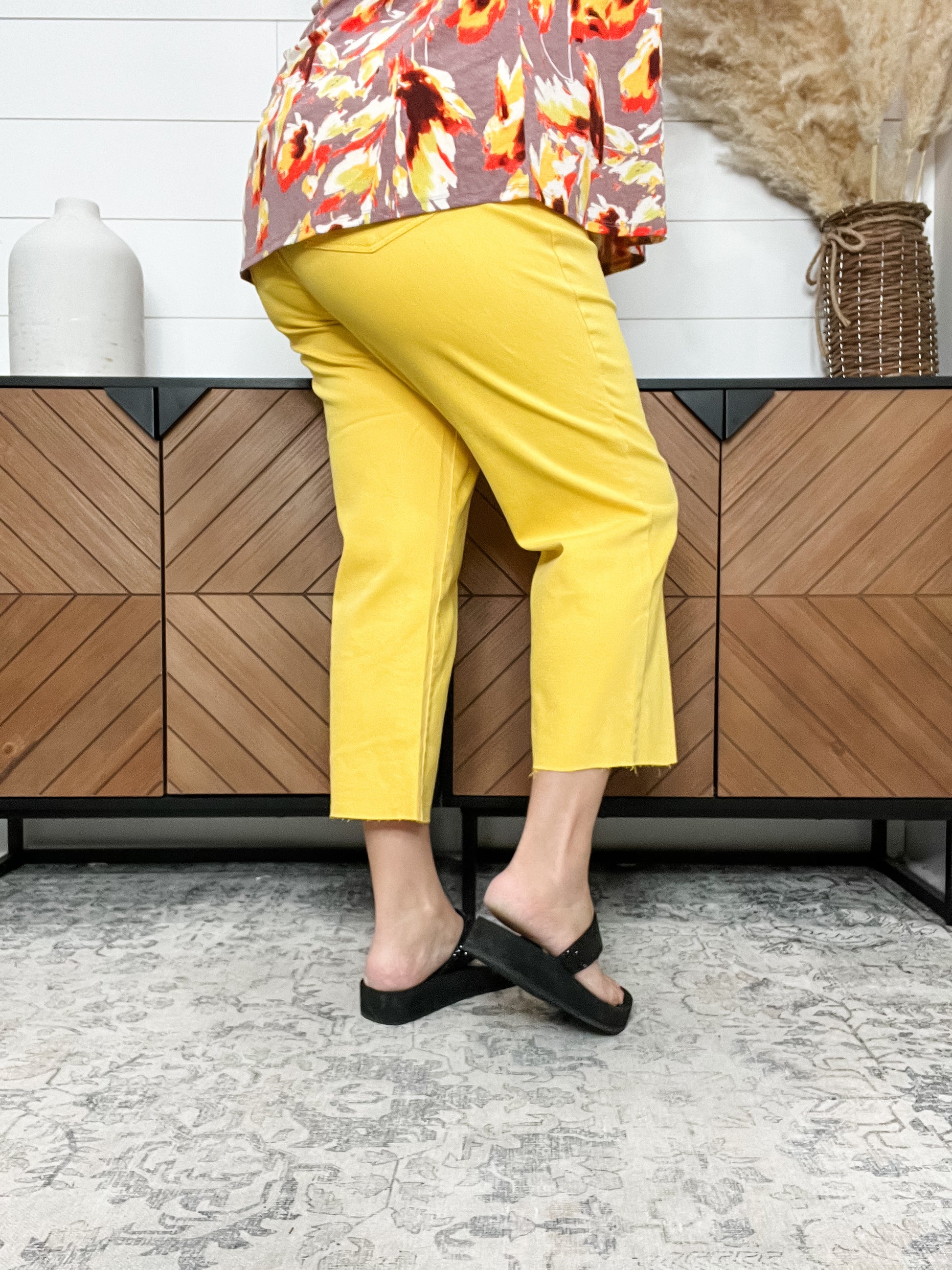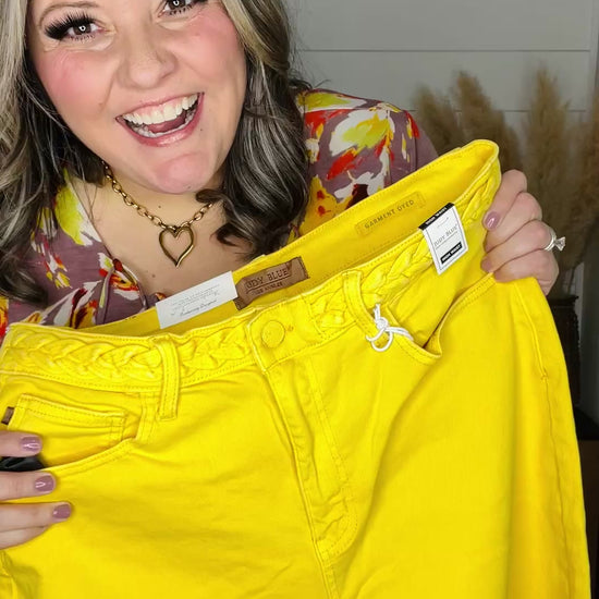 They're back! Our best selling braided waistband Judy Blue Sunshine Yellow Wide Leg Raw Hem Crops are finally back in stock! This yellow is the perfect pop of color to dress up and rock for Spring and Summer.