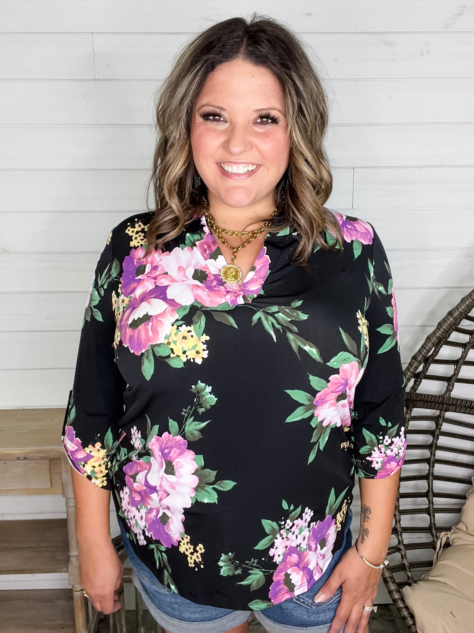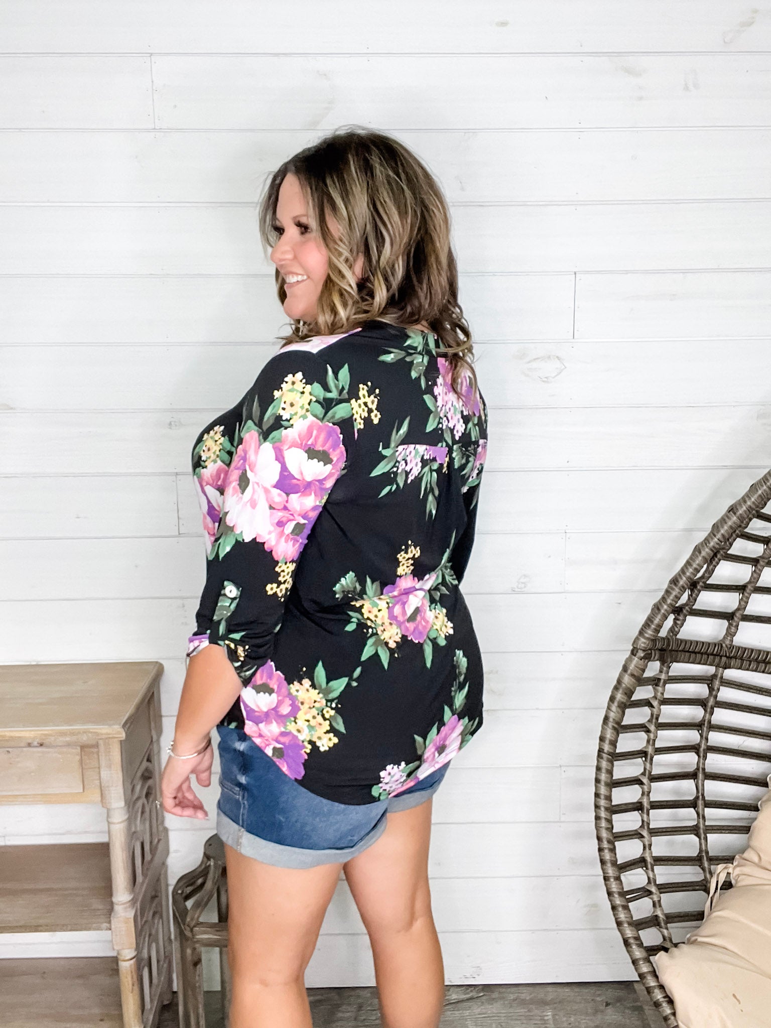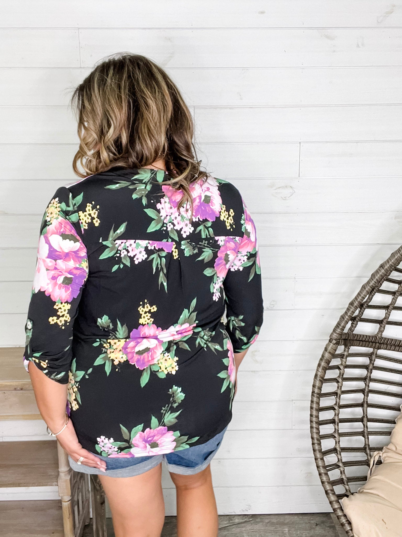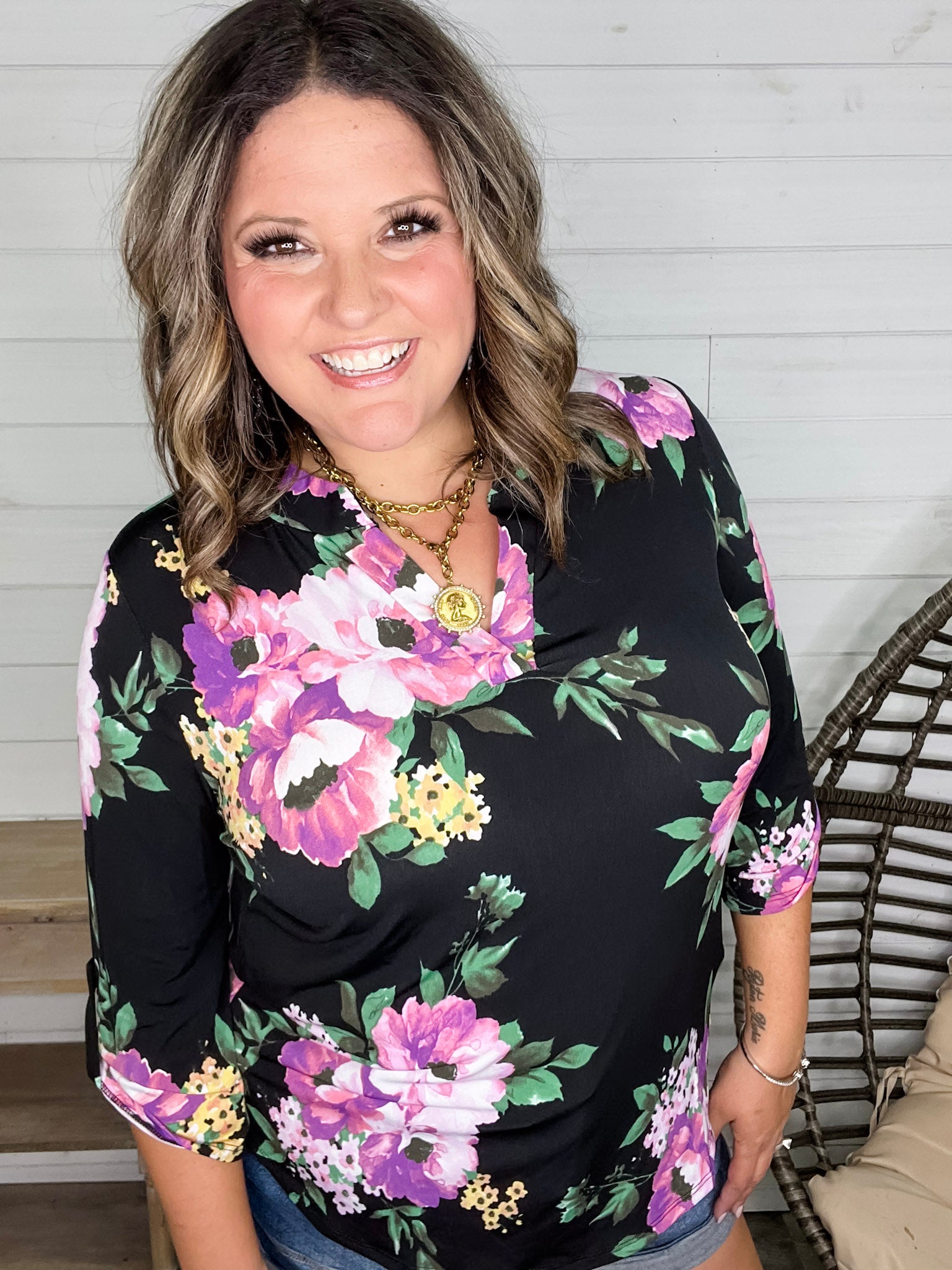 "Your Best Shot" Floral 3/4 Sleeve Split Neck (Black)