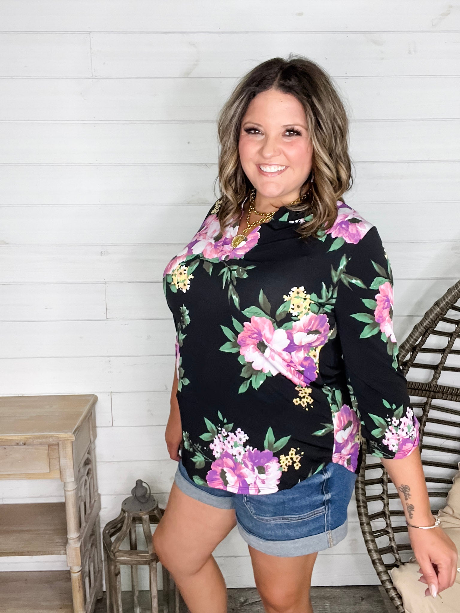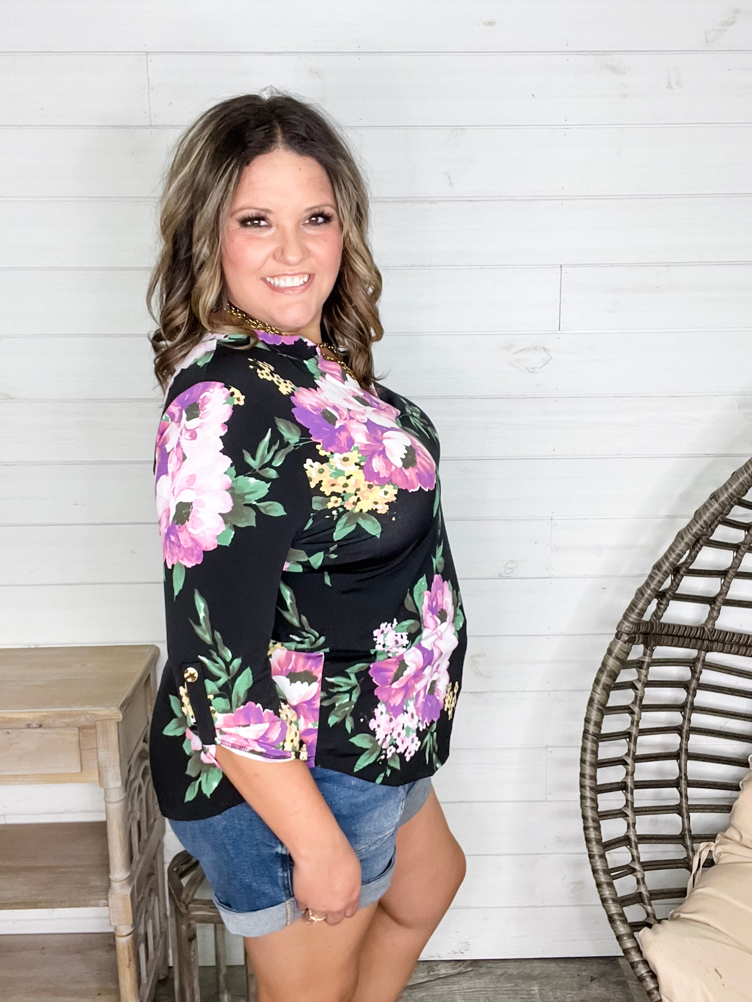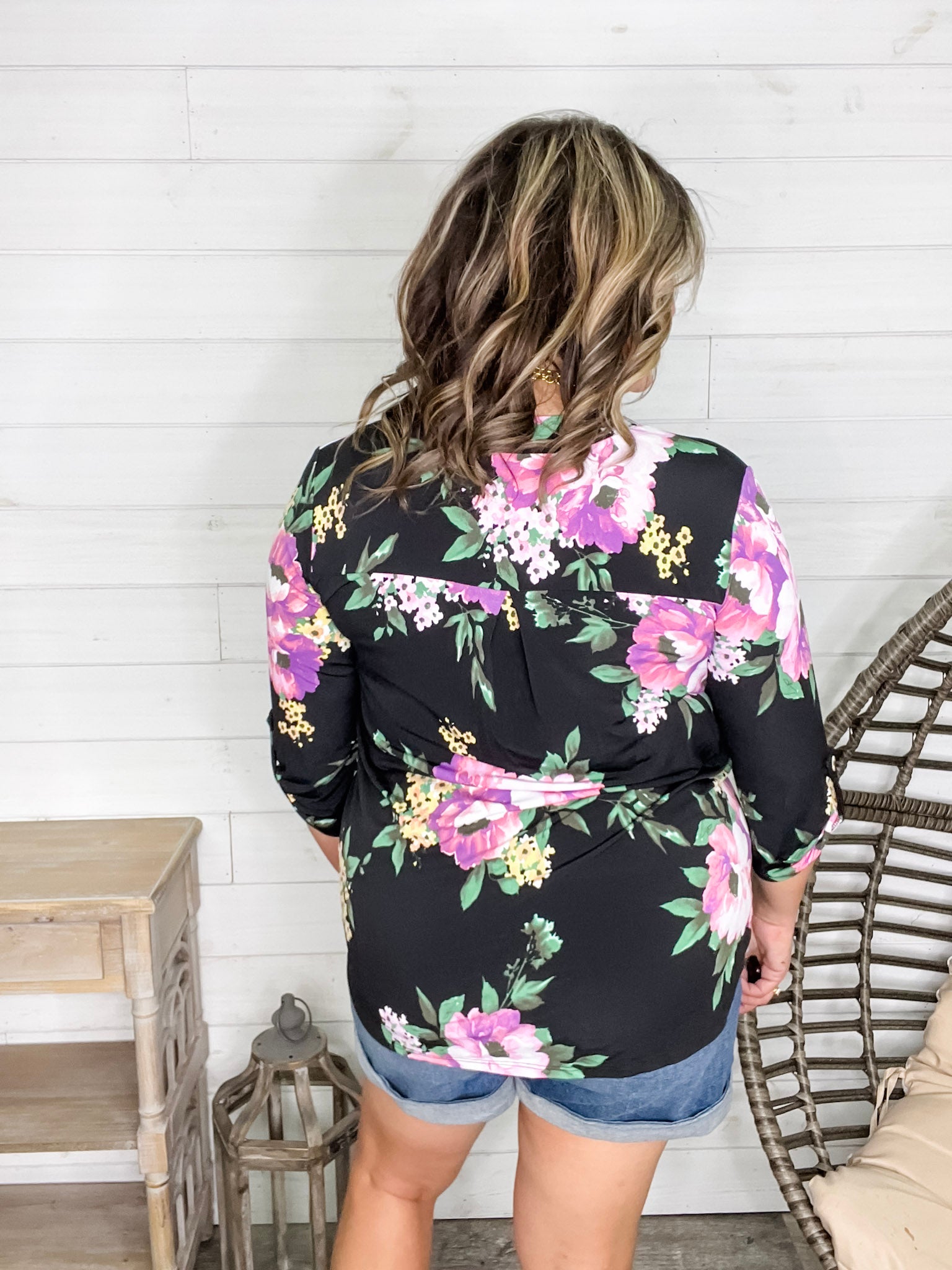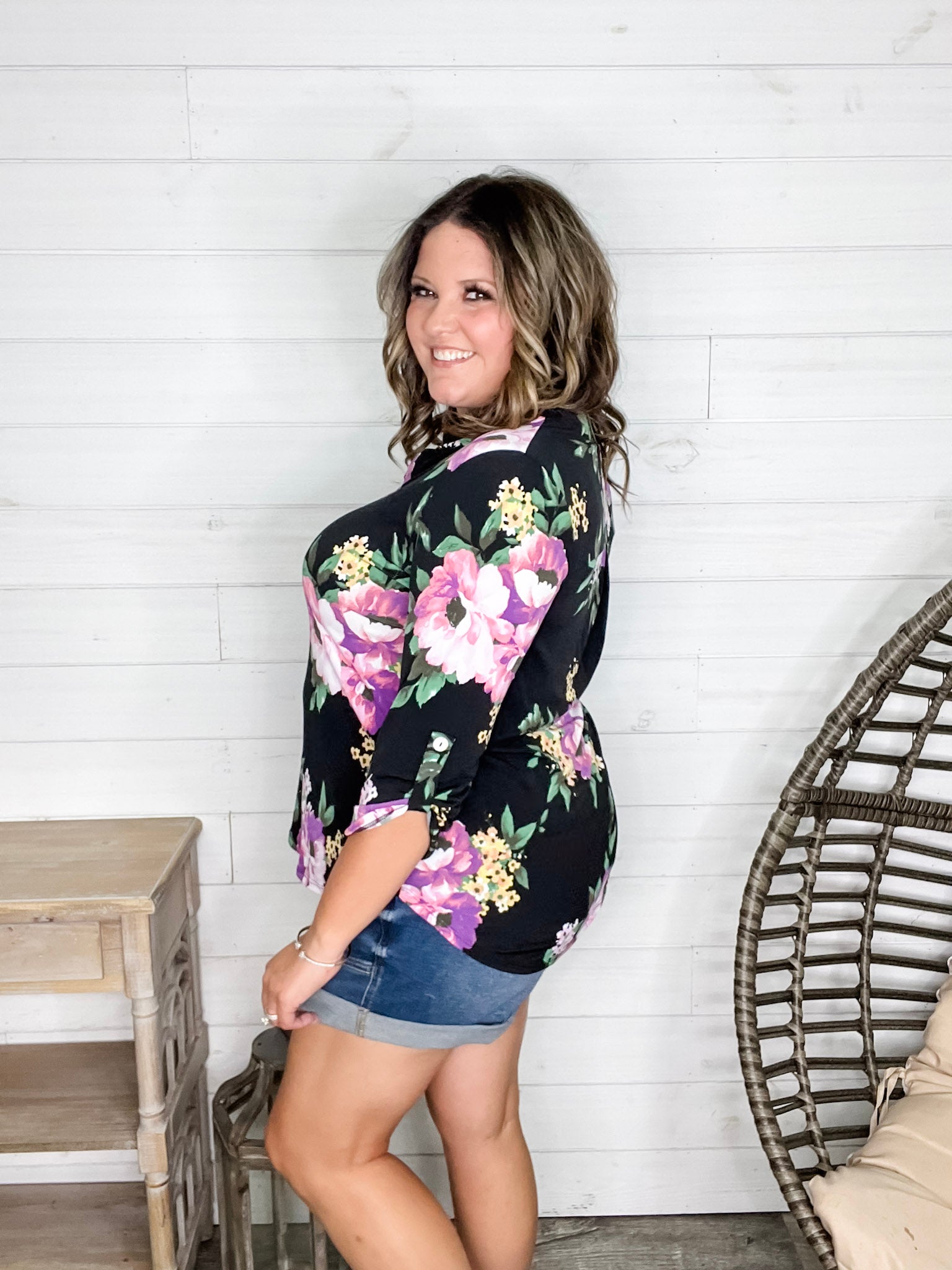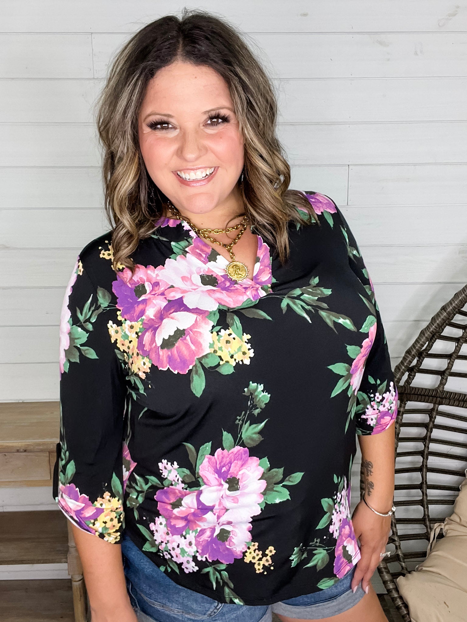 "Your Best Shot" Floral 3/4 Sleeve Split Neck (Black)
