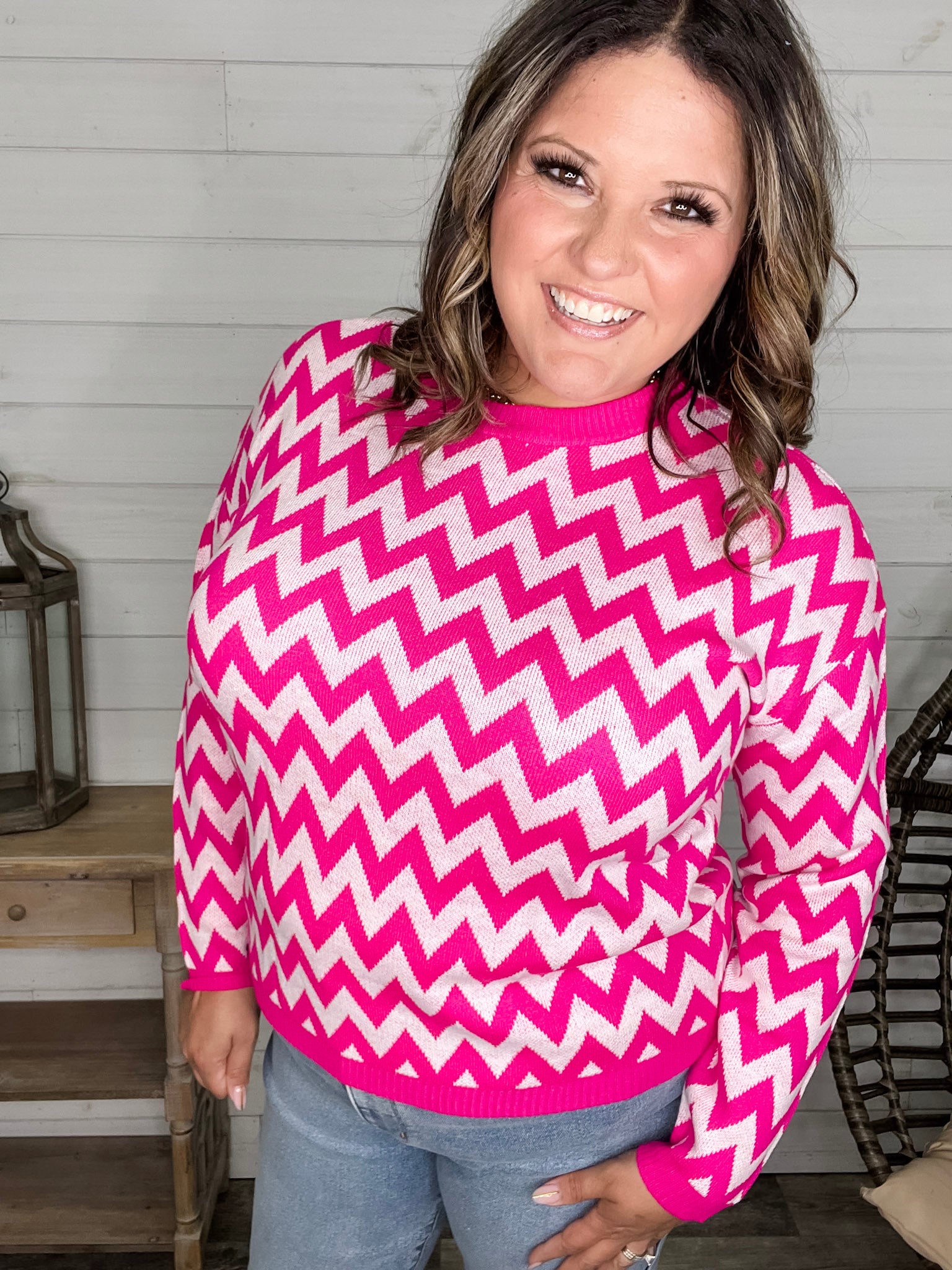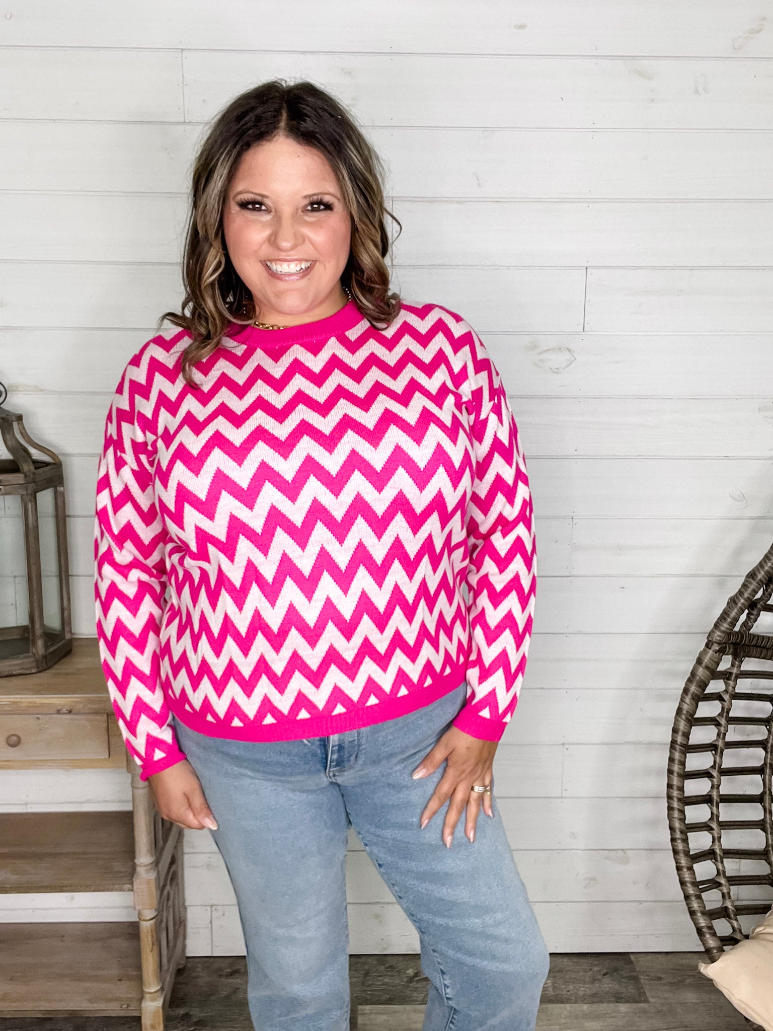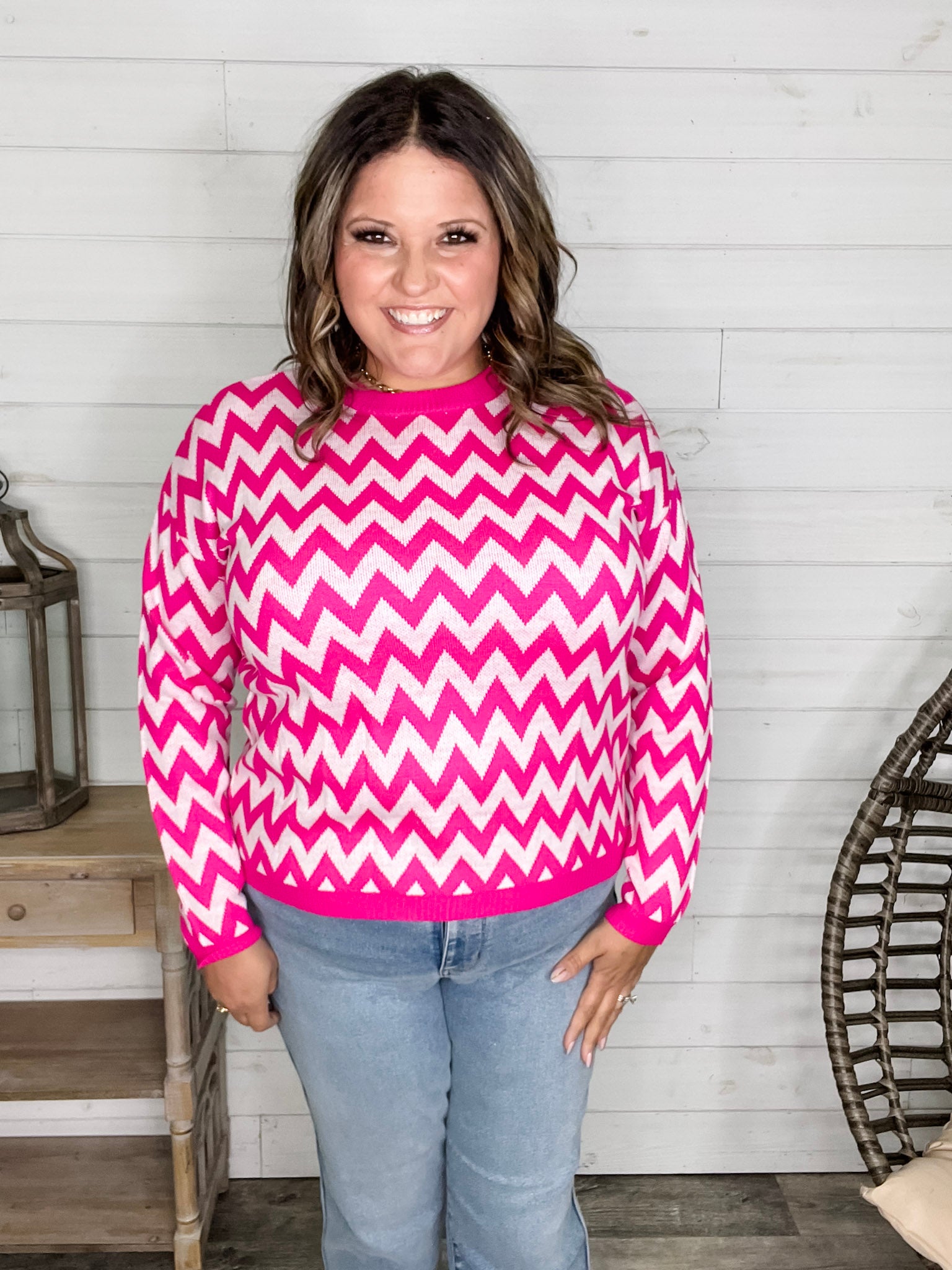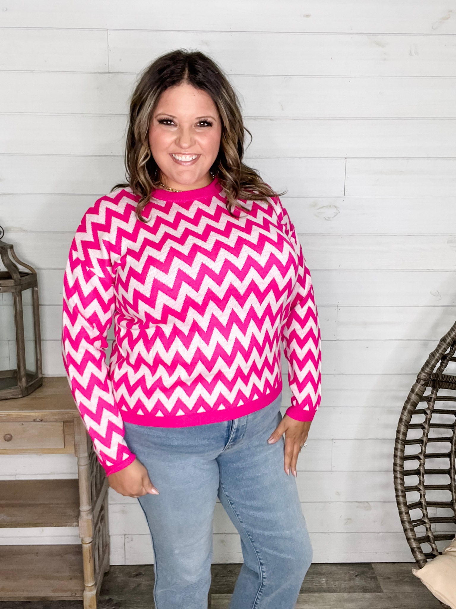 "Zig Zag" Long Sleeve Crewneck Sweater (Fuchsia)