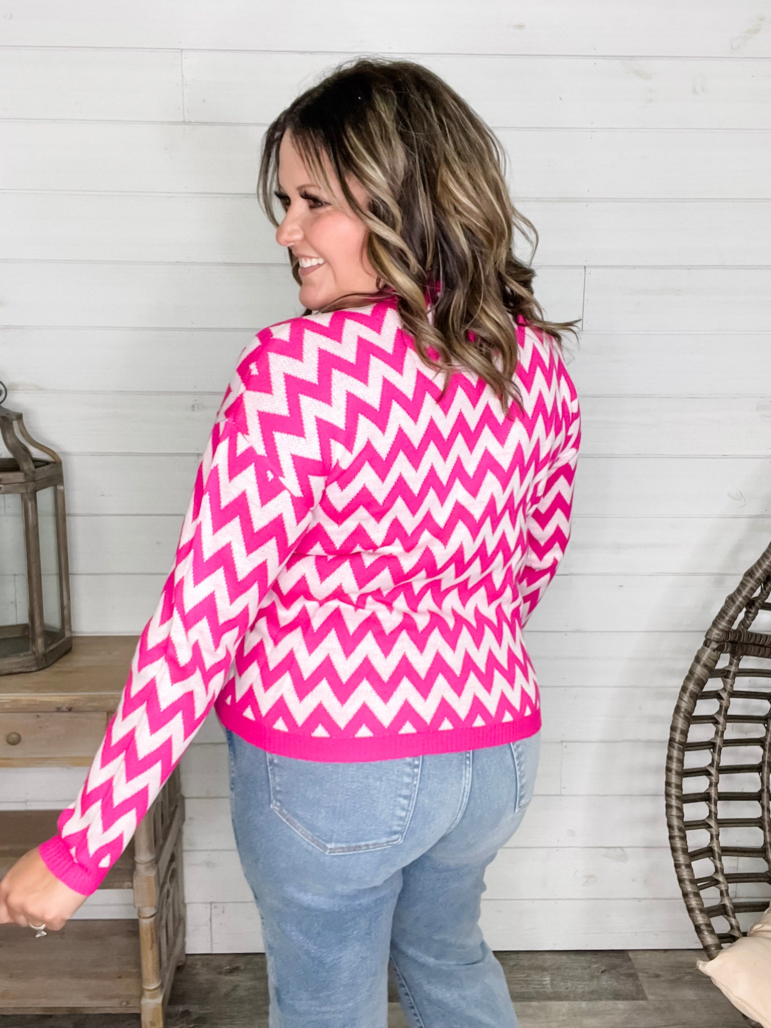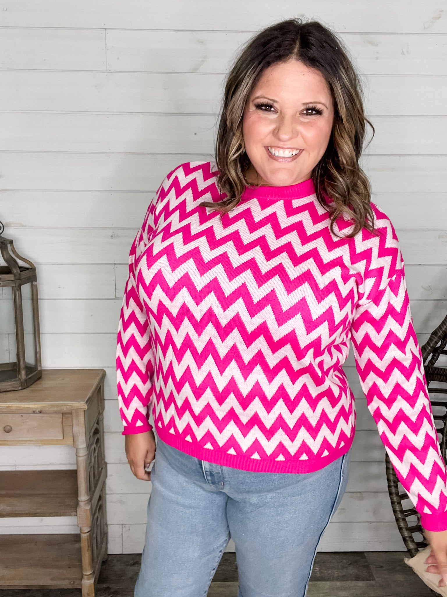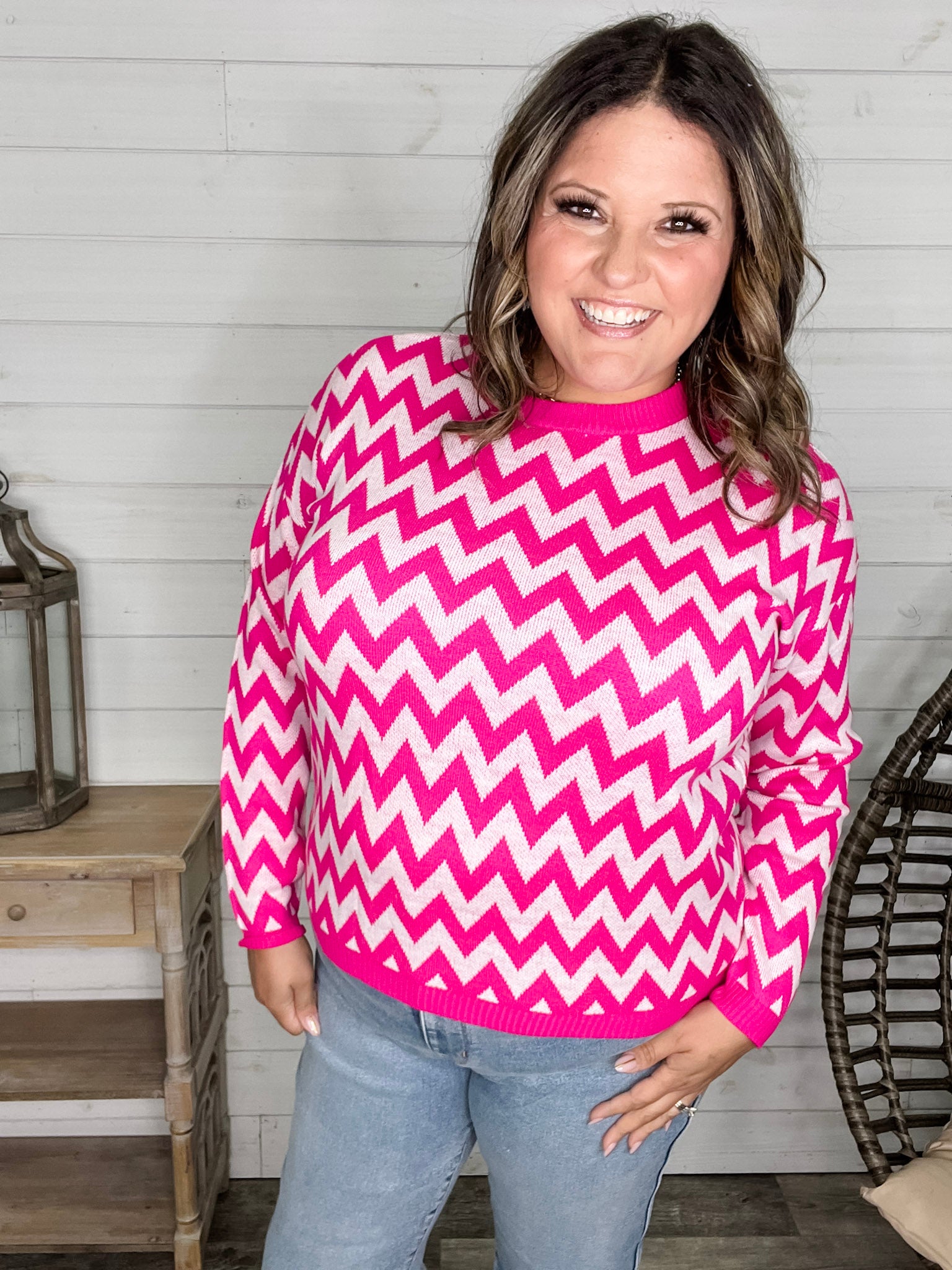 "Zig Zag" Long Sleeve Crewneck Sweater (Fuchsia)