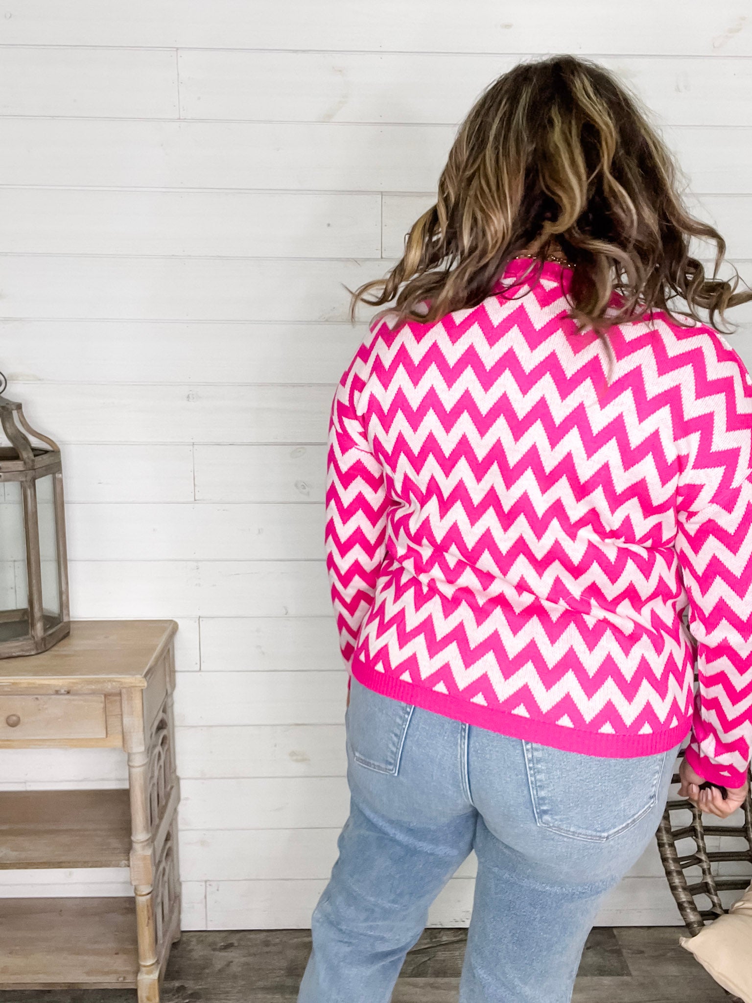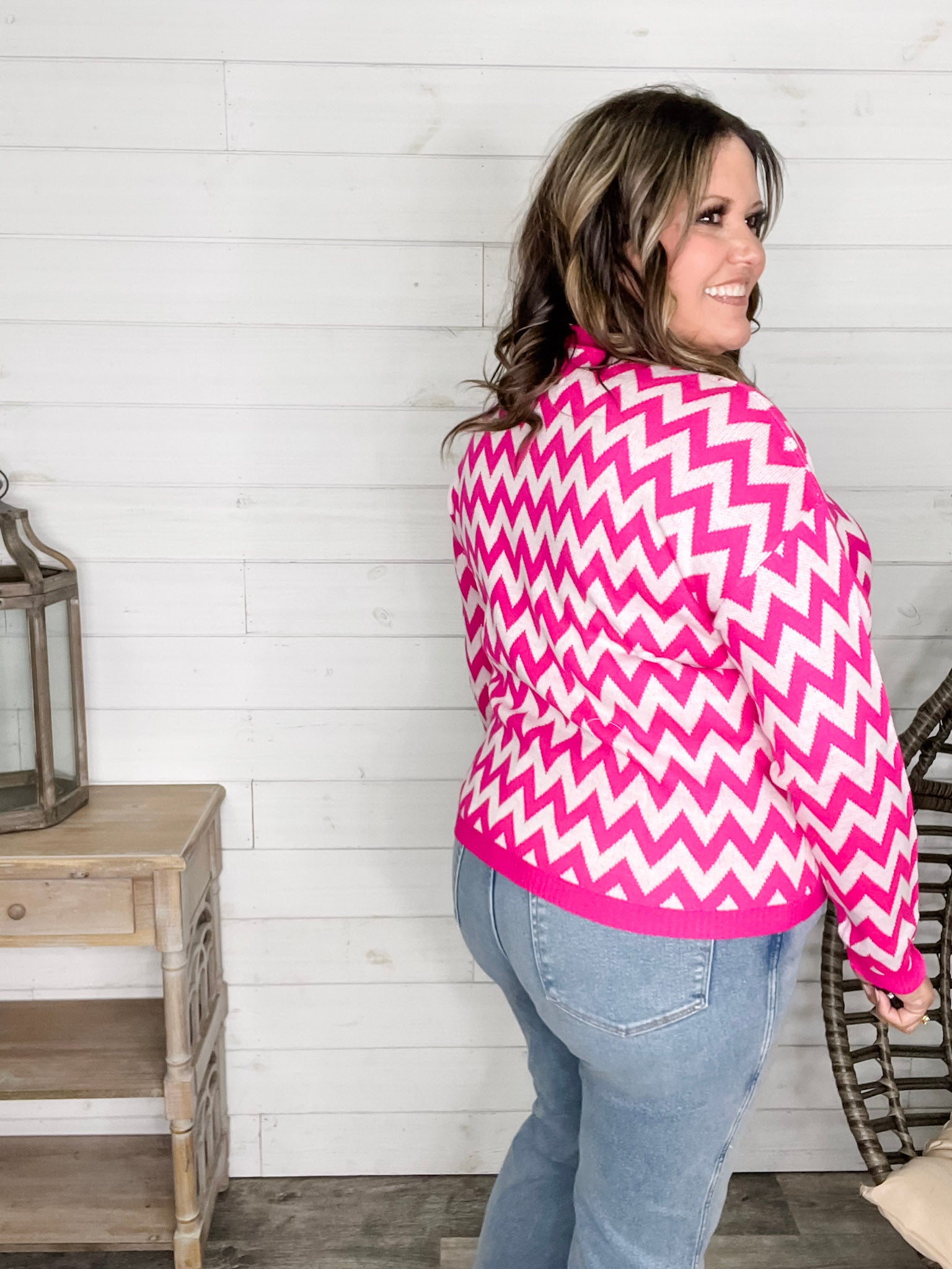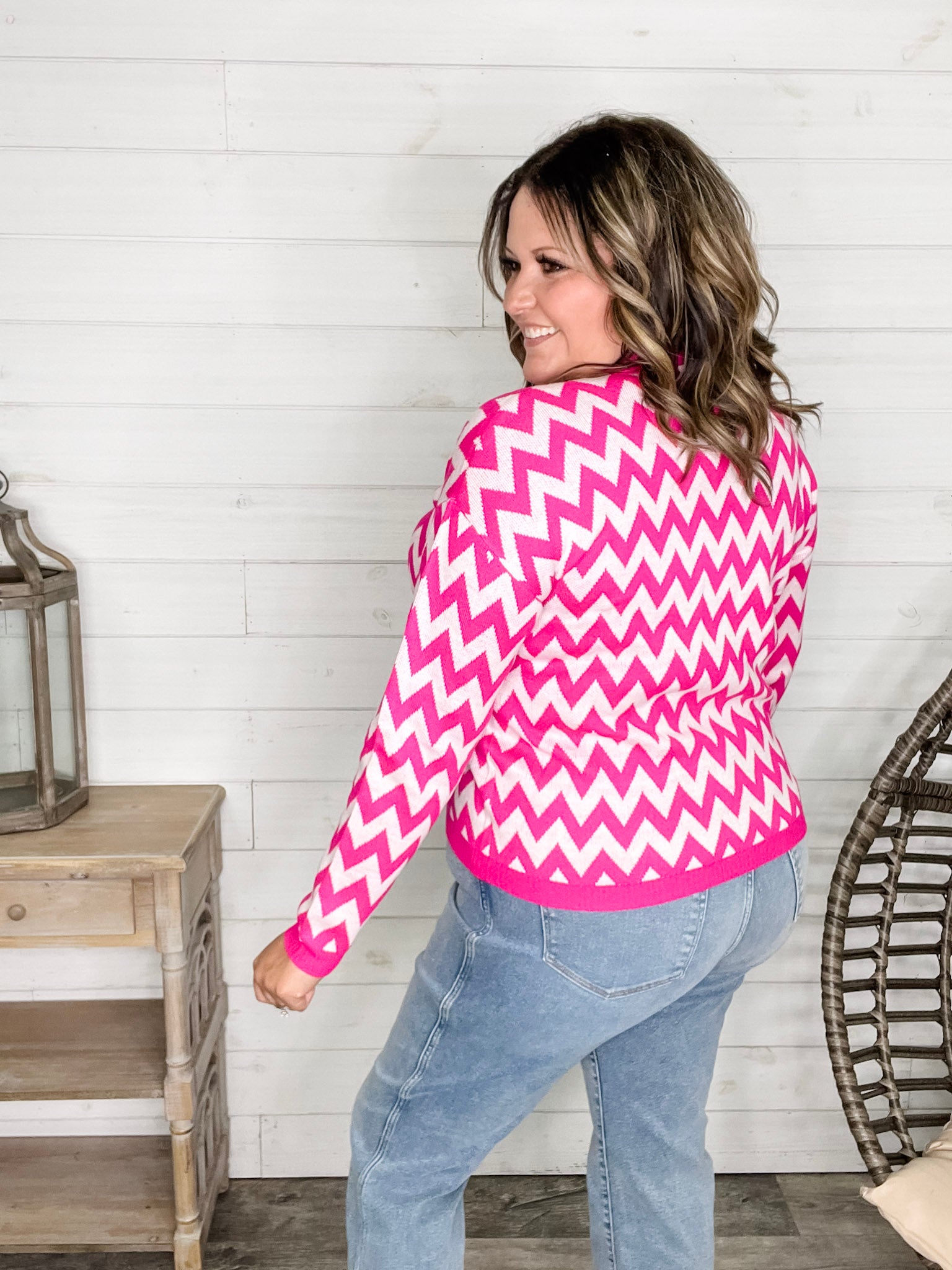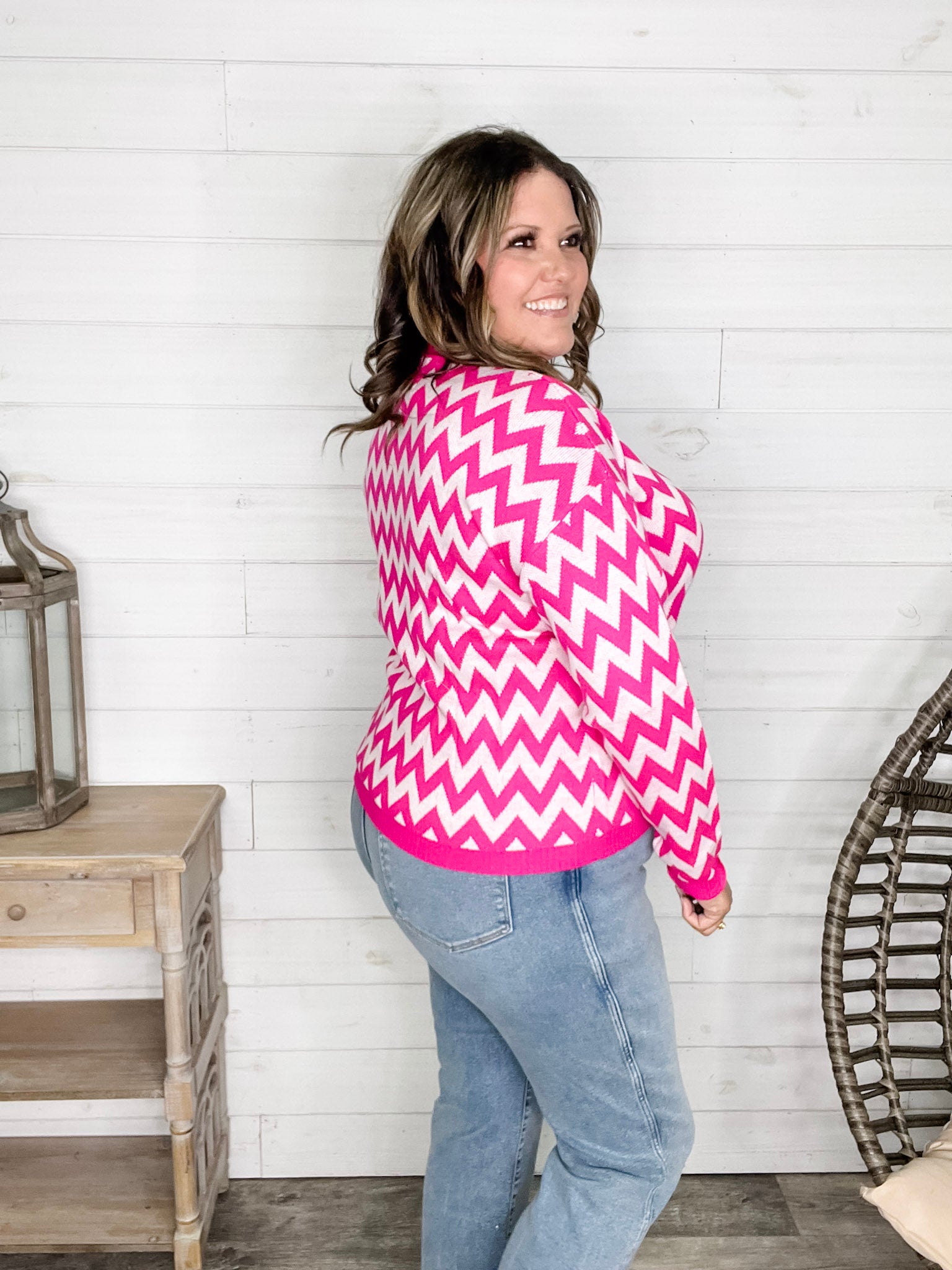 "Zig Zag" Long Sleeve Crewneck Sweater (Fuchsia)