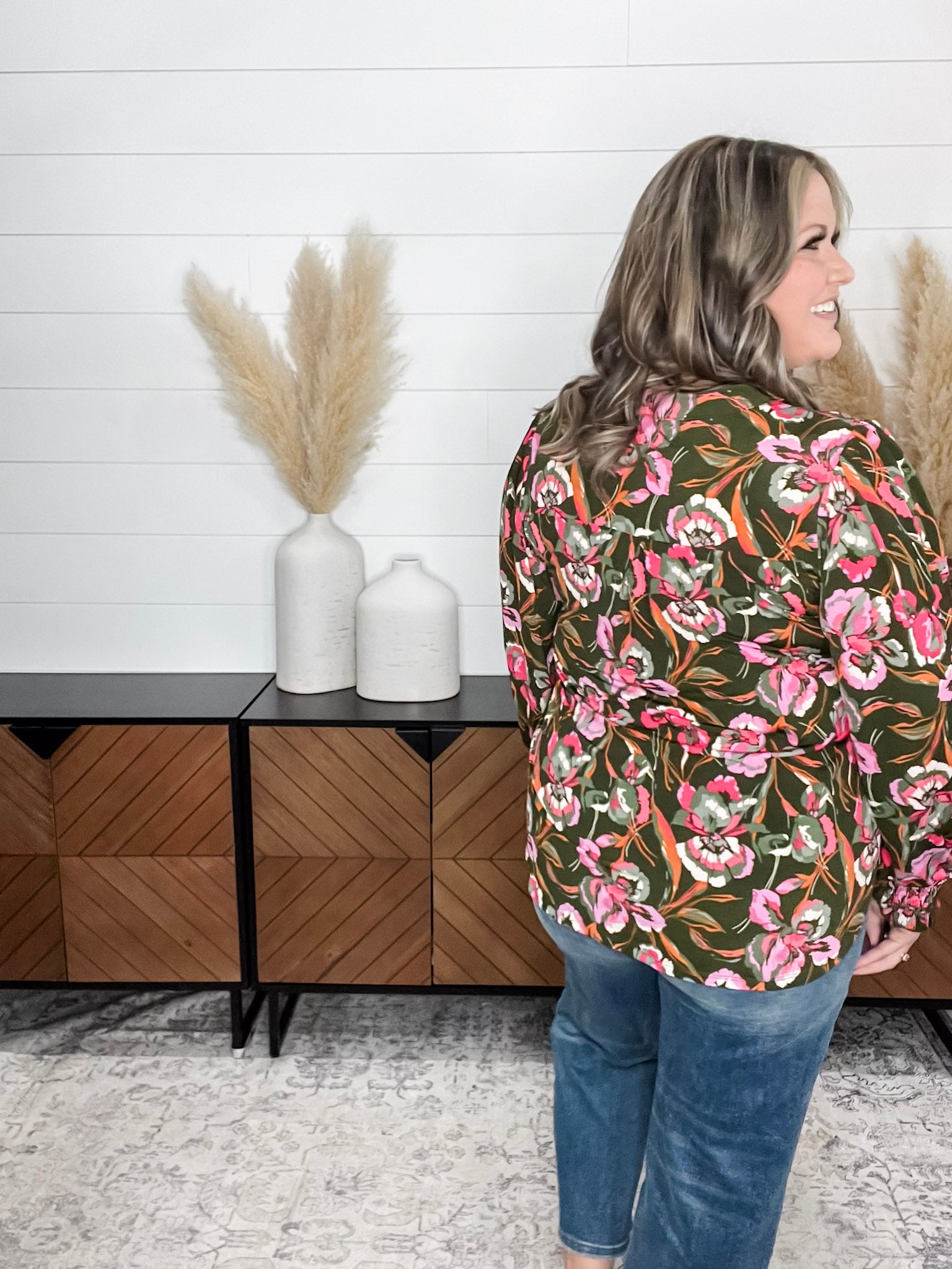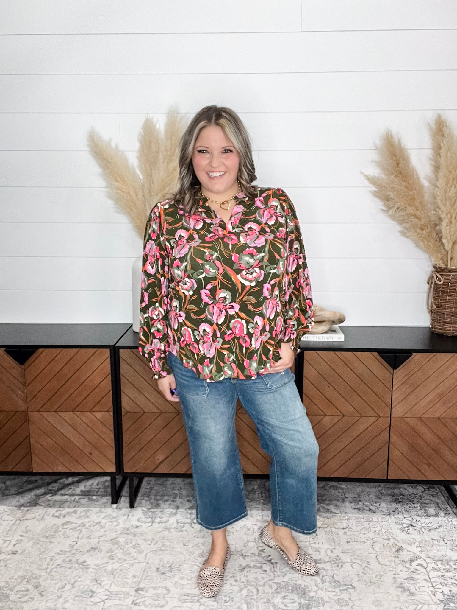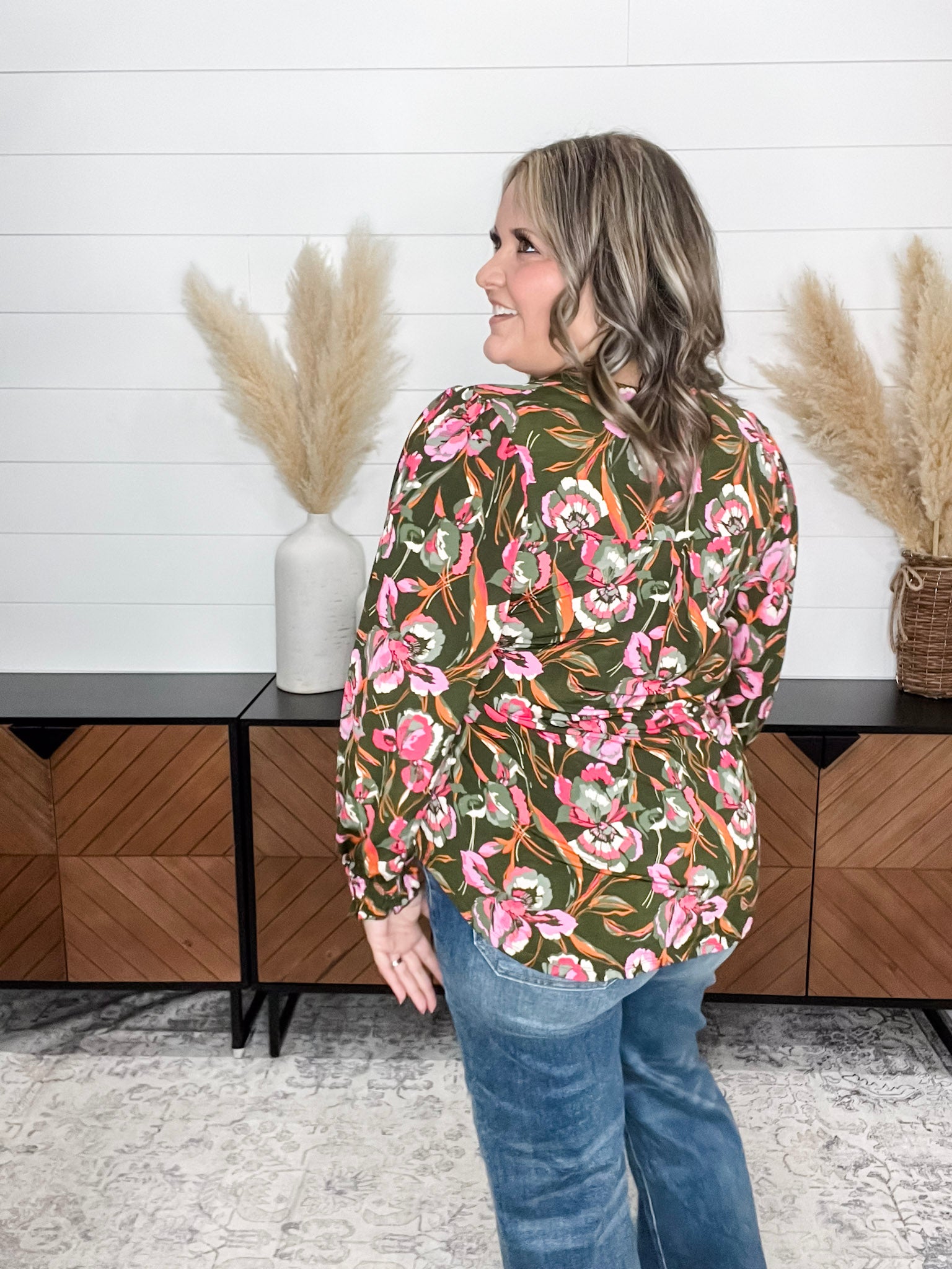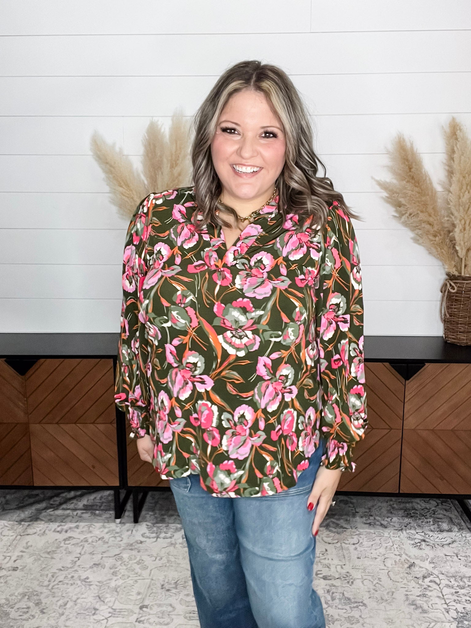 Embrace playful charm with the "Zinc" Smocked Wrist Long Sleeve Split Neck top. Featuring a slinky, stretchy fabric in a rich Dark Olive base, its bold floral pattern adds a fresh pop of color. Designed to fit snugly, we recommend sizing down one for the perfect silhouette that moves with you. The smocked wrists and split neck give it a flirty, easygoing vibe, making it a standout piece for any occasion.